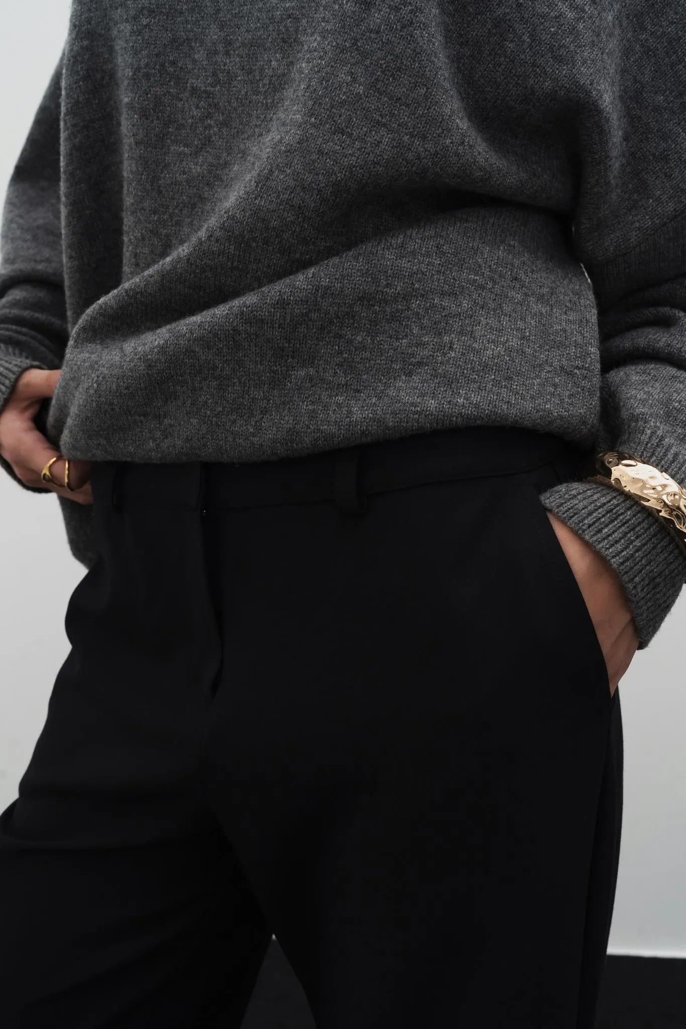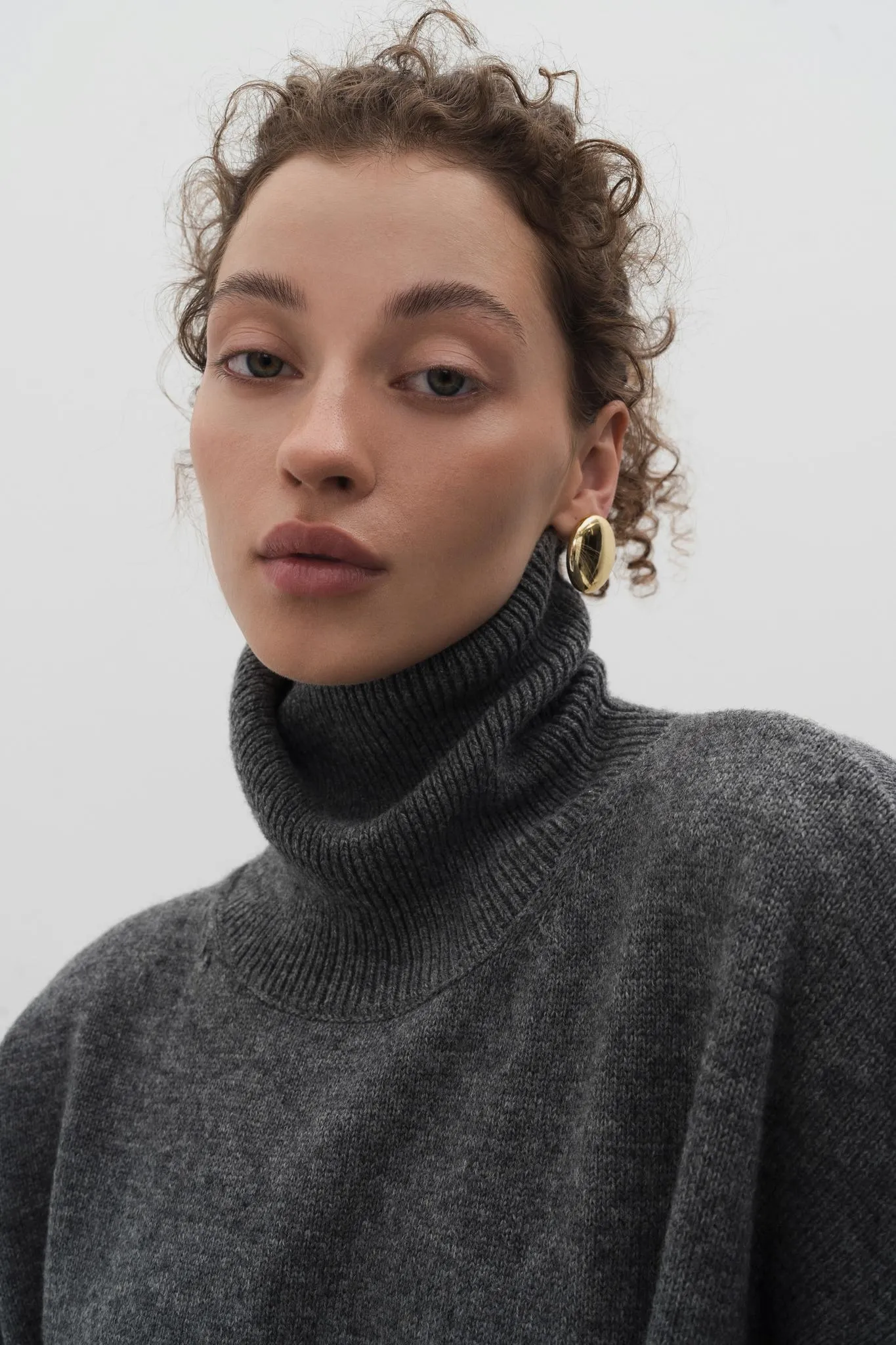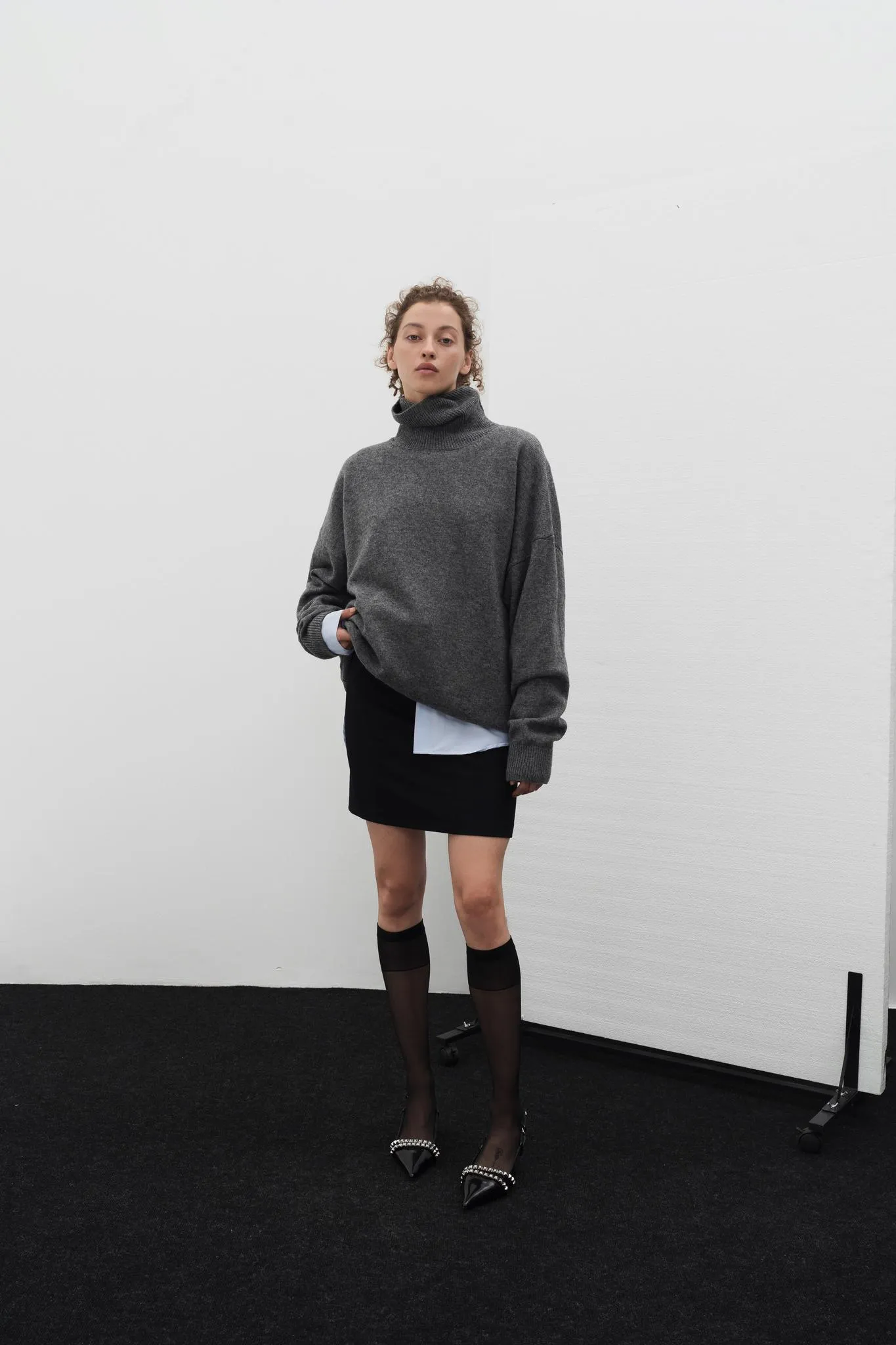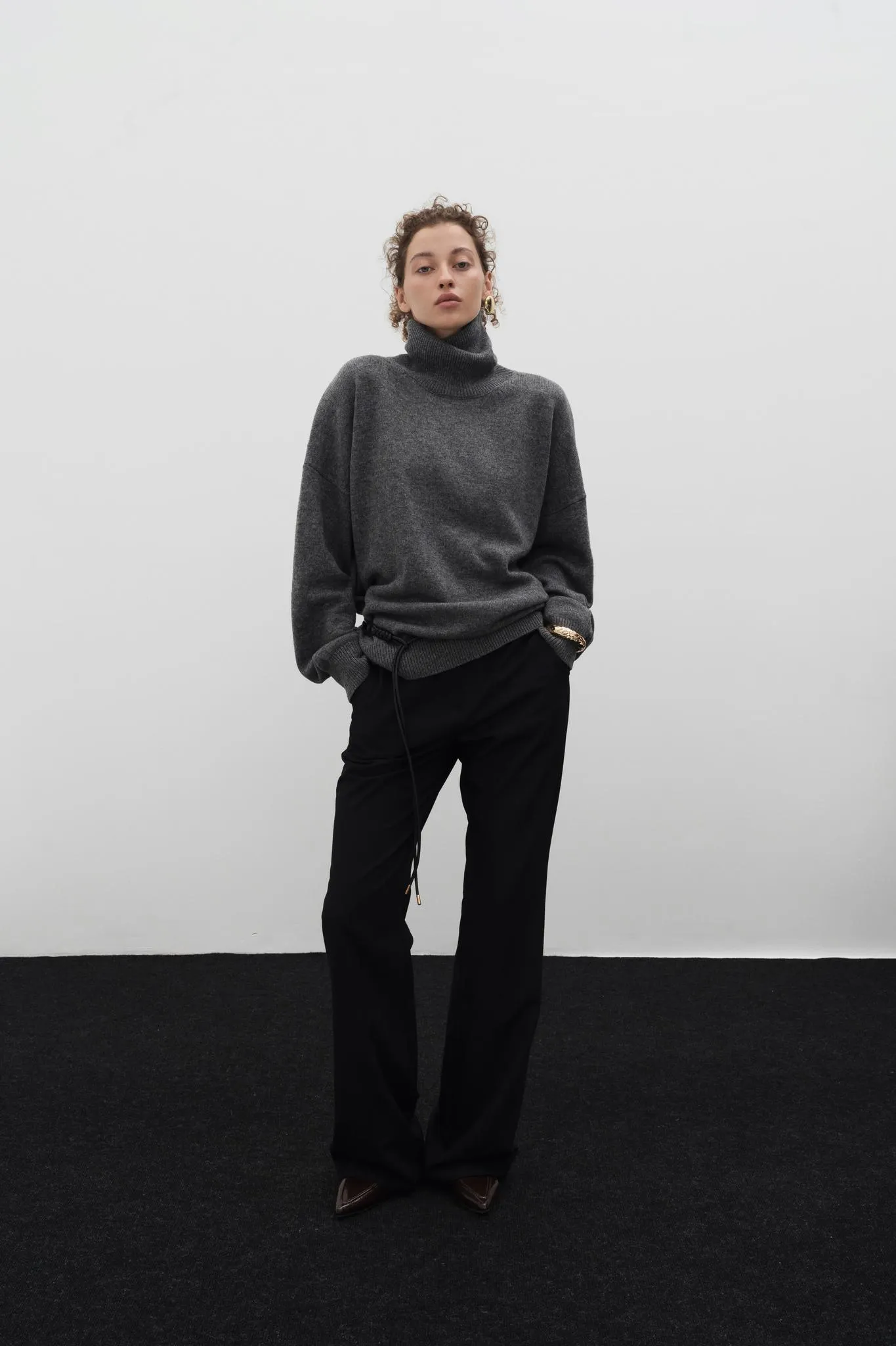 Базовый свитер с высоким воротом, длинным рукавом с манжетами и спущенной линией плеч.