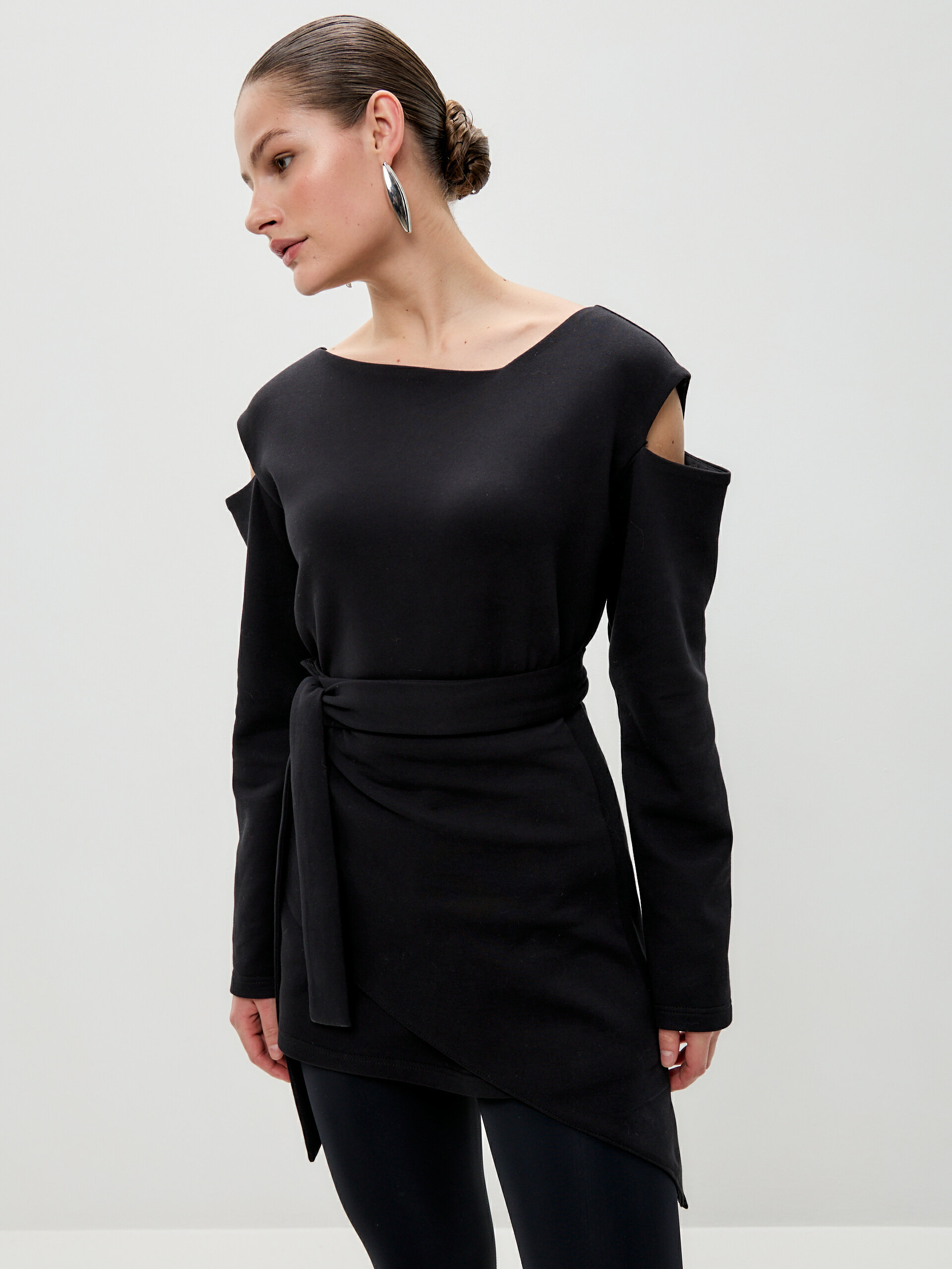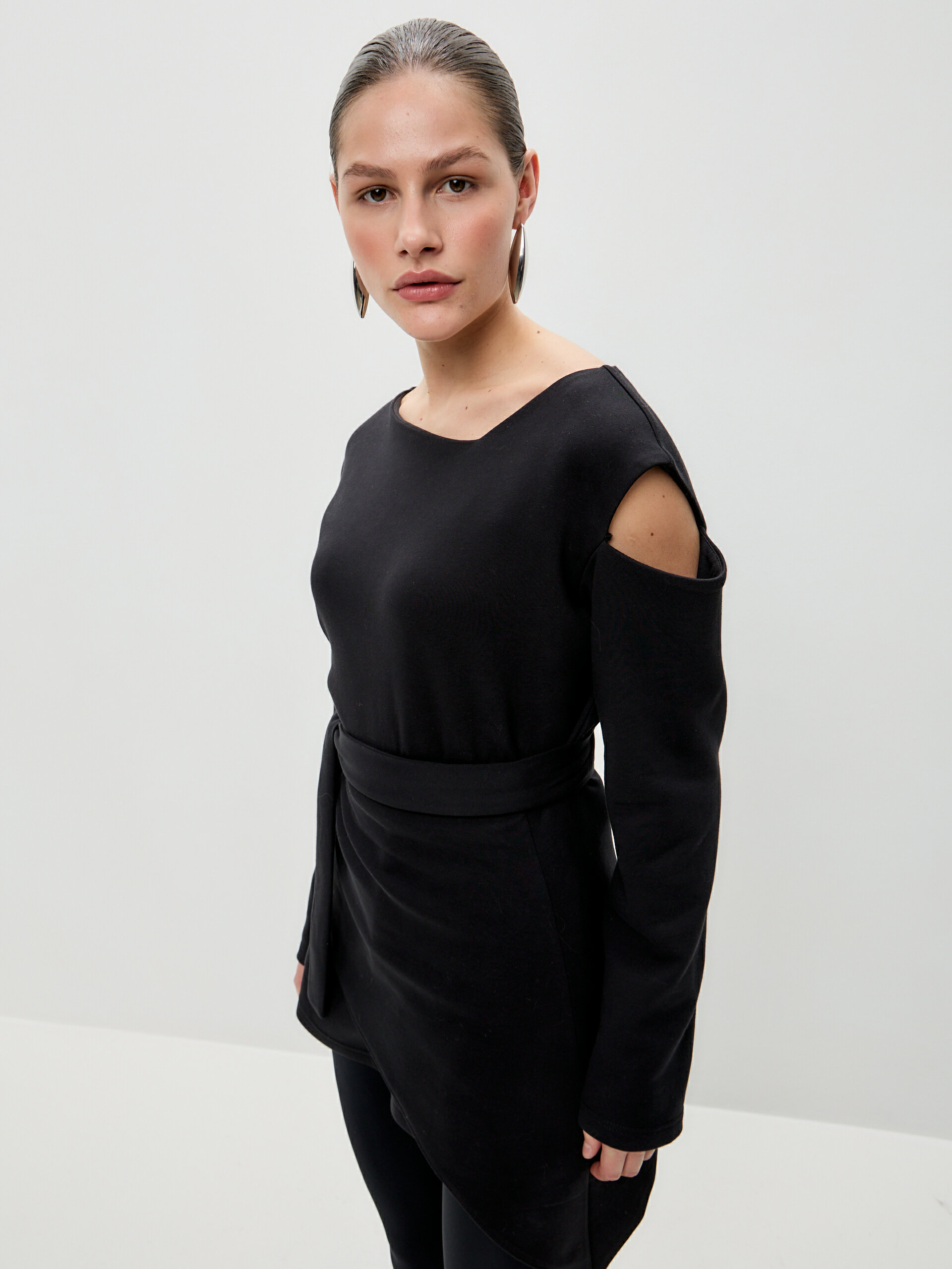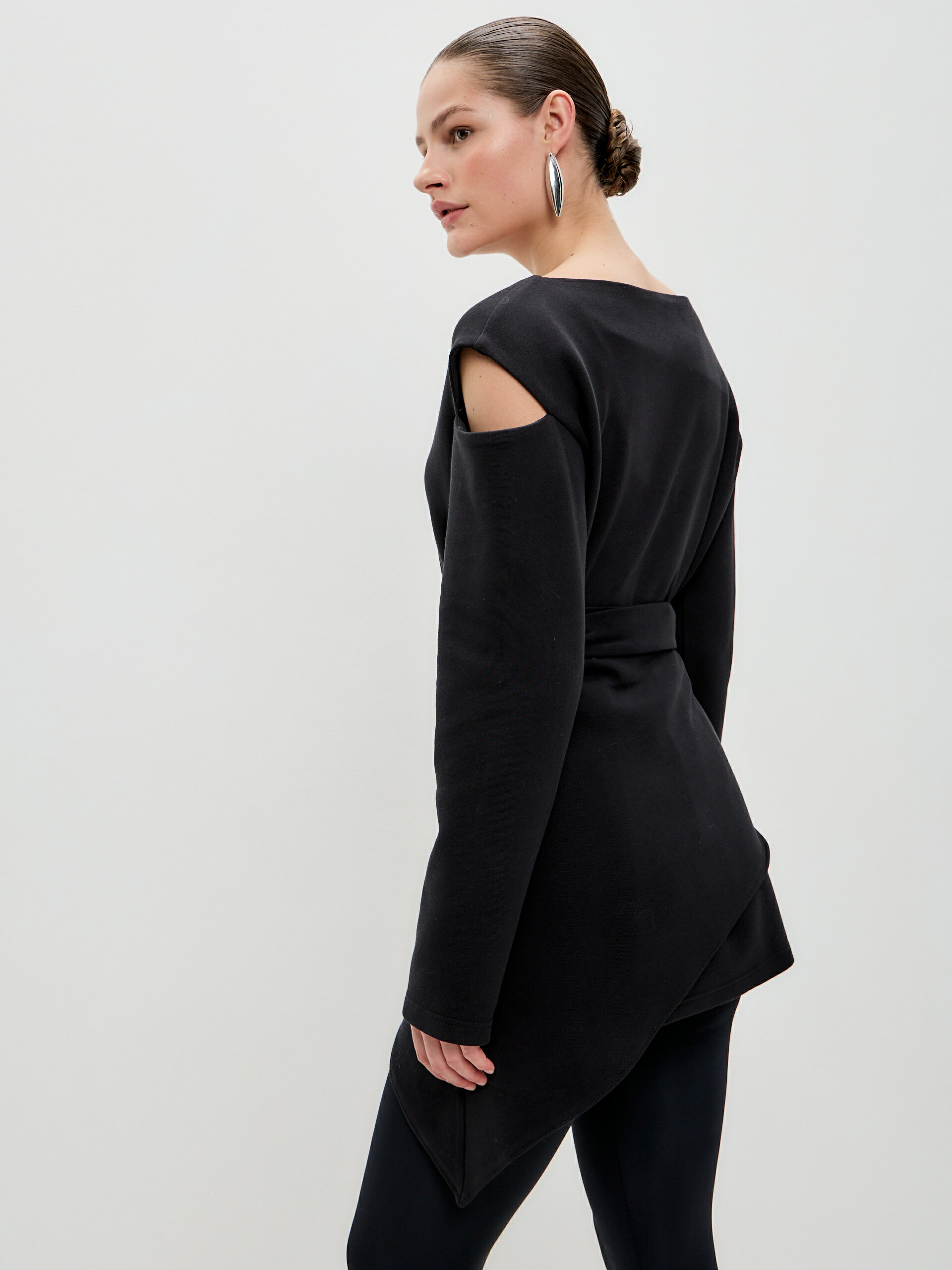 Свитшот с асимметричным верхом и разрезами из скубы с баской в комплекте. Скуба — очень комфортная двусторонняя дышащая ткань на 80% состоит из хлопка и отлично держит форму