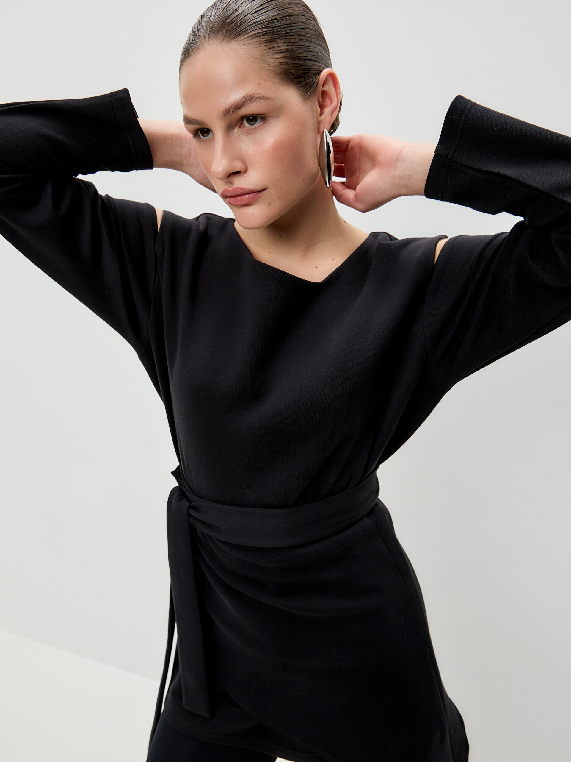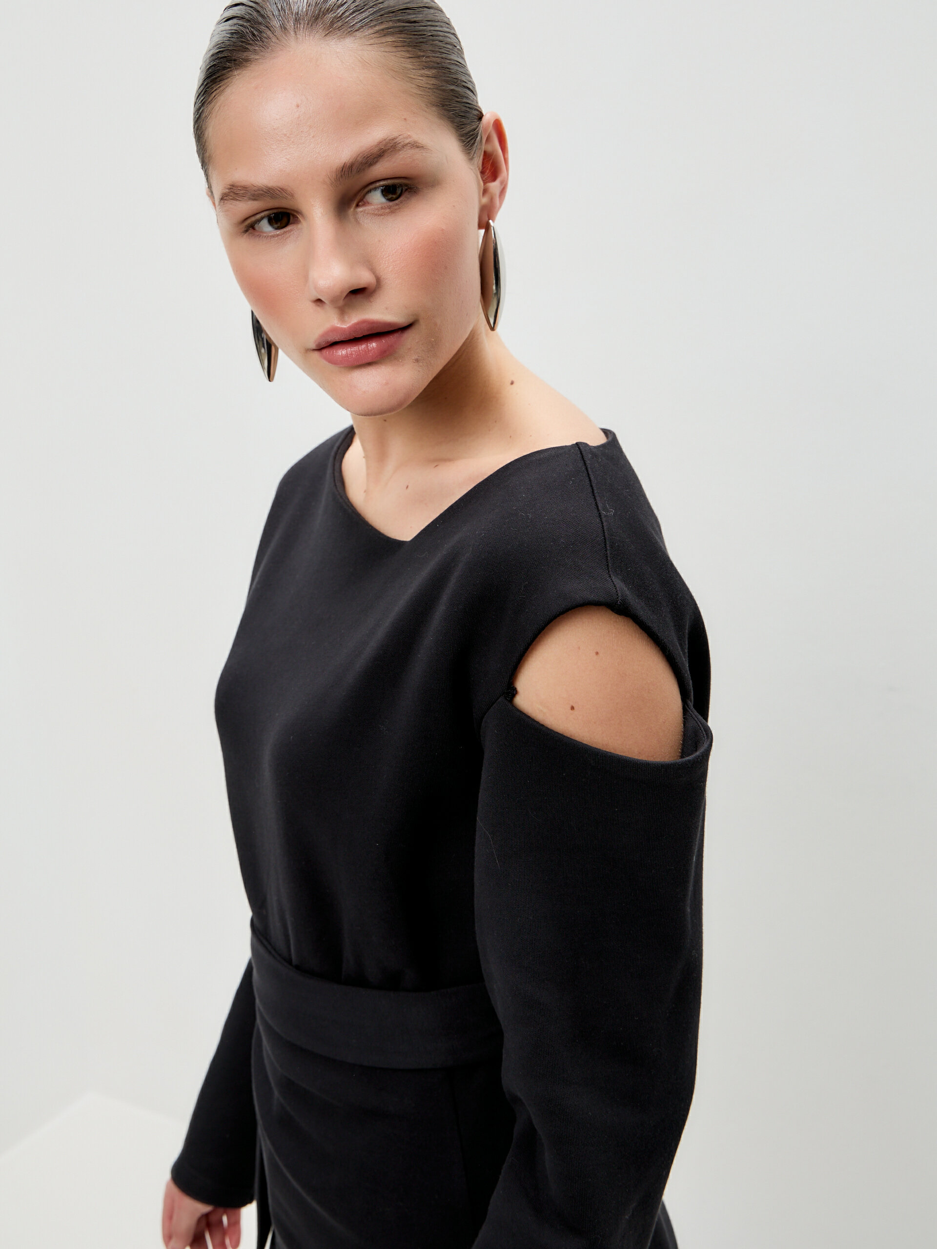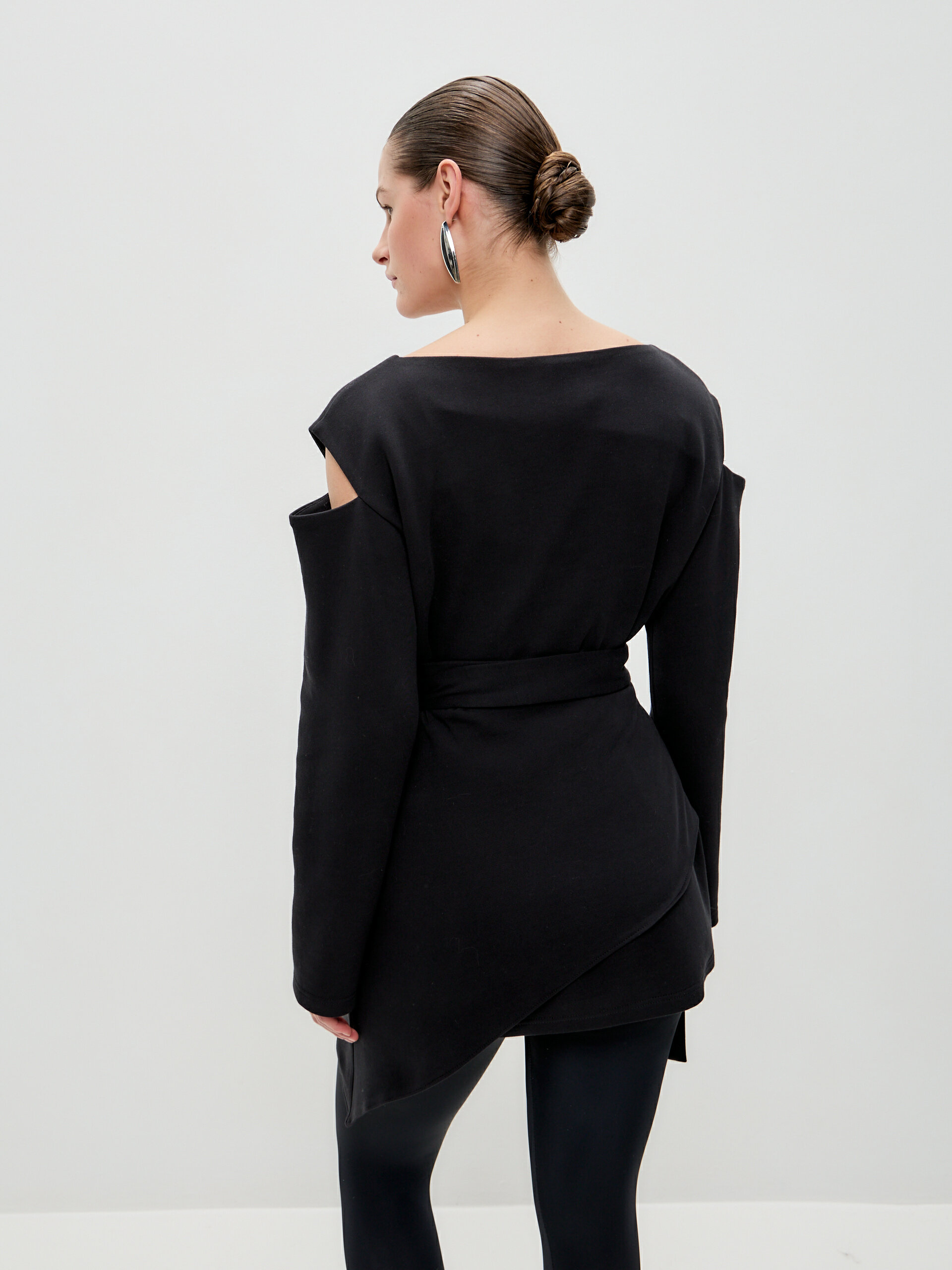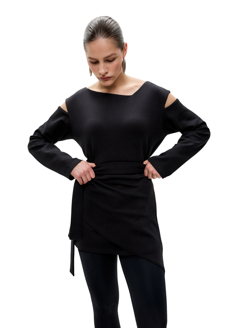 Свитшот с асимметричным верхом и разрезами из скубы с баской в комплекте. Скуба — очень комфортная двусторонняя дышащая ткань на 80% состоит из хлопка и отлично держит форму