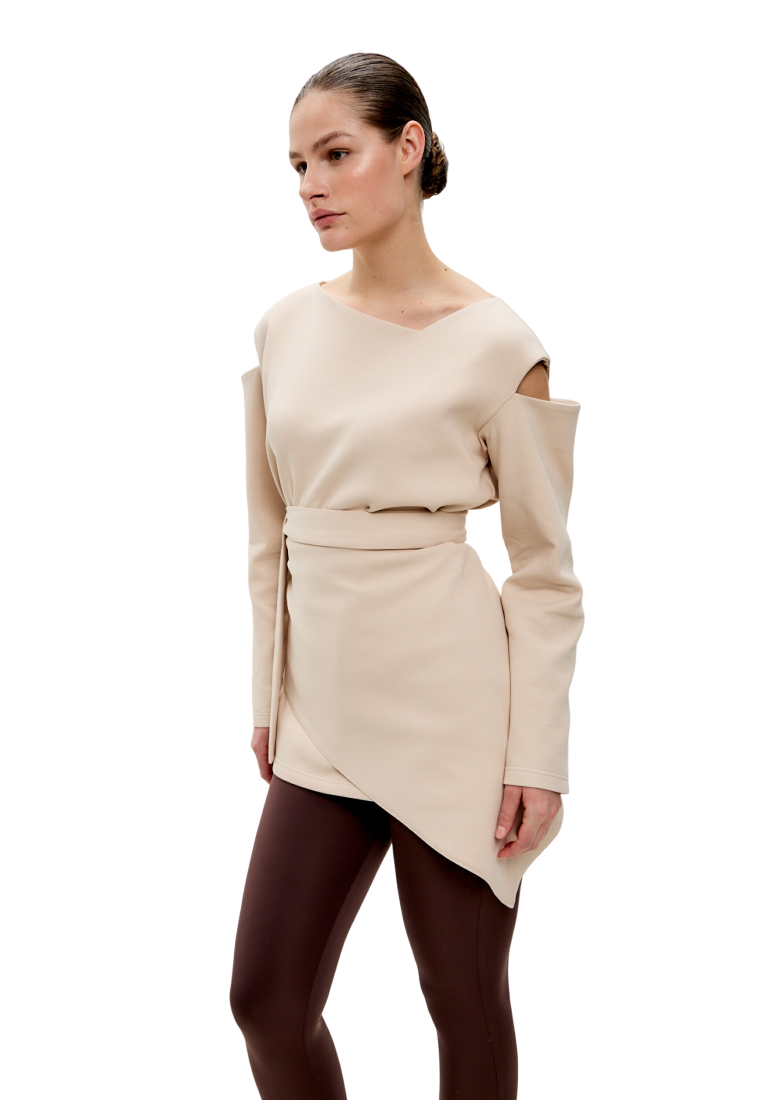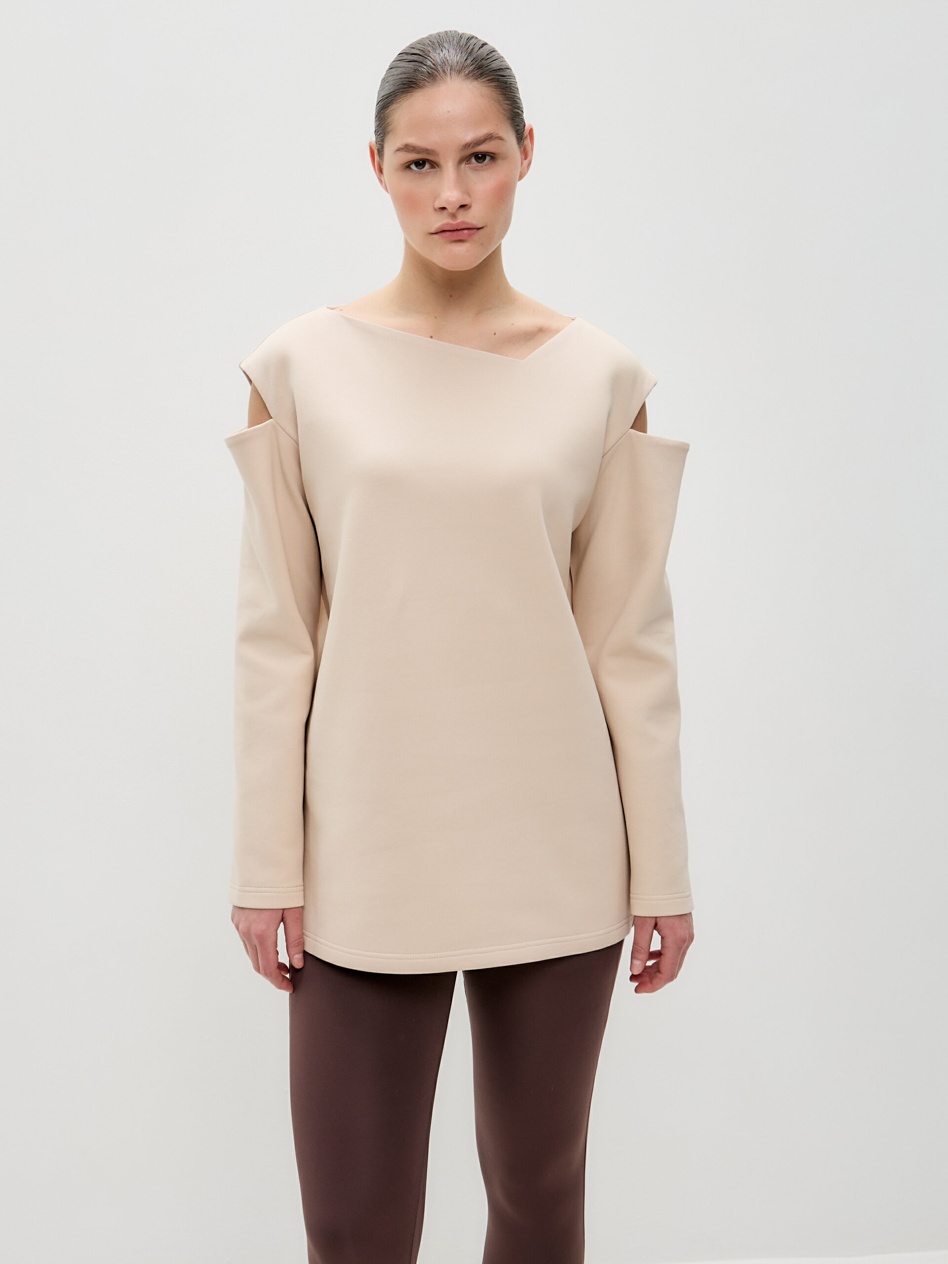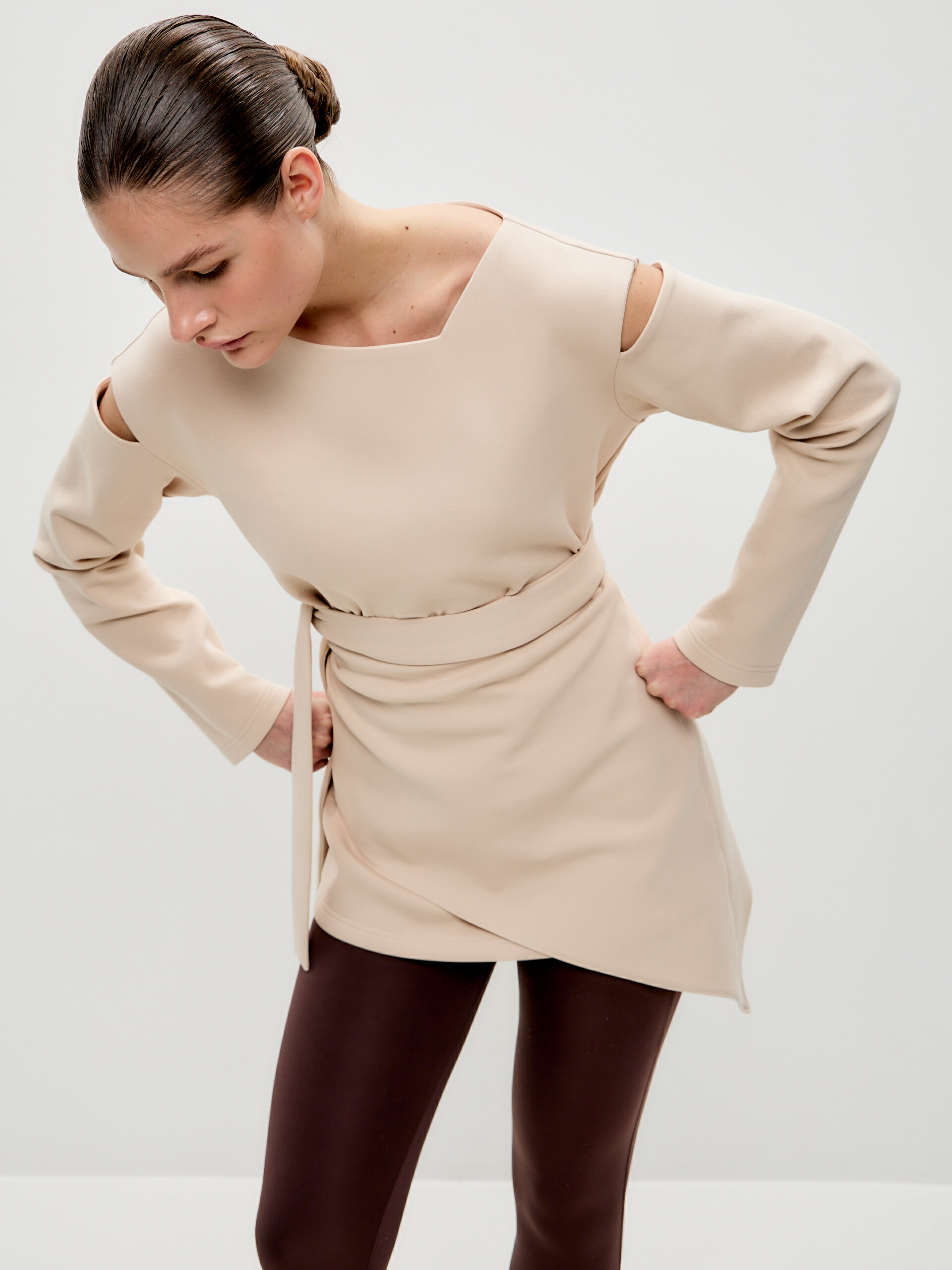 Свитшот с асимметричным верхом и разрезами из скубы с баской в комплекте. Скуба — очень комфортная двусторонняя дышащая ткань на 80% состоит из хлопка и отлично держит форму