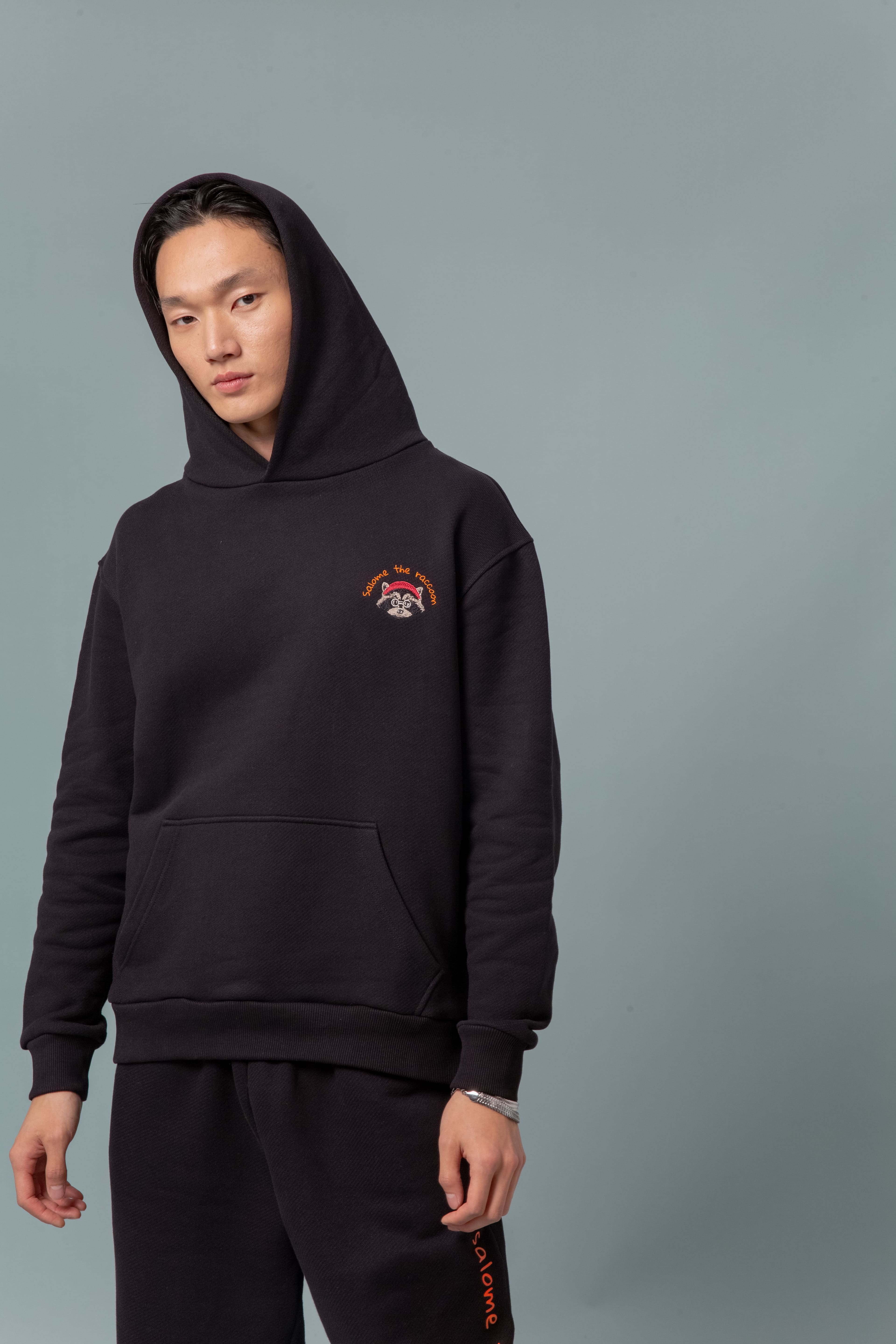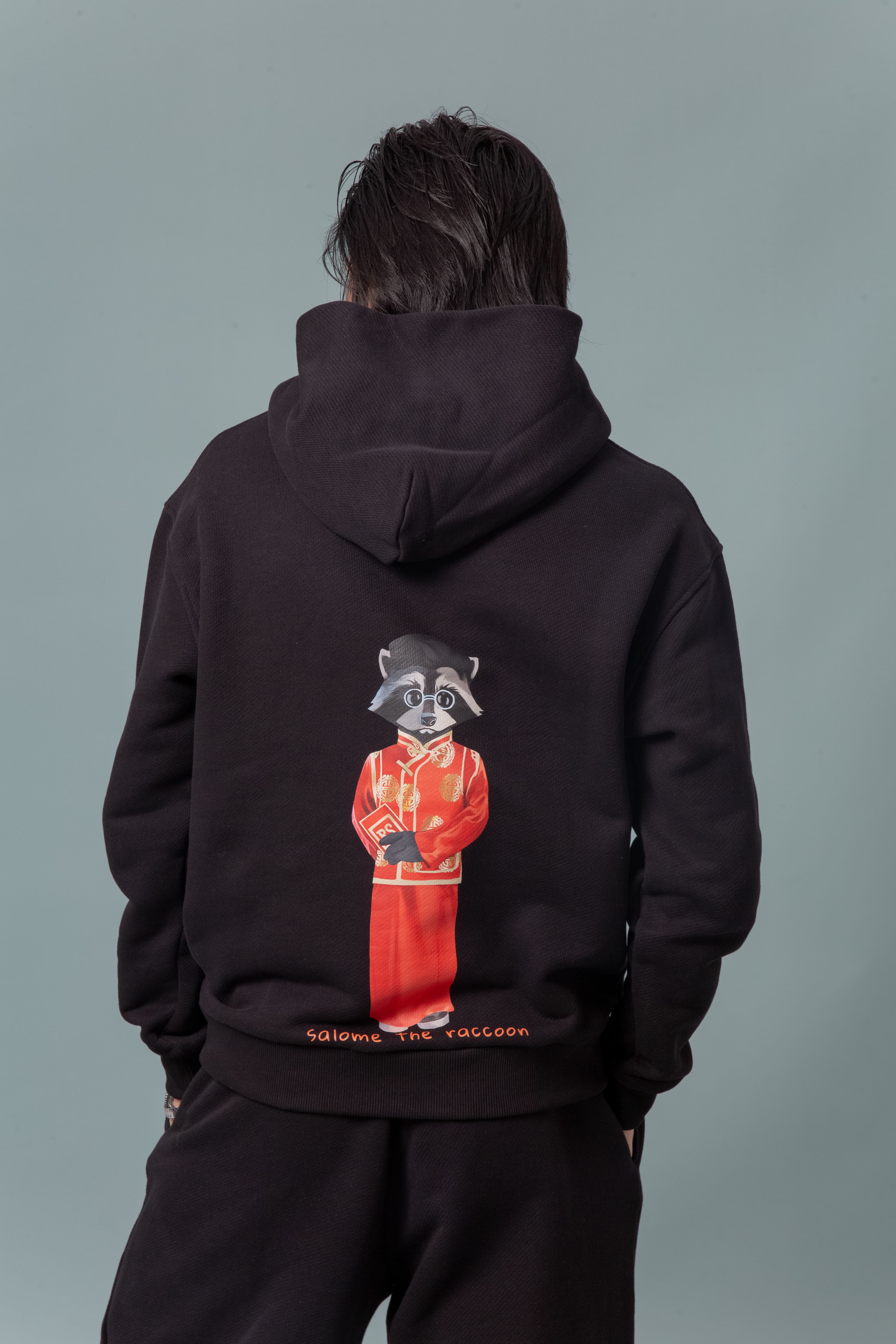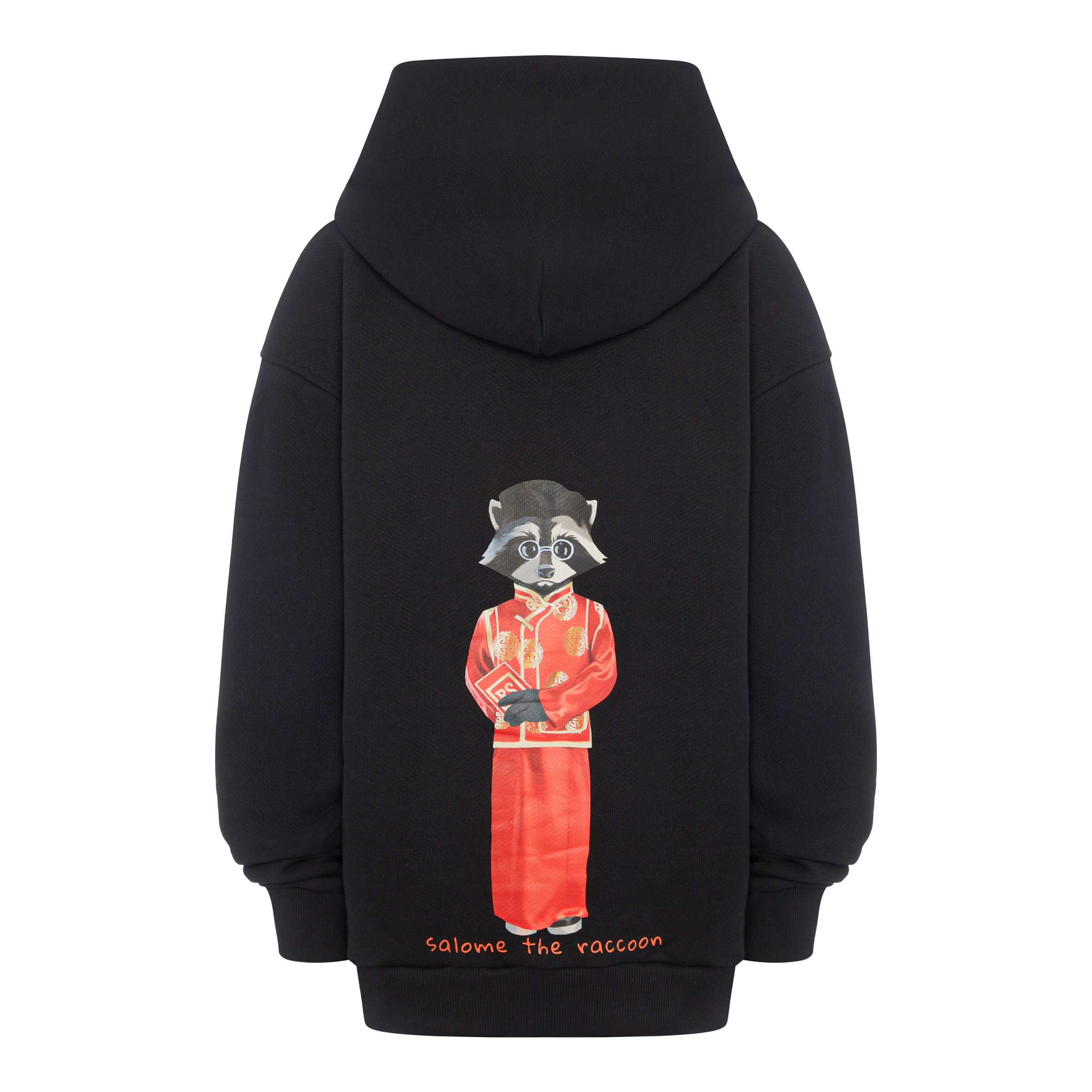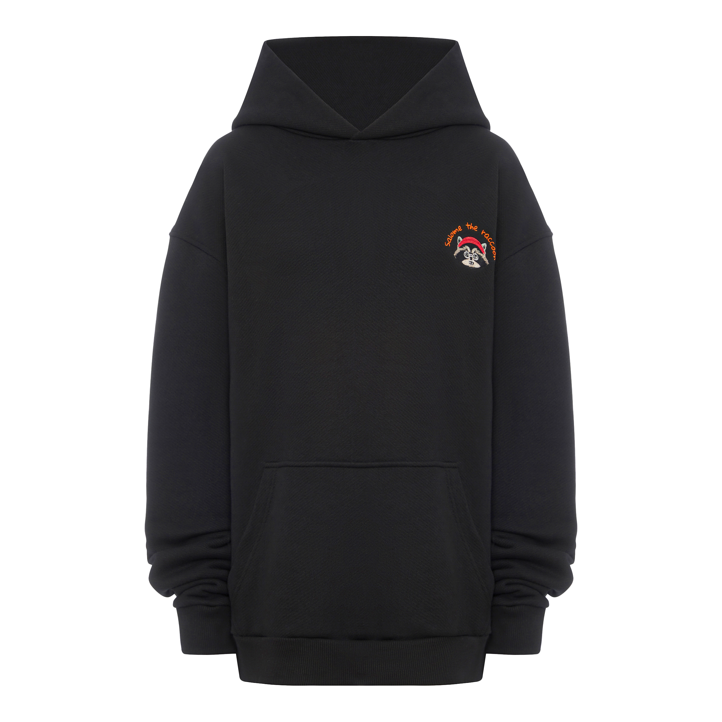 Худи oversize с капюшоном и карманом-кенгуру из премиального 100% хлопка-футера 3-х нитки европейского качества с логотипом на груди и арт-объектом бренда «Salome the raccoon» с изображением Salome в одном из традиционных национальных костюмов на спинке. По низу изделия и рукава худи обработан плотным кашкорсе.