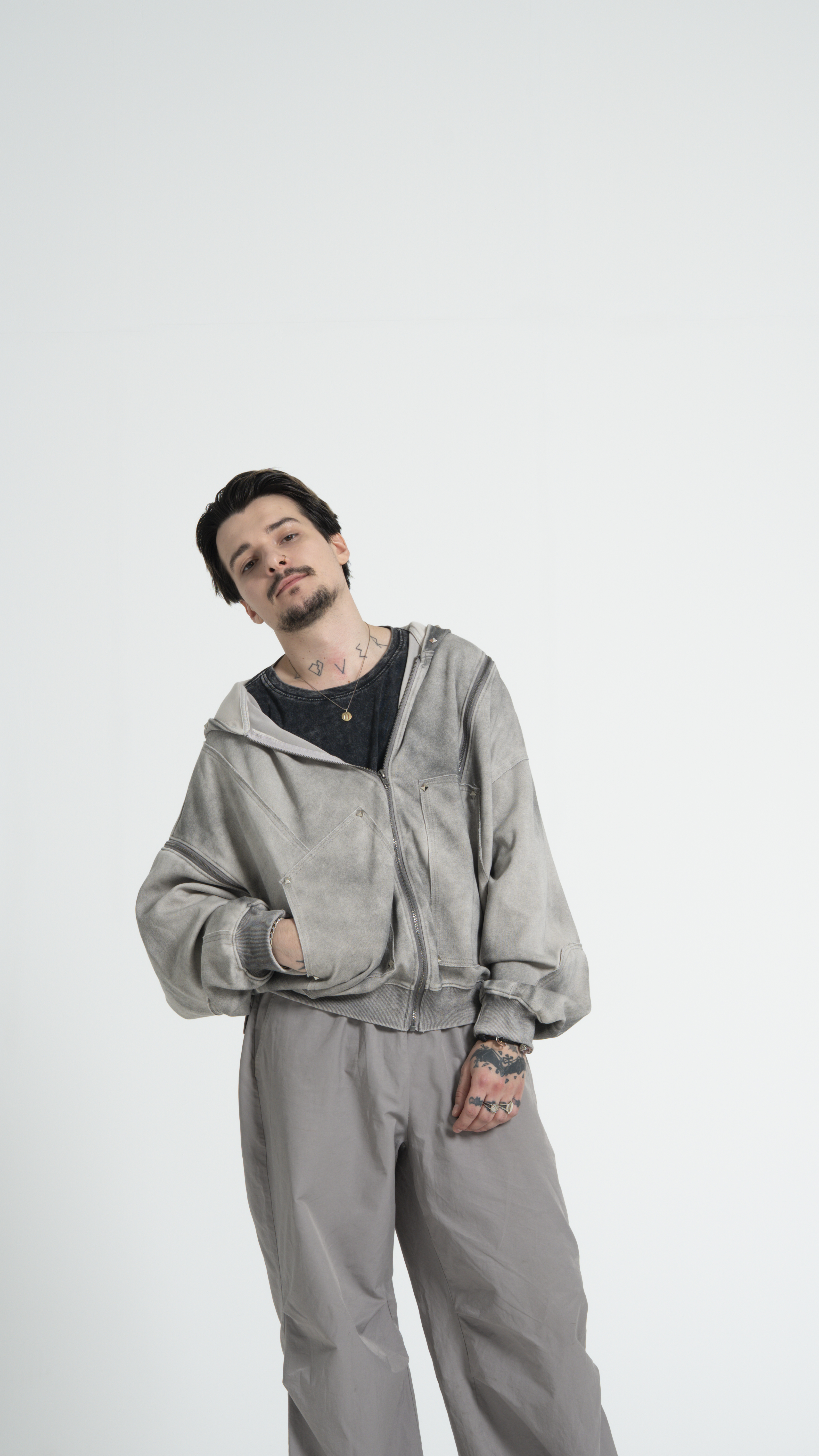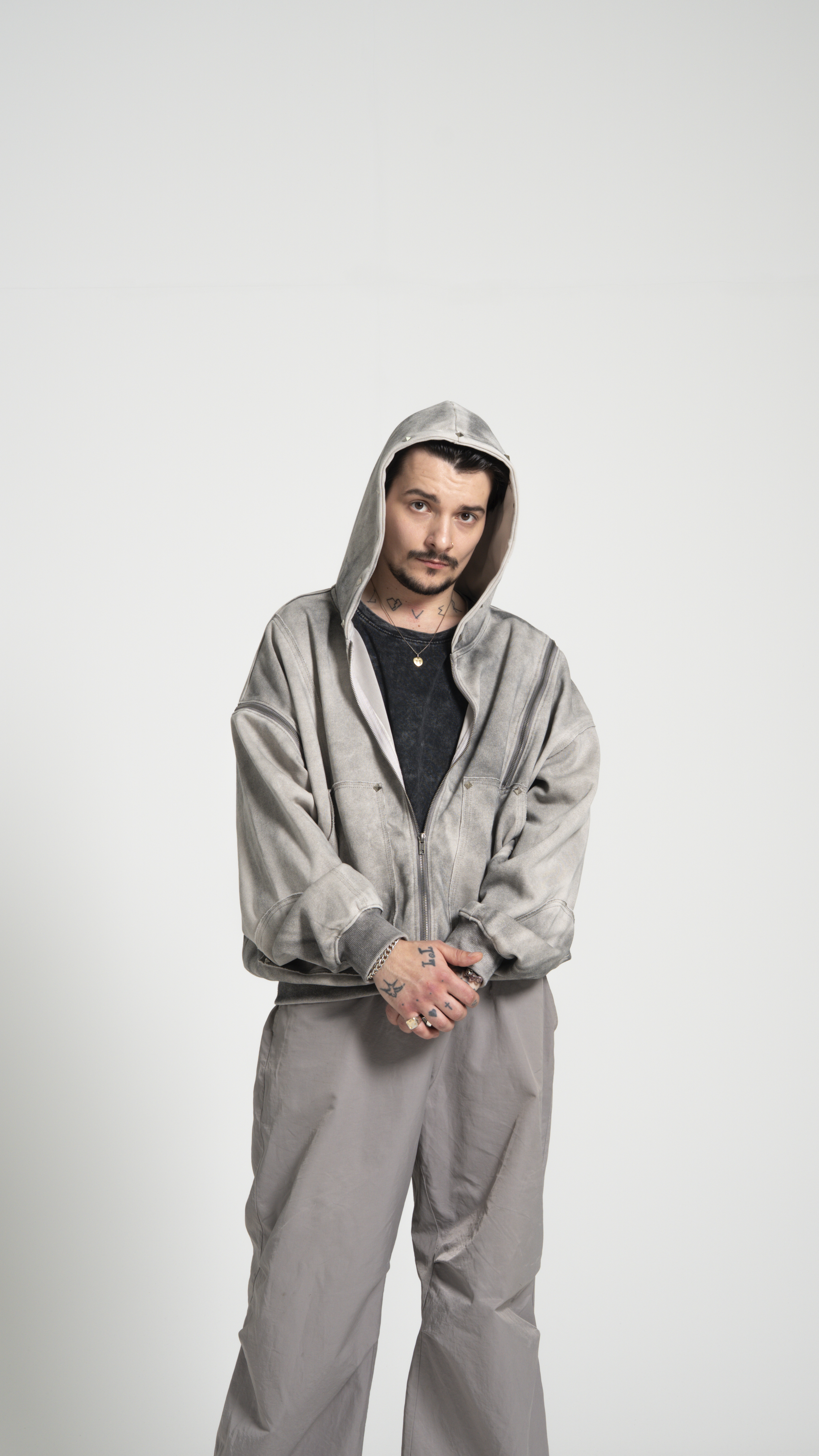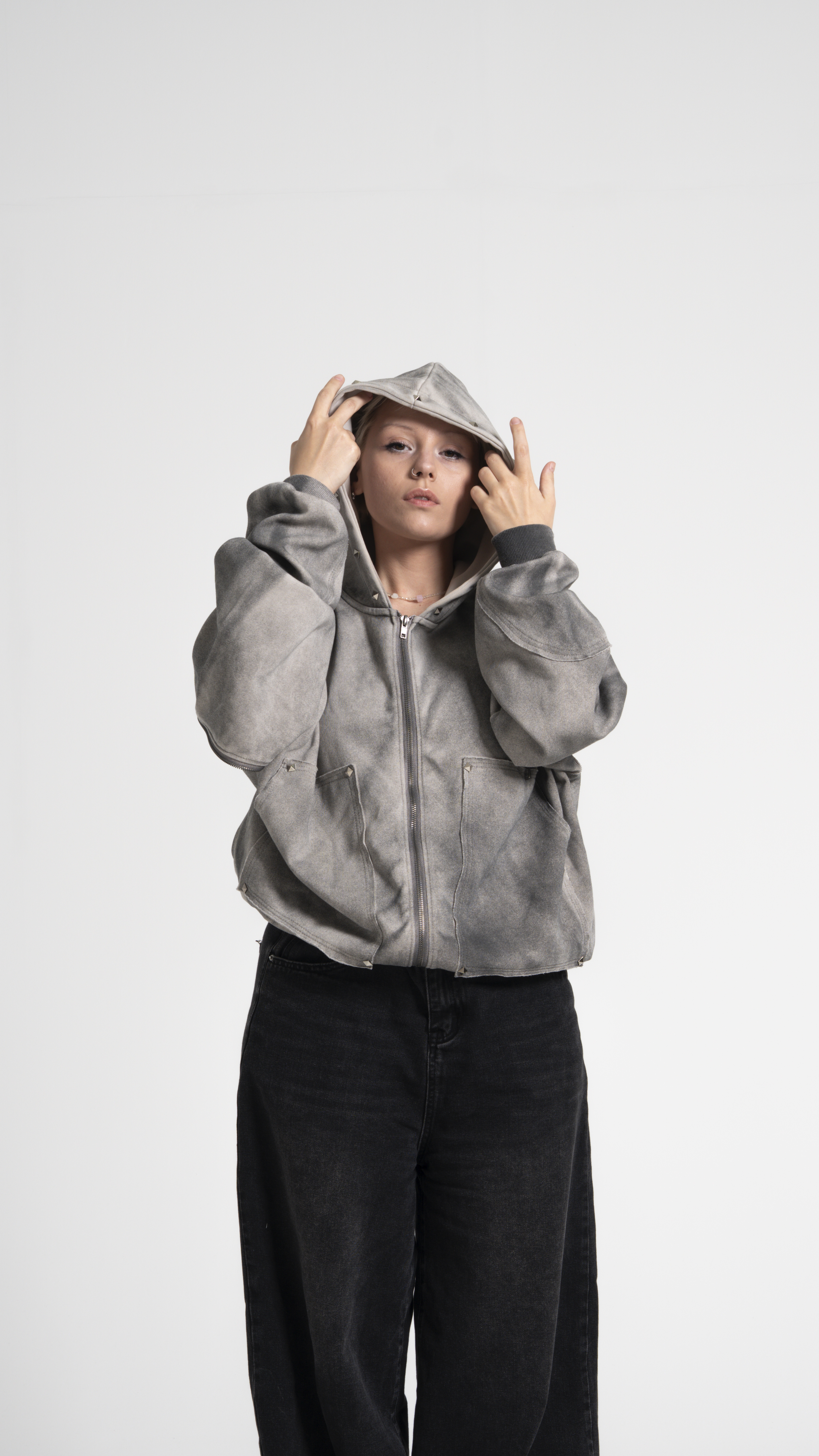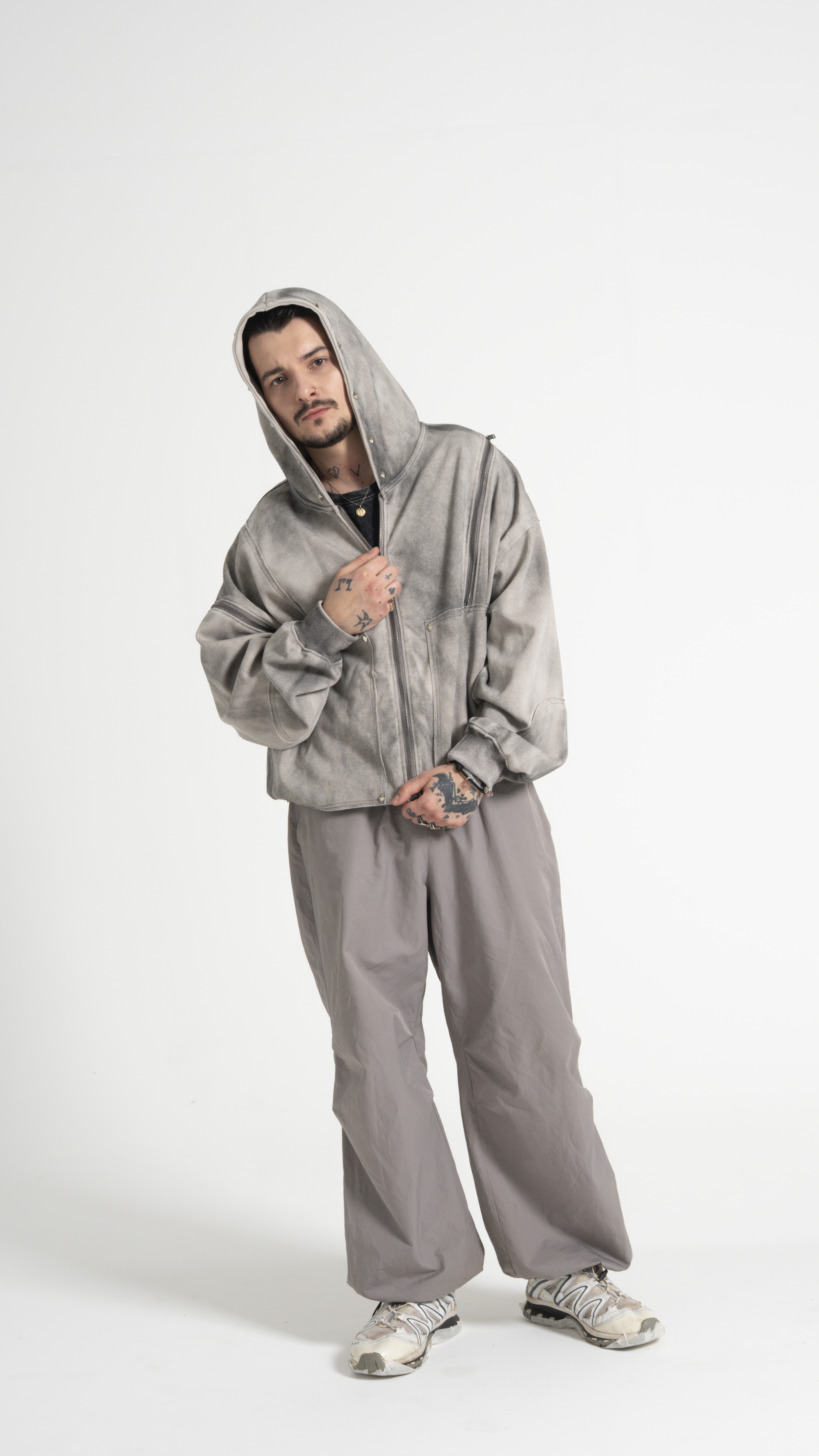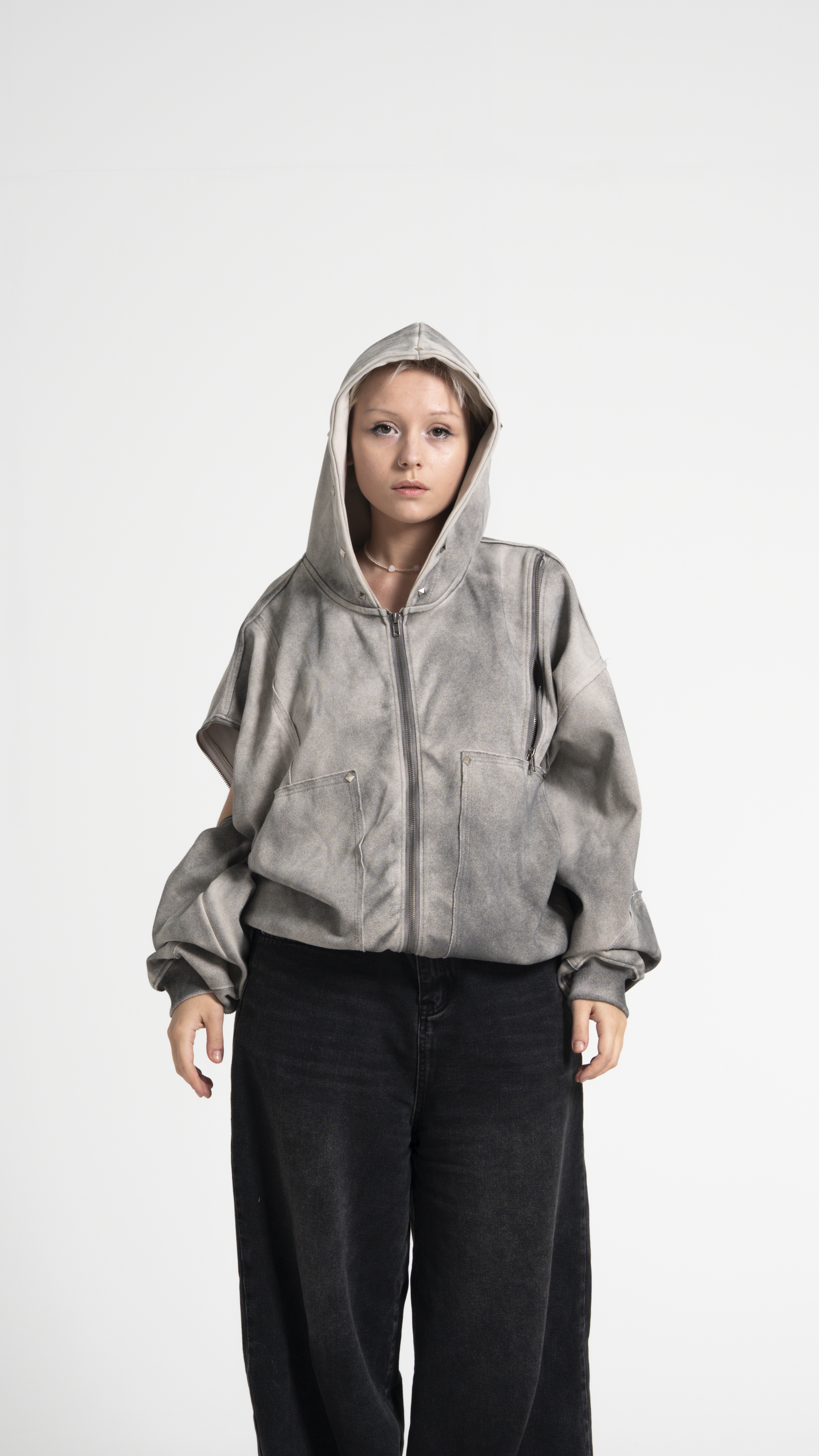 Худи TRANSFORMER DARK - настоящий артефакт с характером! За счет молний можно отстегнуть рукав на правой руке и приоткрыть левую руку. Потертая ткань и ромбы-заклепки подчеркивают уникальный вайб изделия!
