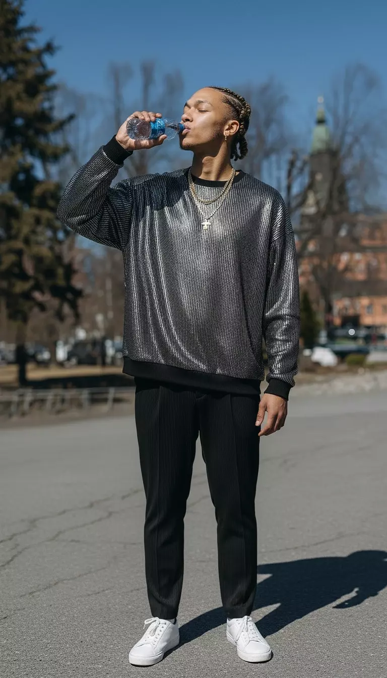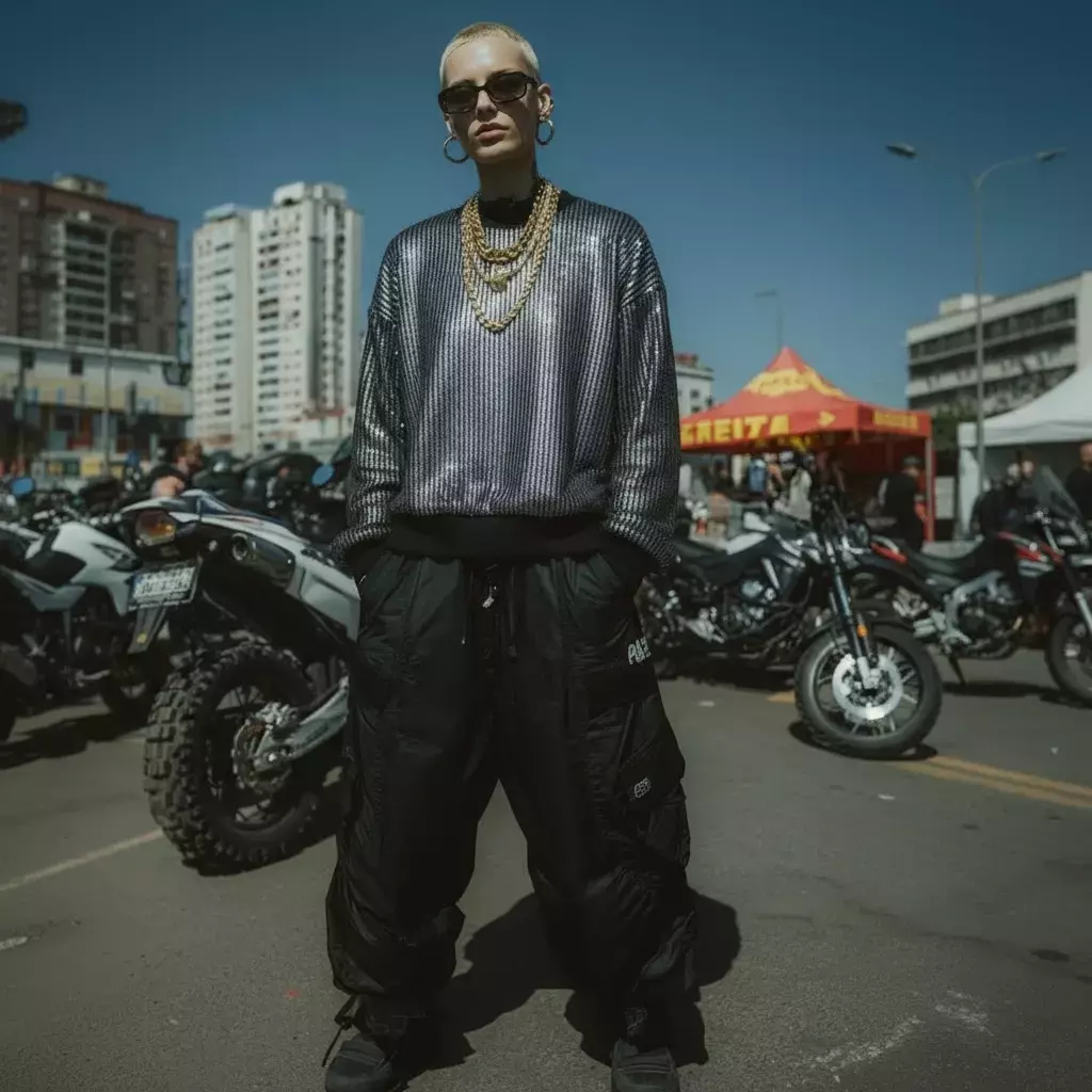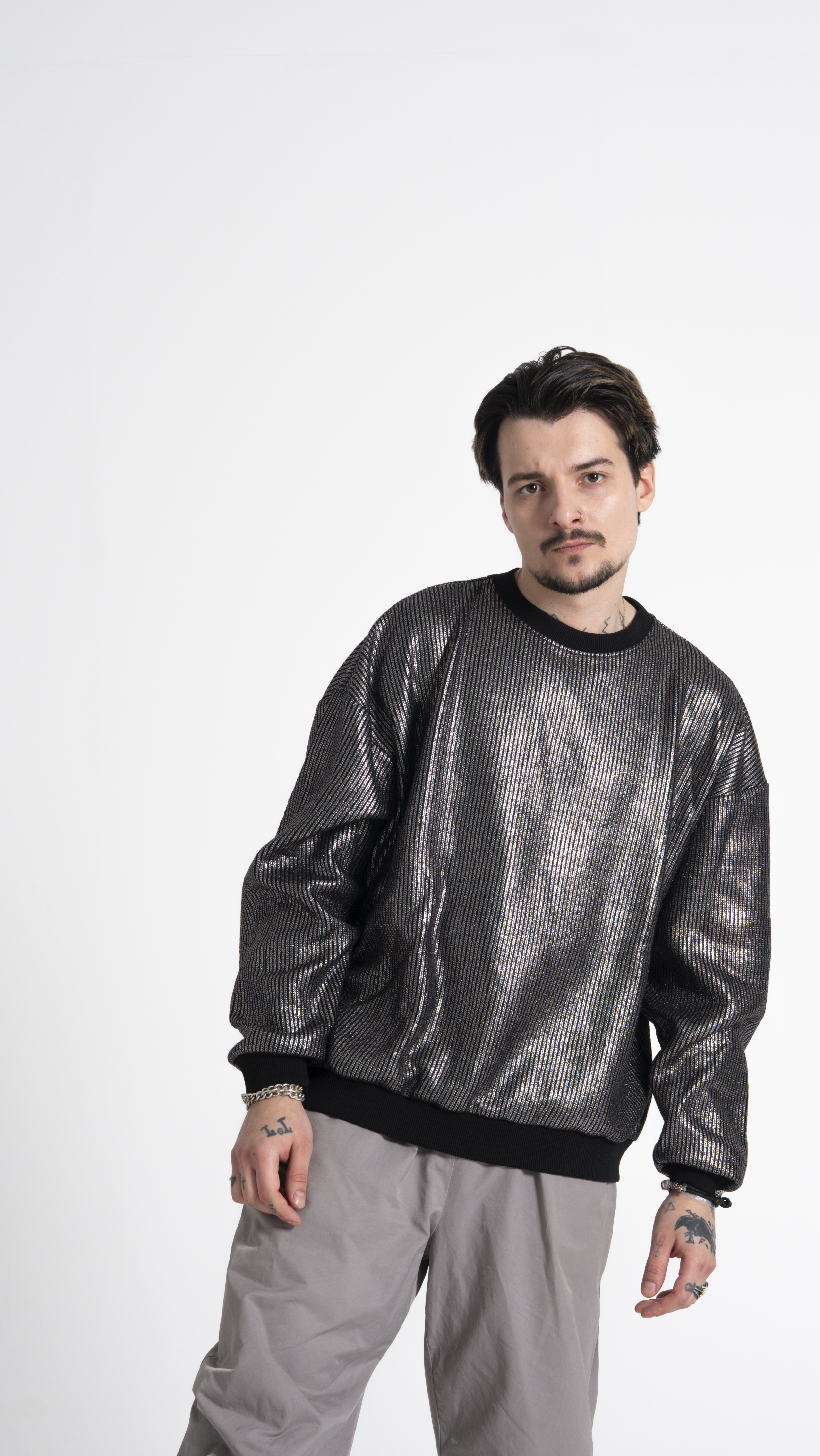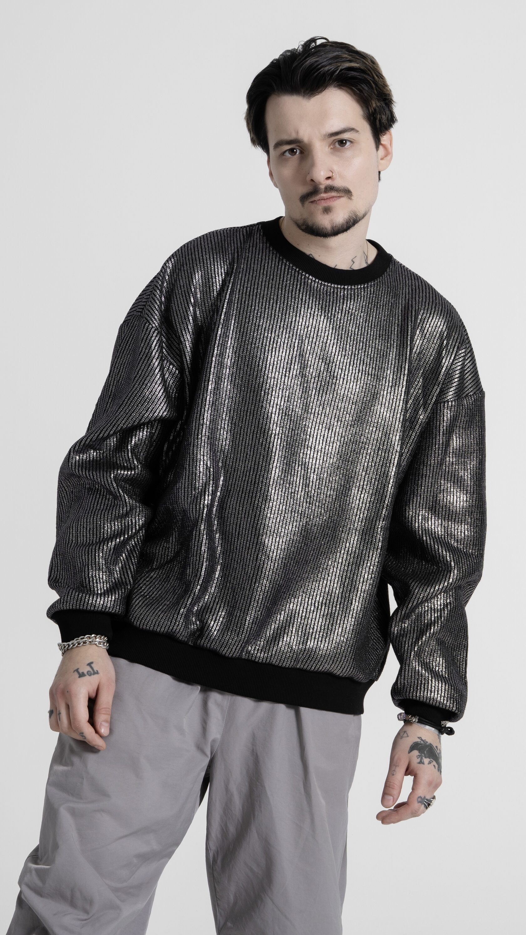 Свитшот выполнен из уникальной футуристичной ткани - фольгированного трикотажа. При движении цвет переливается