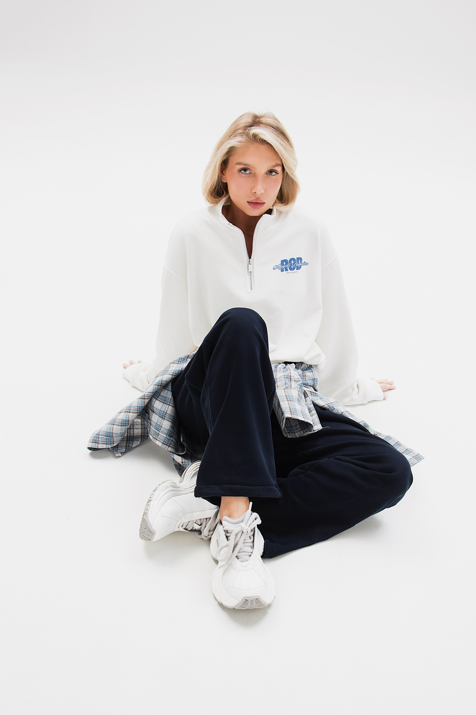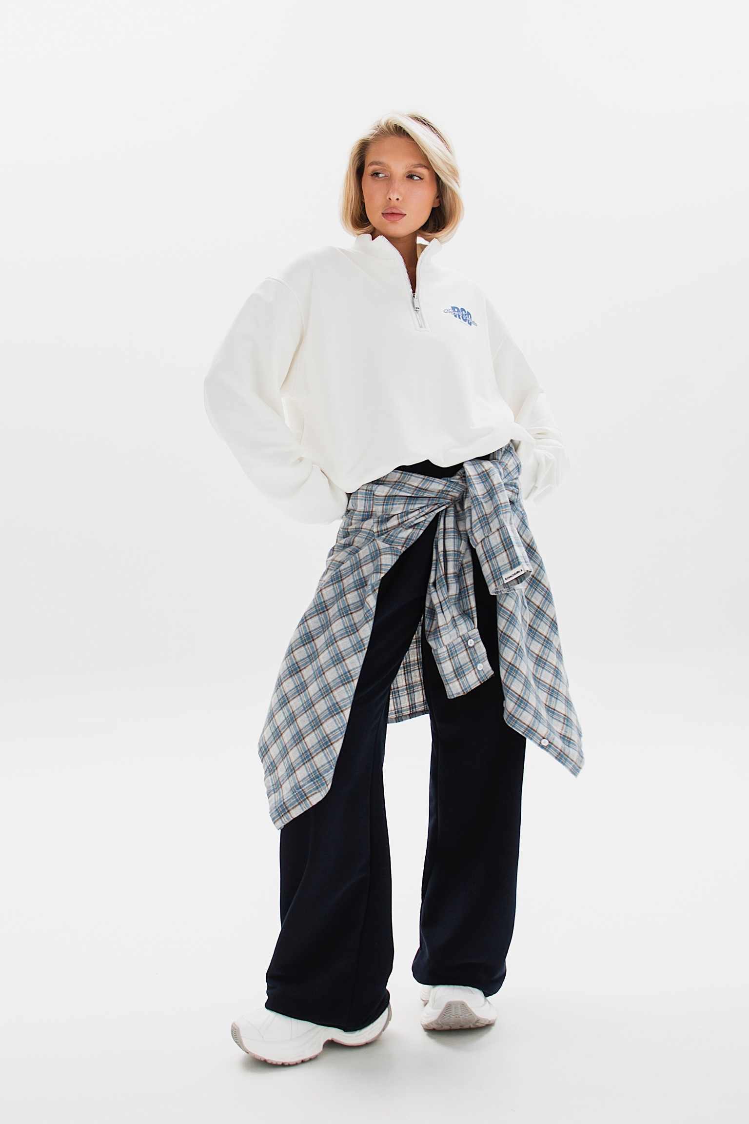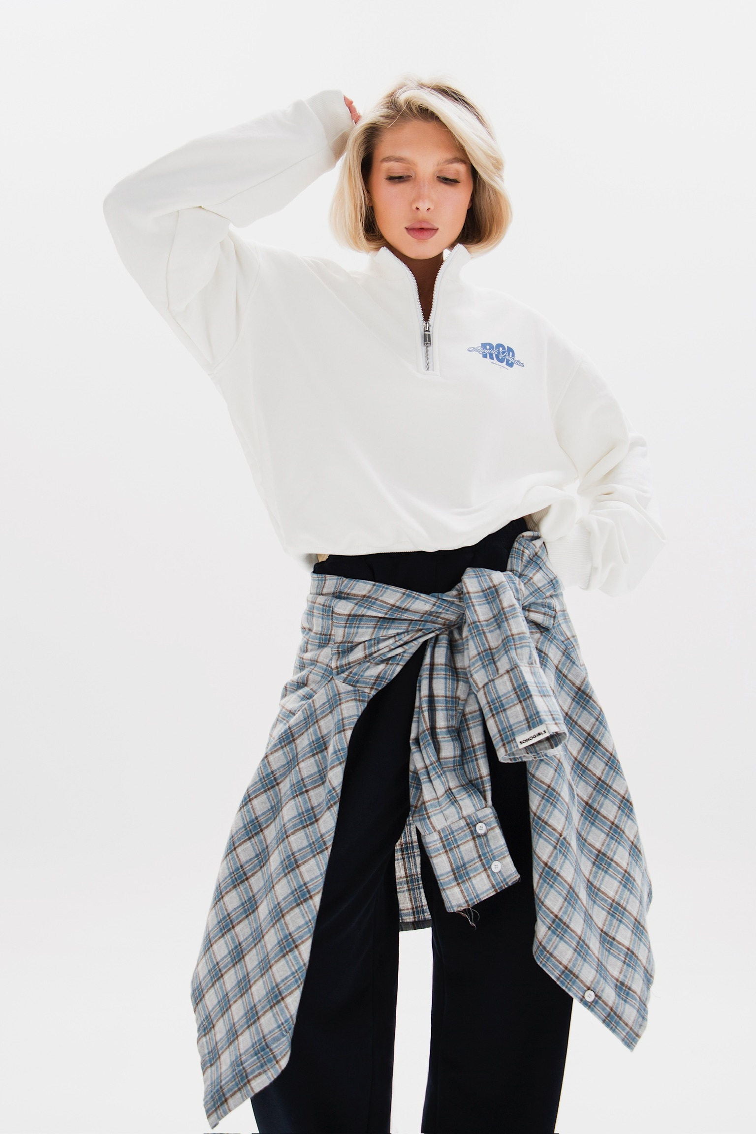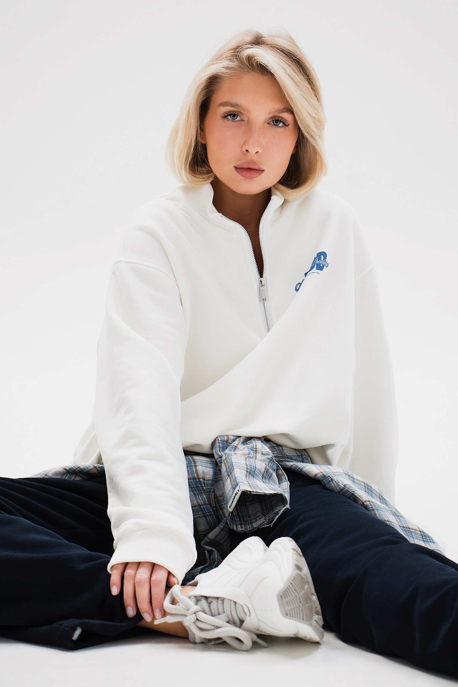 Свитшот свободного кроя выполнен из мягкой приятной ткани с принтом на груди и молнии.