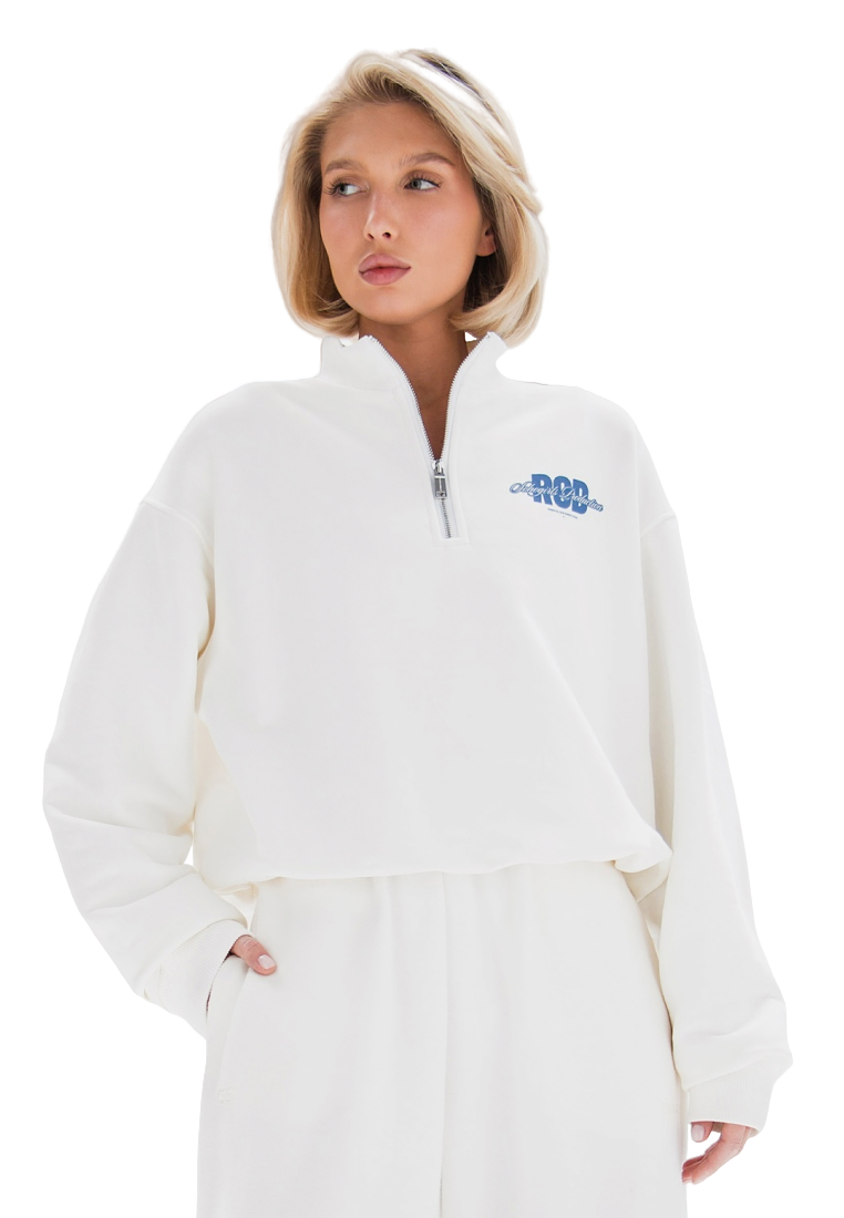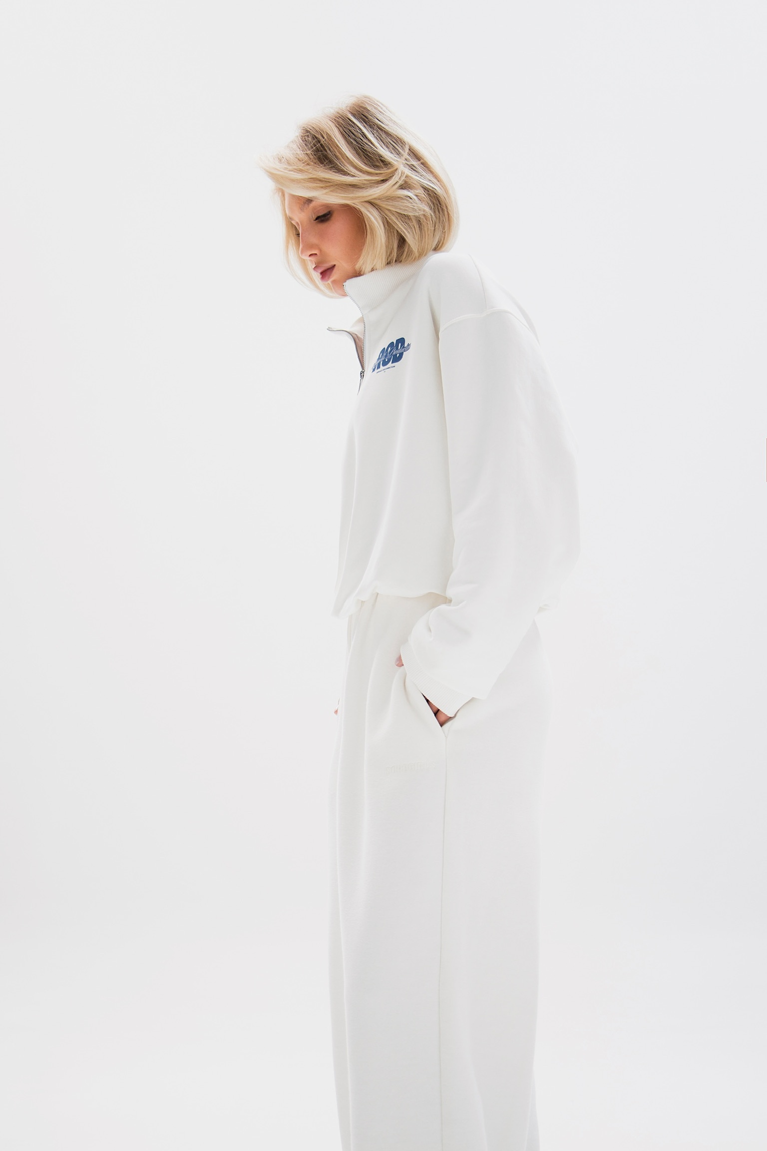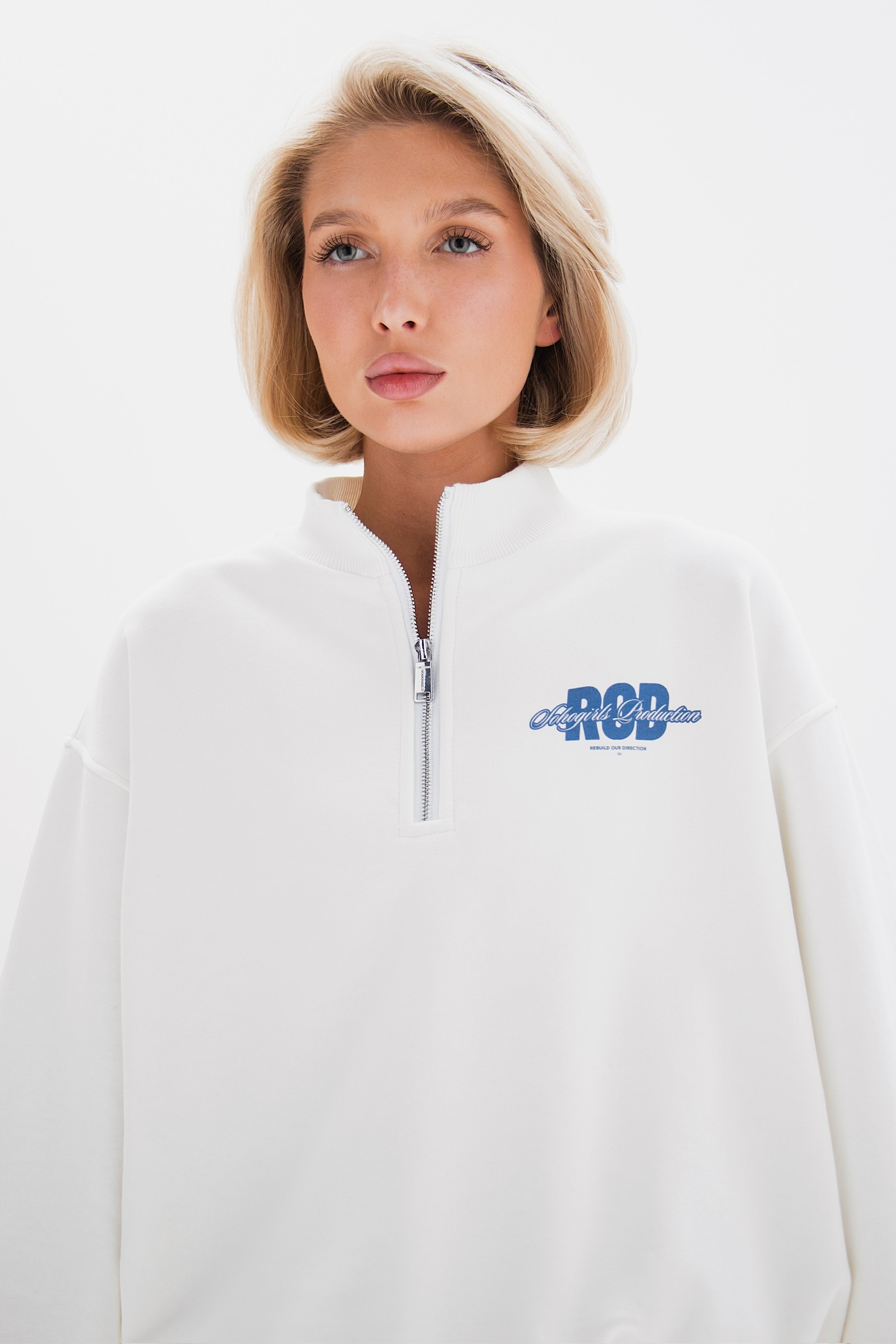 Свитшот свободного кроя выполнен из мягкой приятной ткани с принтом на груди и молнии.
