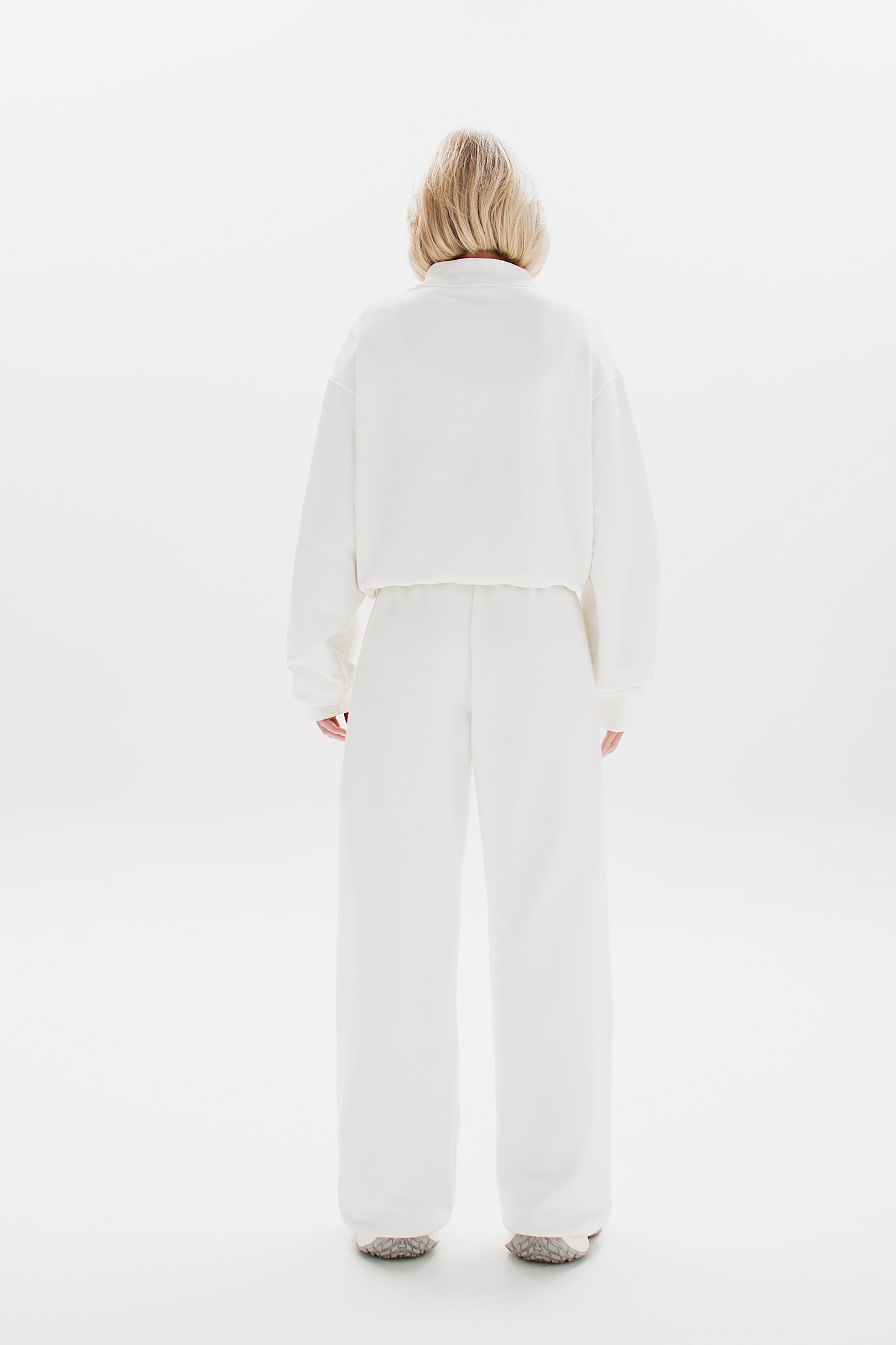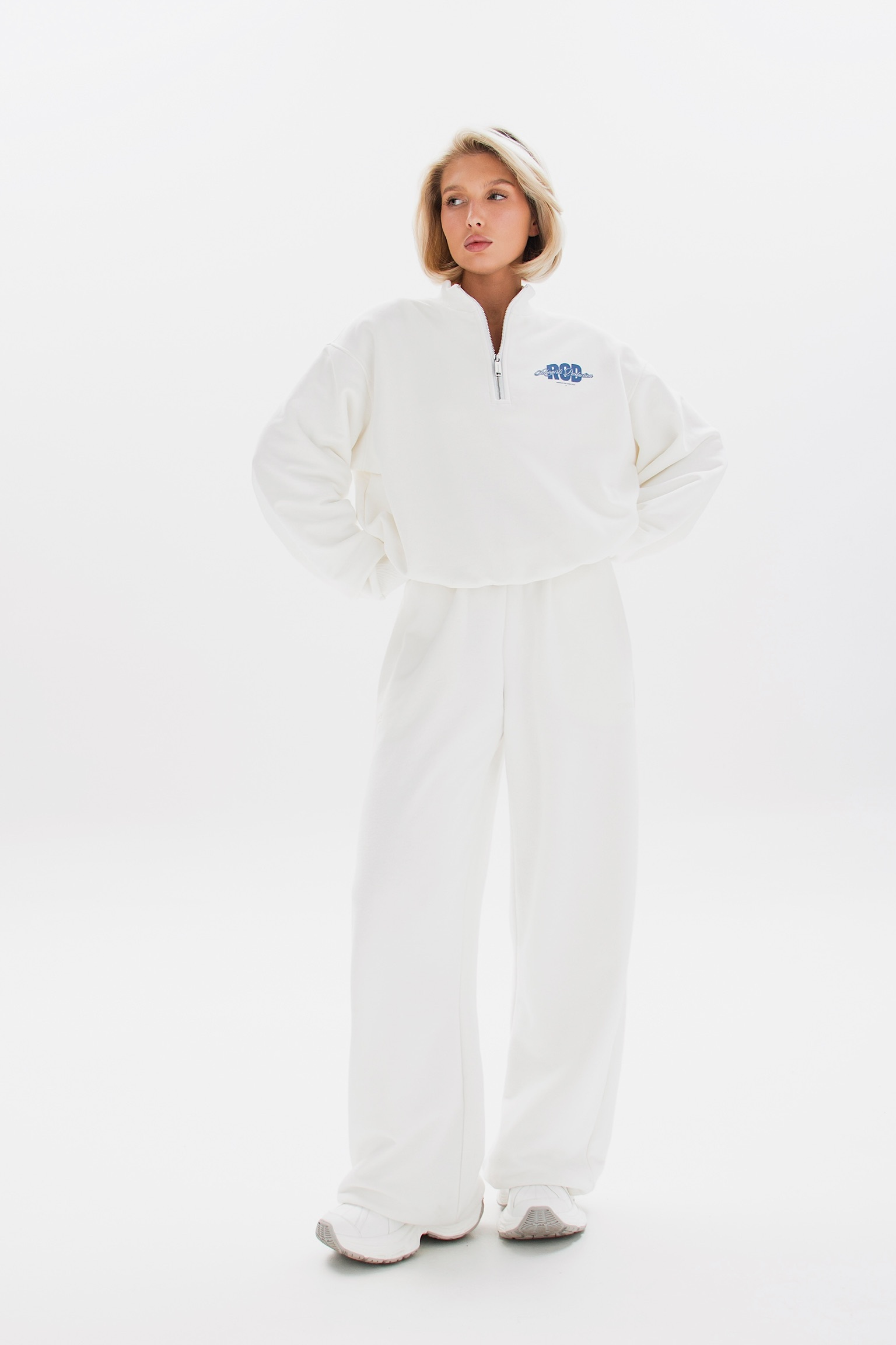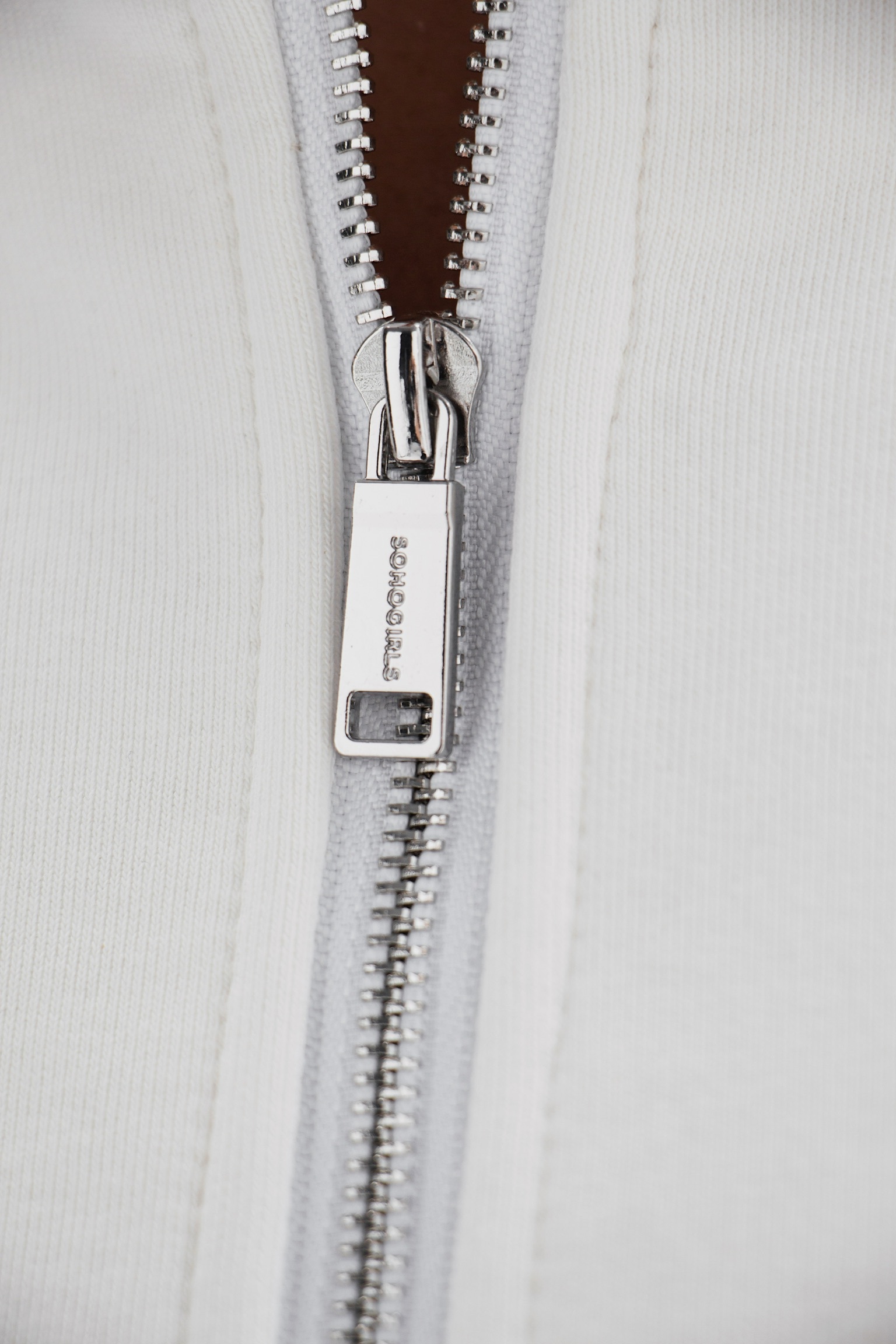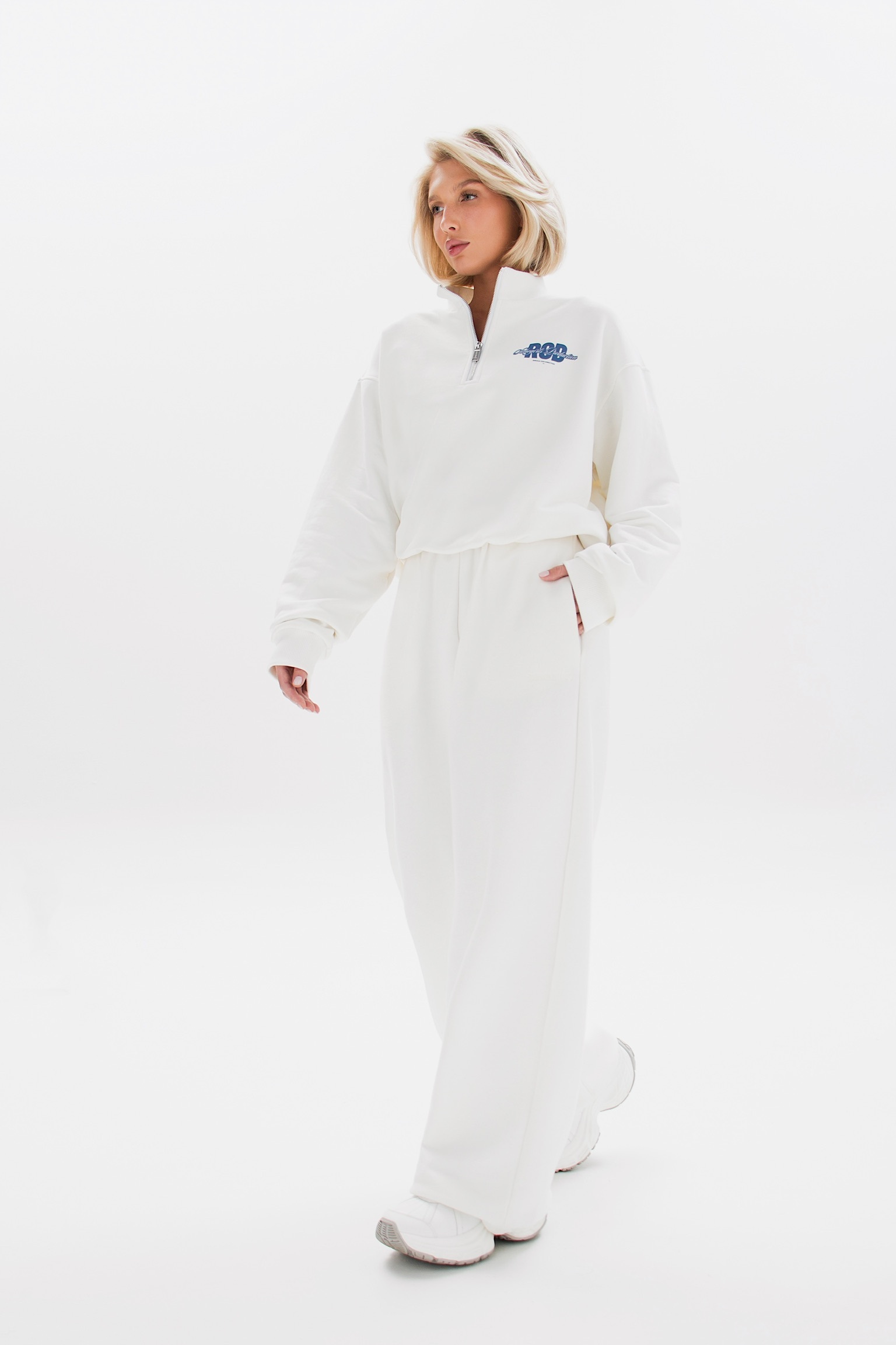 Свитшот свободного кроя выполнен из мягкой приятной ткани с принтом на груди и молнии.