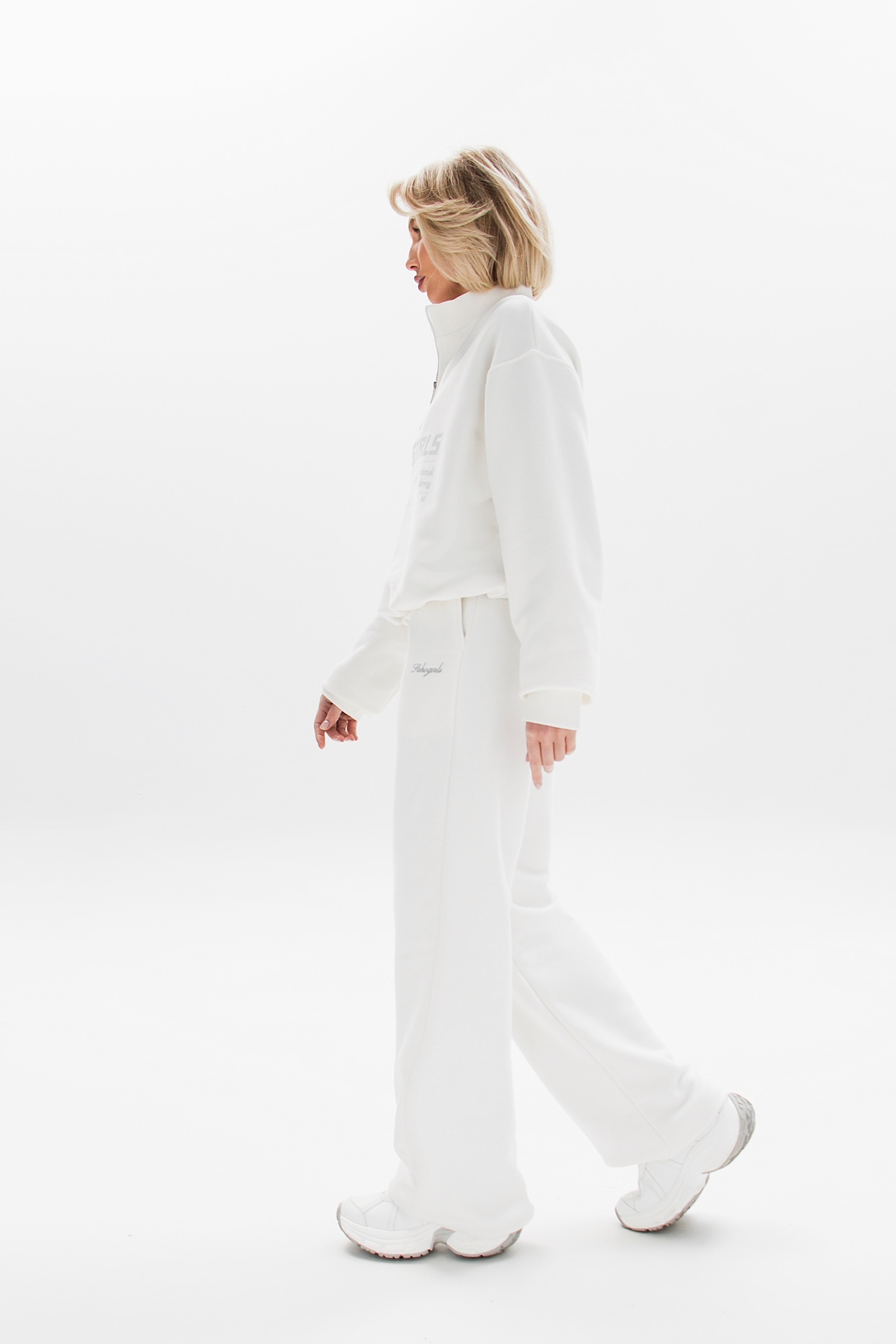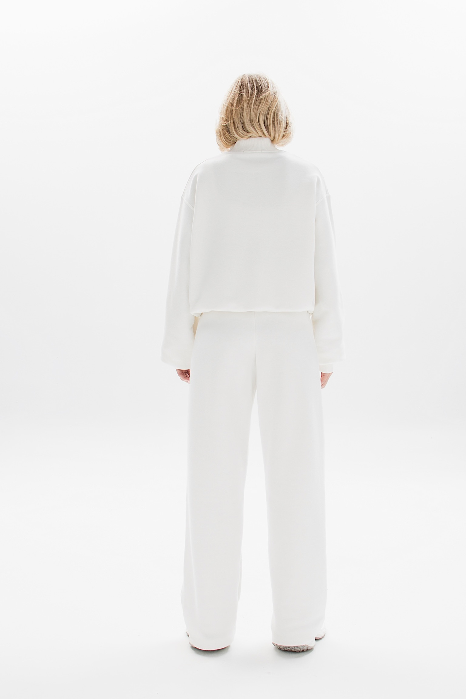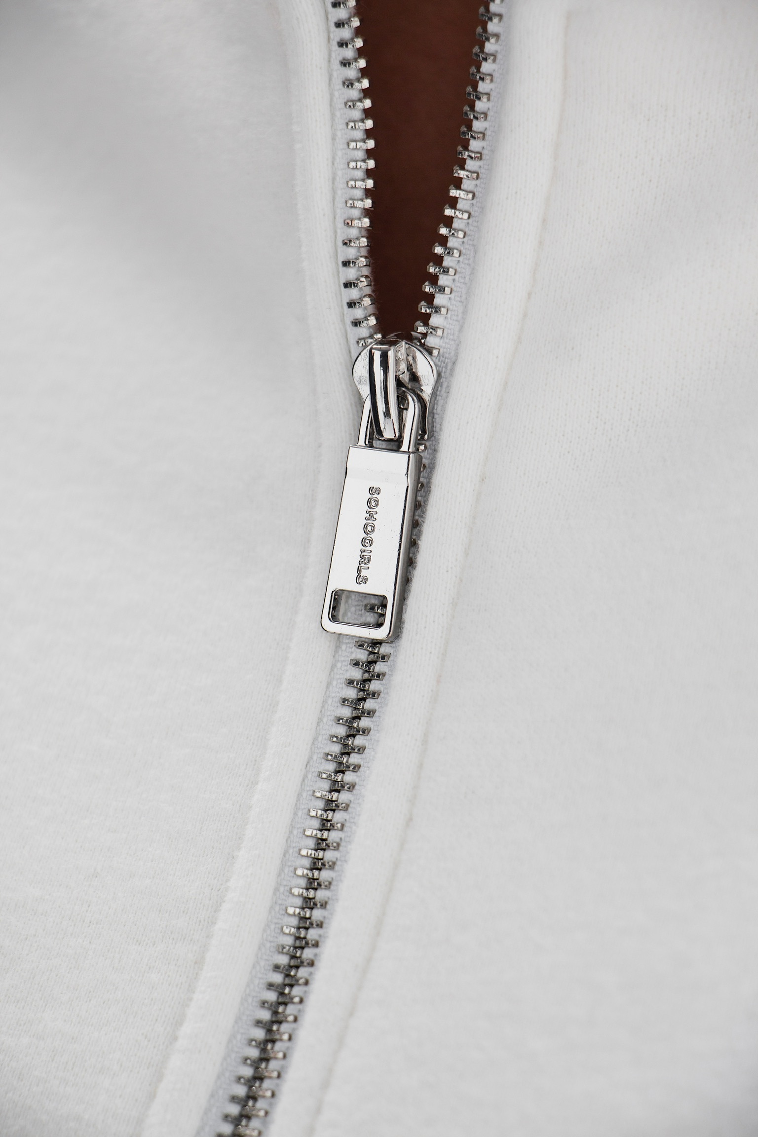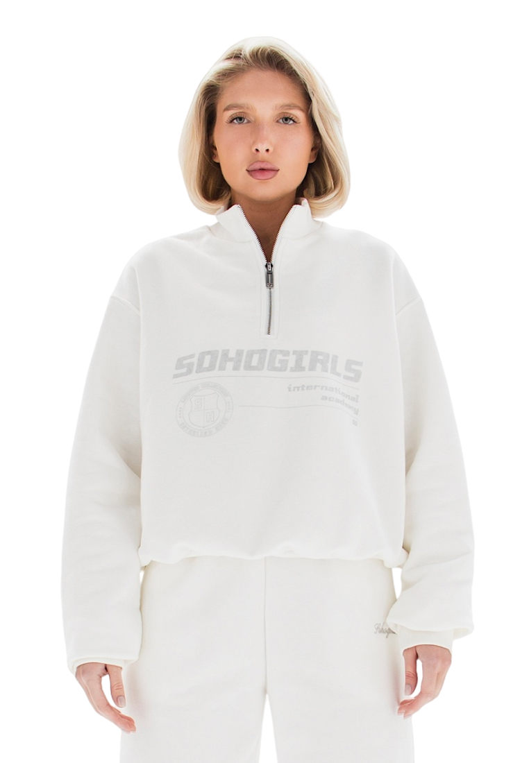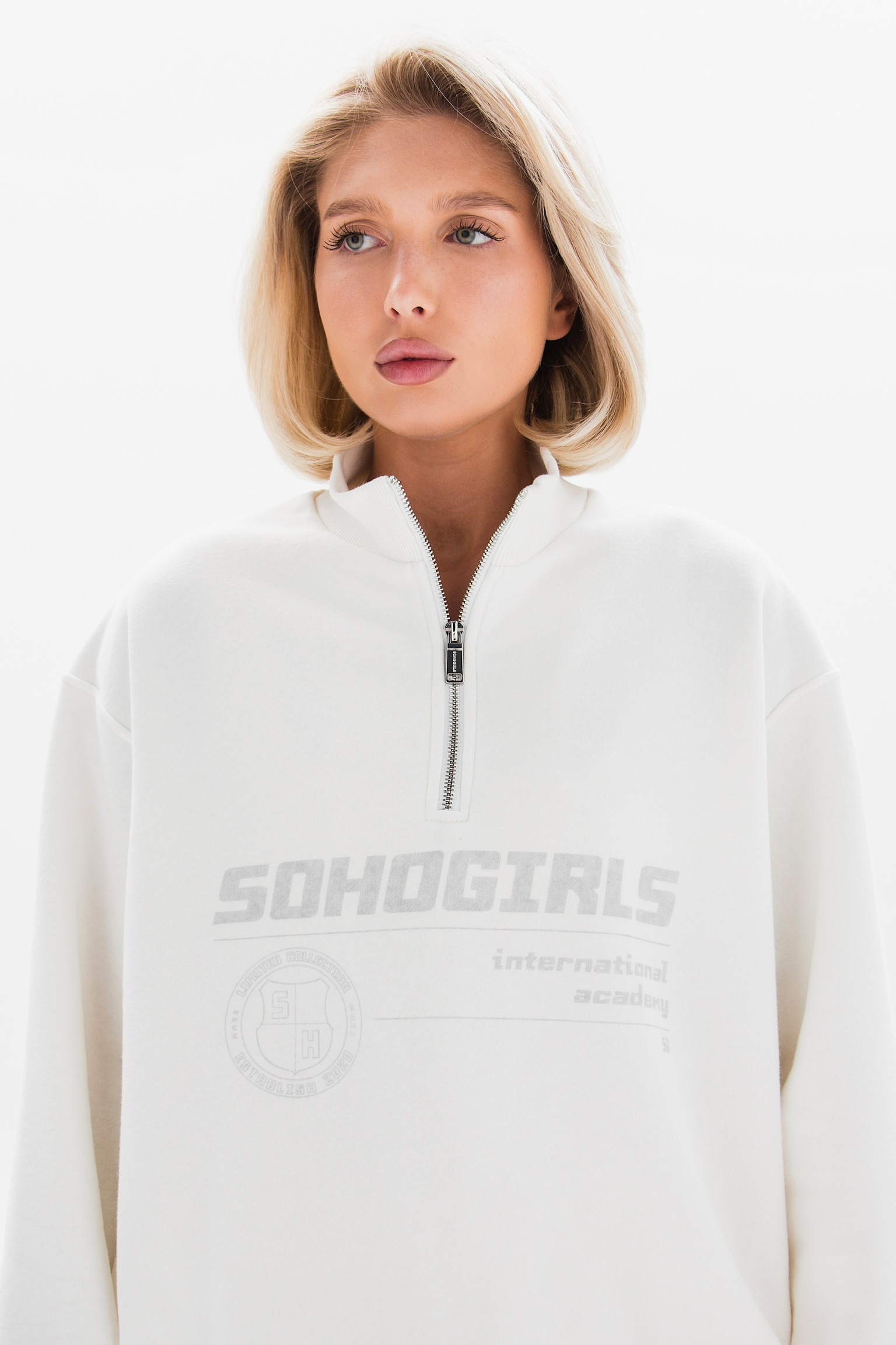 Свитшот свободного кроя выполнен из мягкой приятной ткани с принтом на груди и молнией.