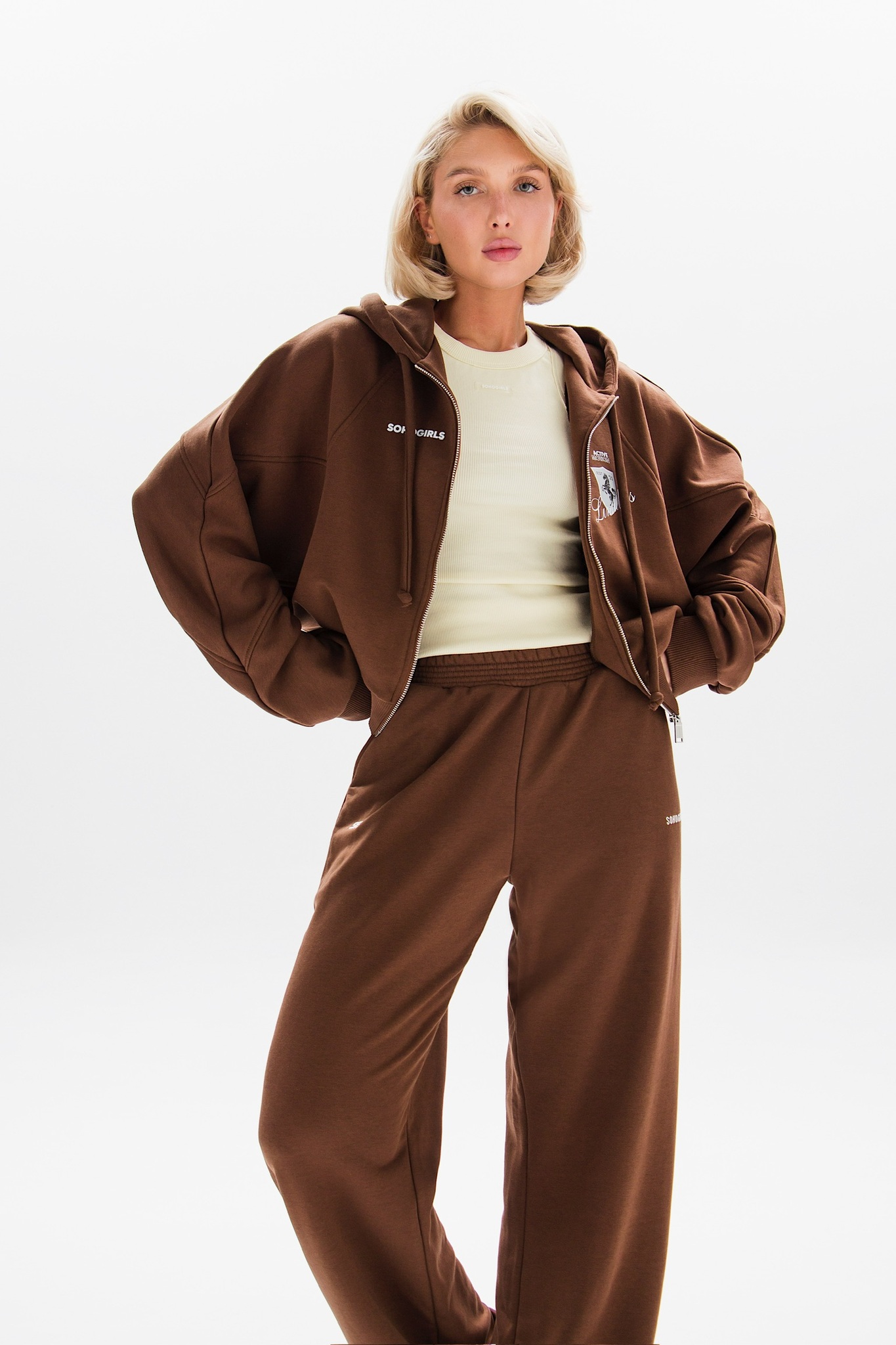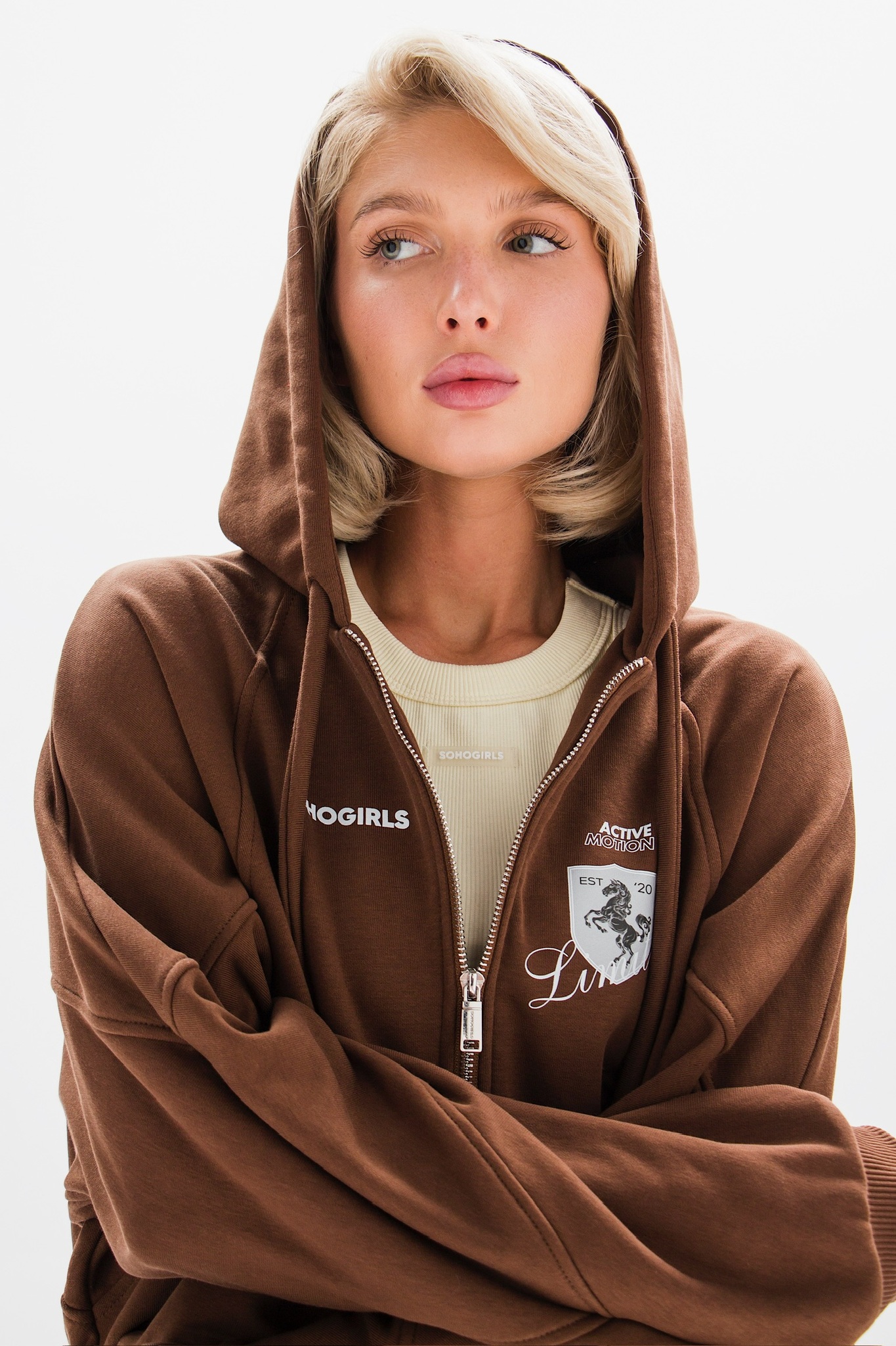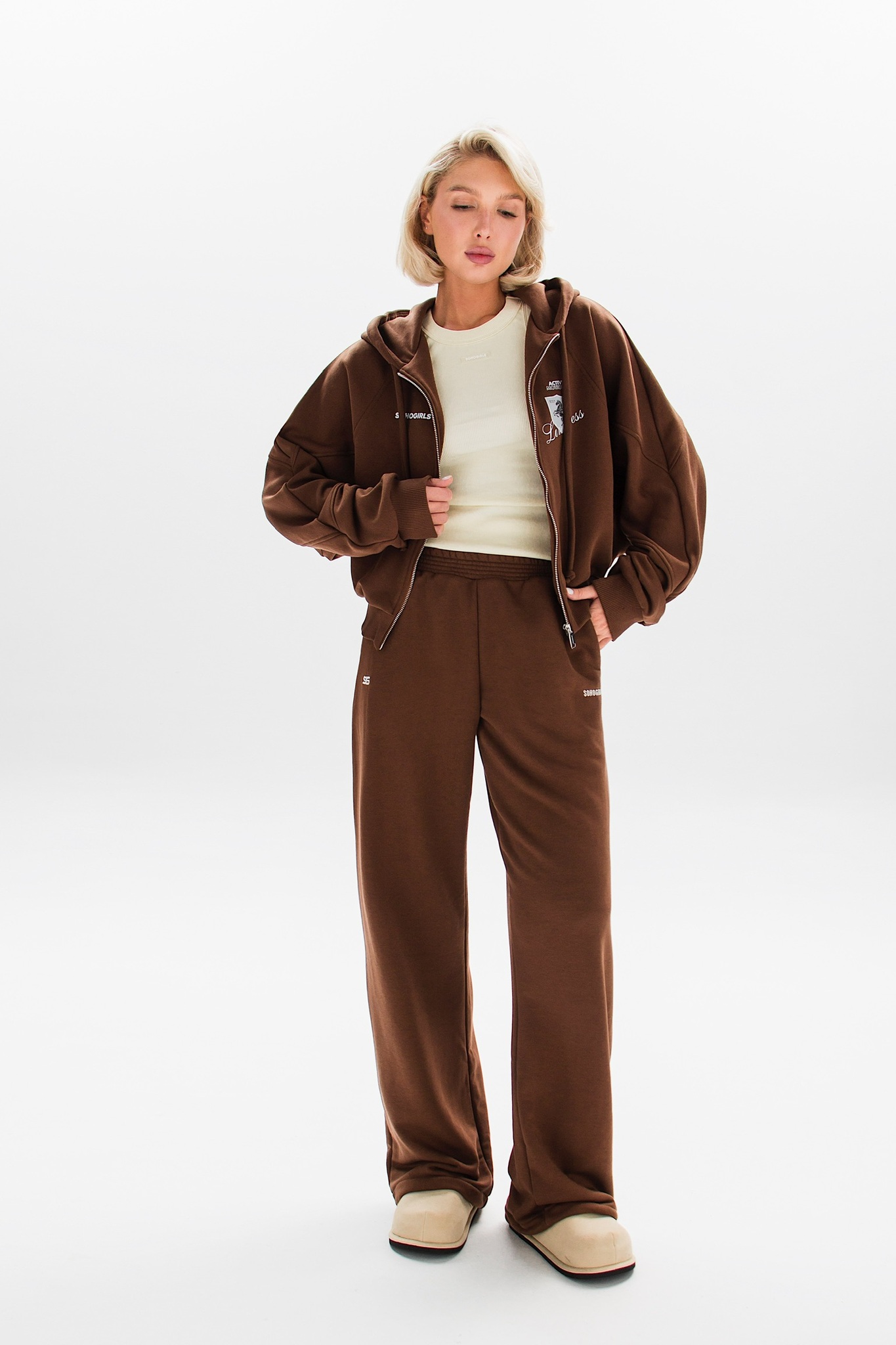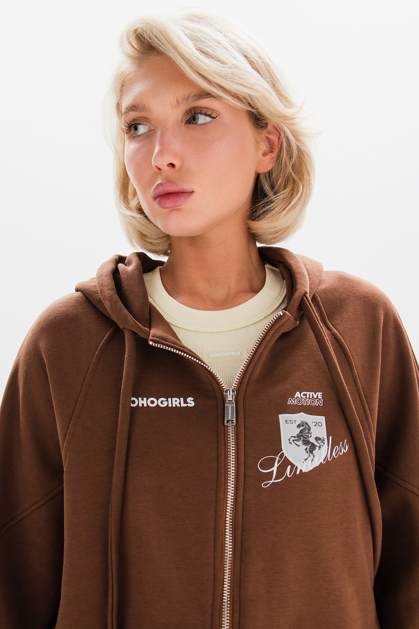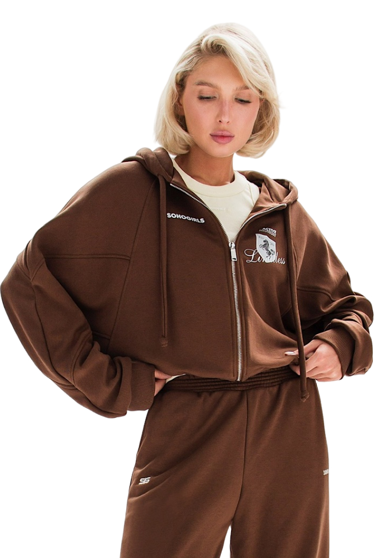 Модель оснащена удобной молнией и принтом на груди, добавляющими характерный акцент. Основной материал — хлопок, что делает изделие приятным к телу и износостойким