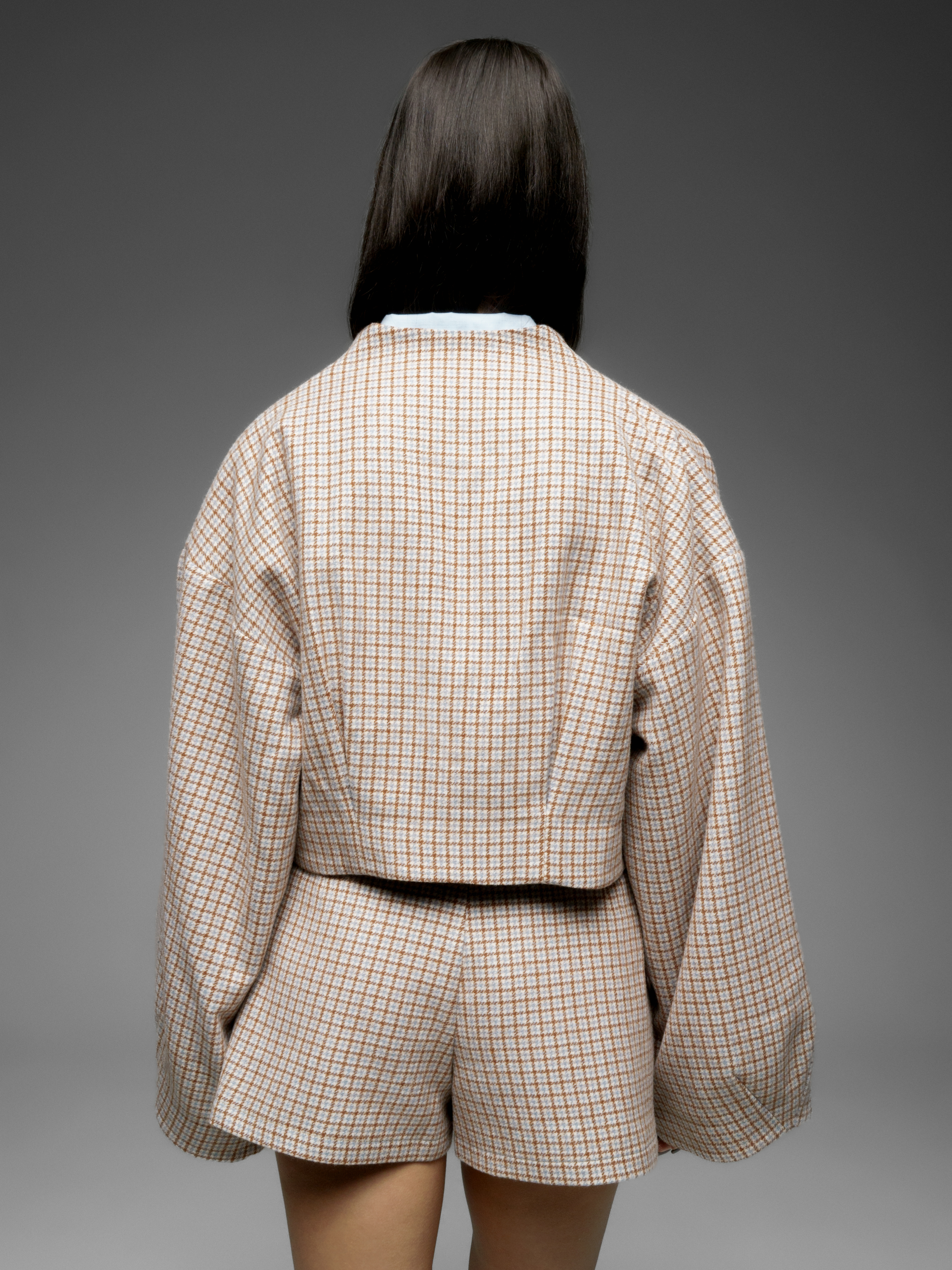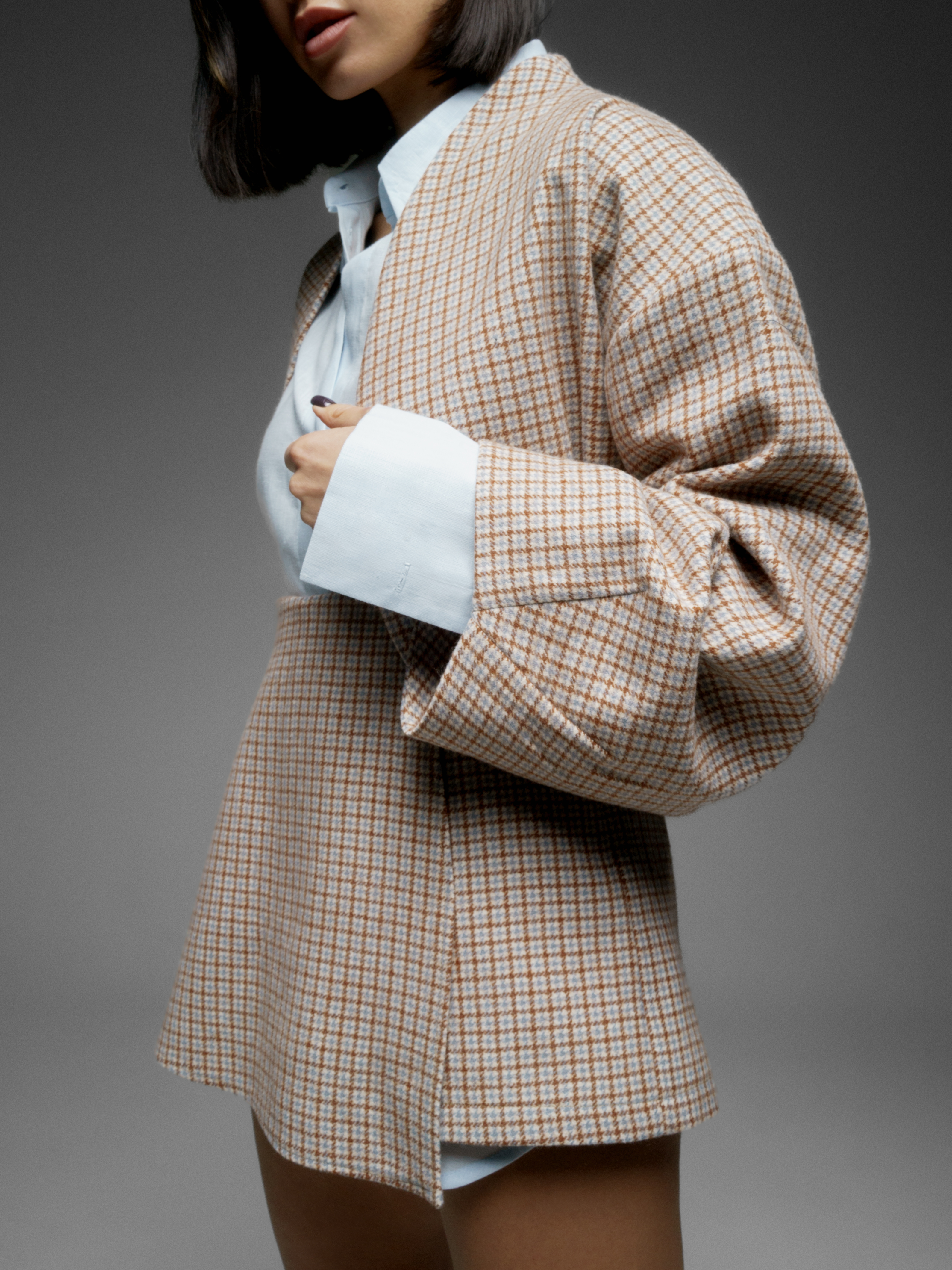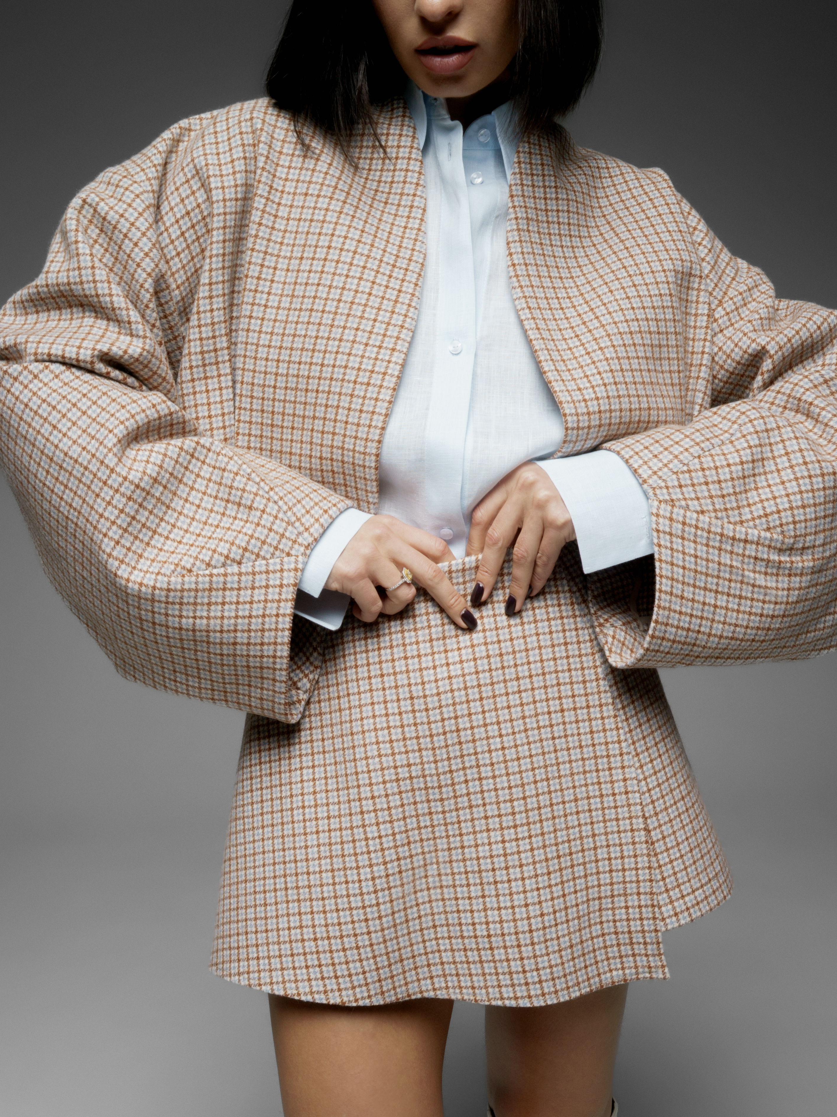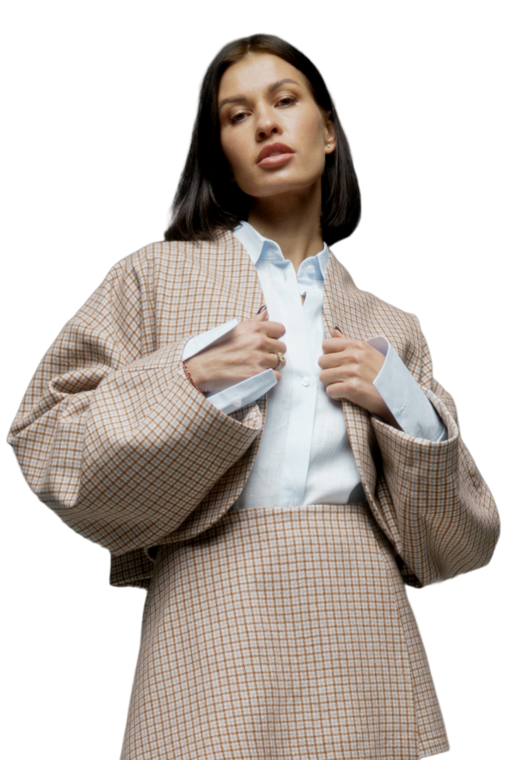 Бомбер с объемными рукавами как альтернатива пальто. Укороченная модель. Бомбер из шерсти в мелкий квадрат. Изящная модель сложного кроя длиной до бедра. Мягкая шерсть австралийского мериноса. Используемые волокна делают материал легче и долговечнее. В отличие от других видов шерсти, она совершенно не колется; обладает высокой воздухопроницаемостью.