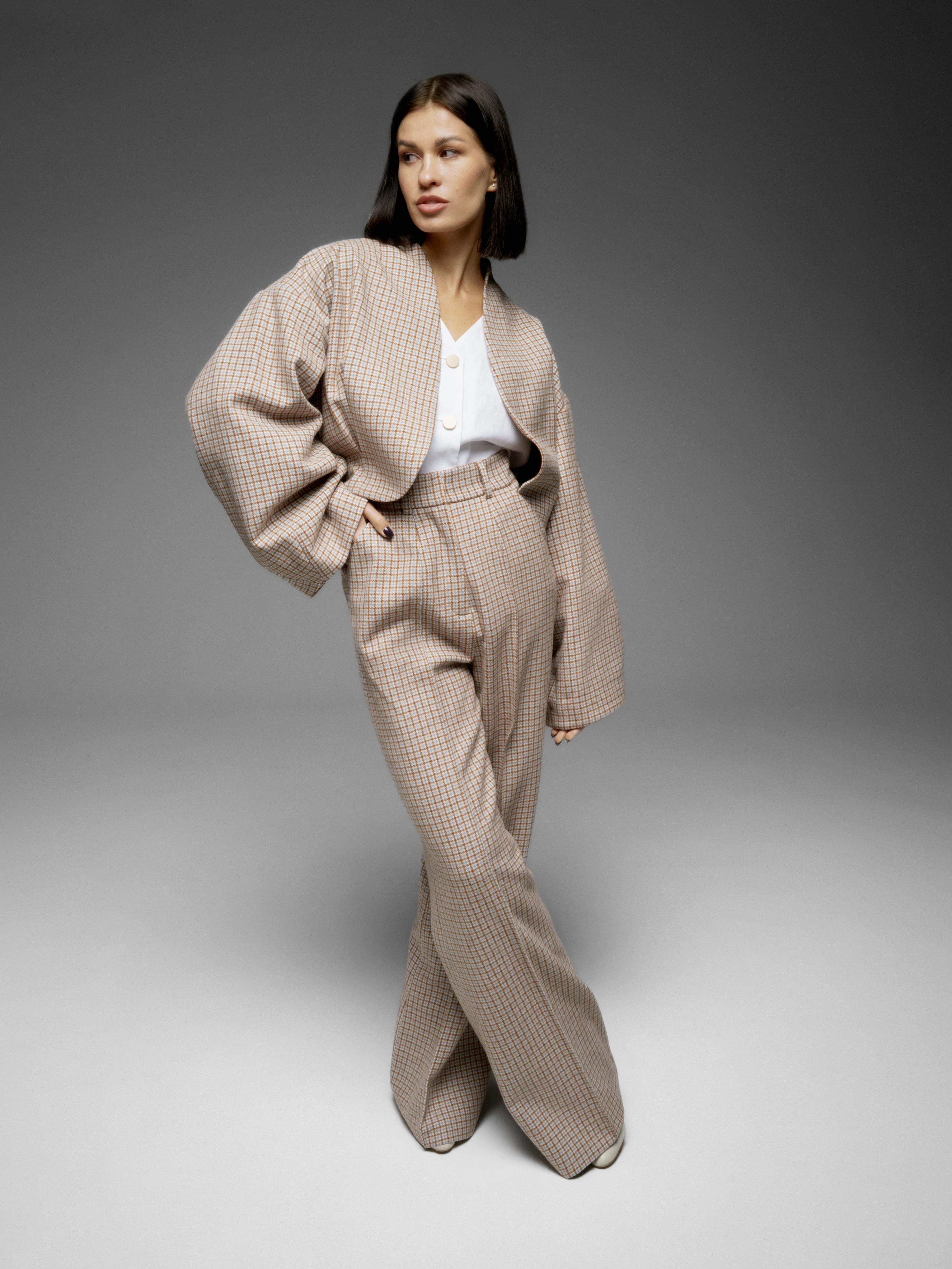 Можно подобрать брюки из такой же ткани в коллекции LYOS.