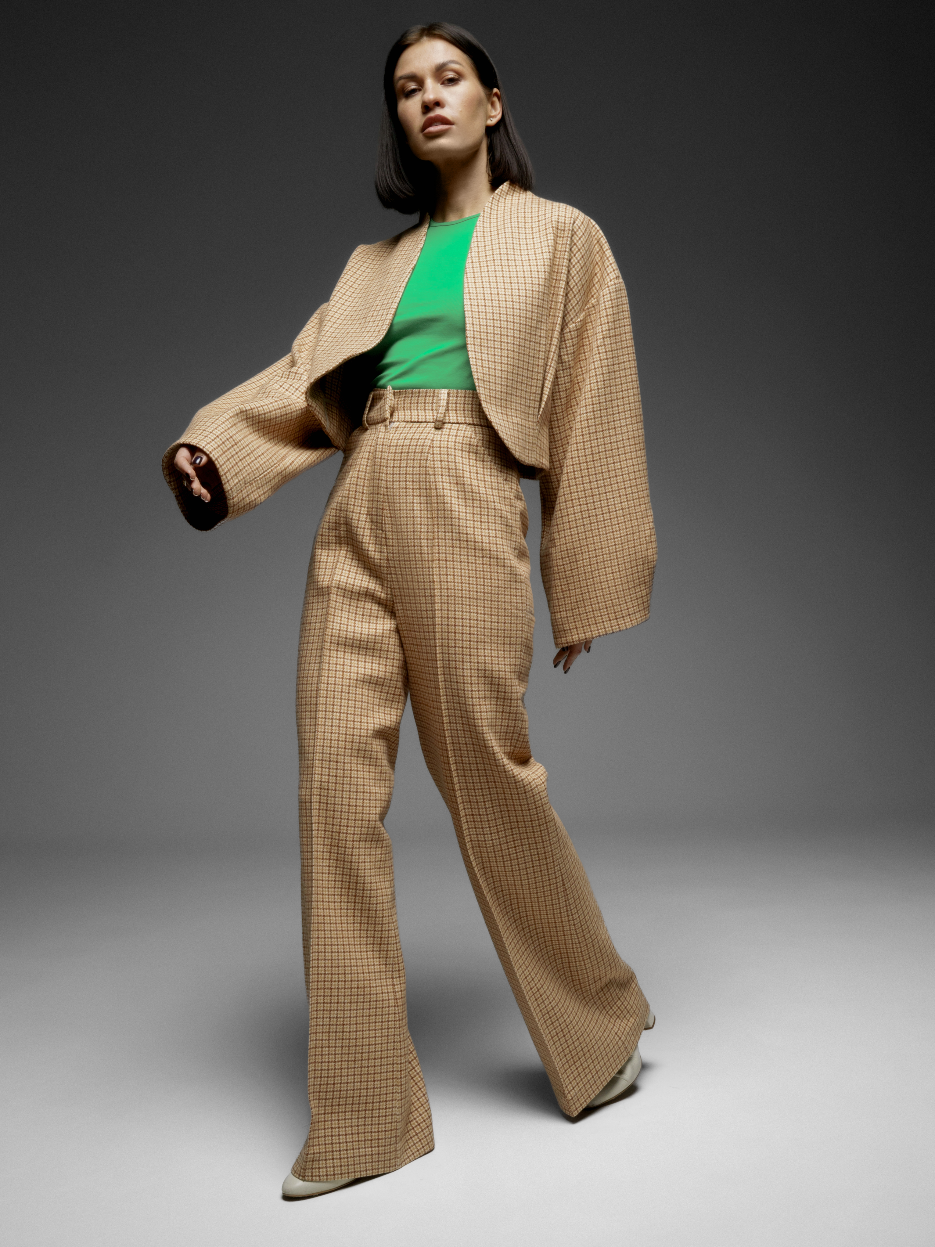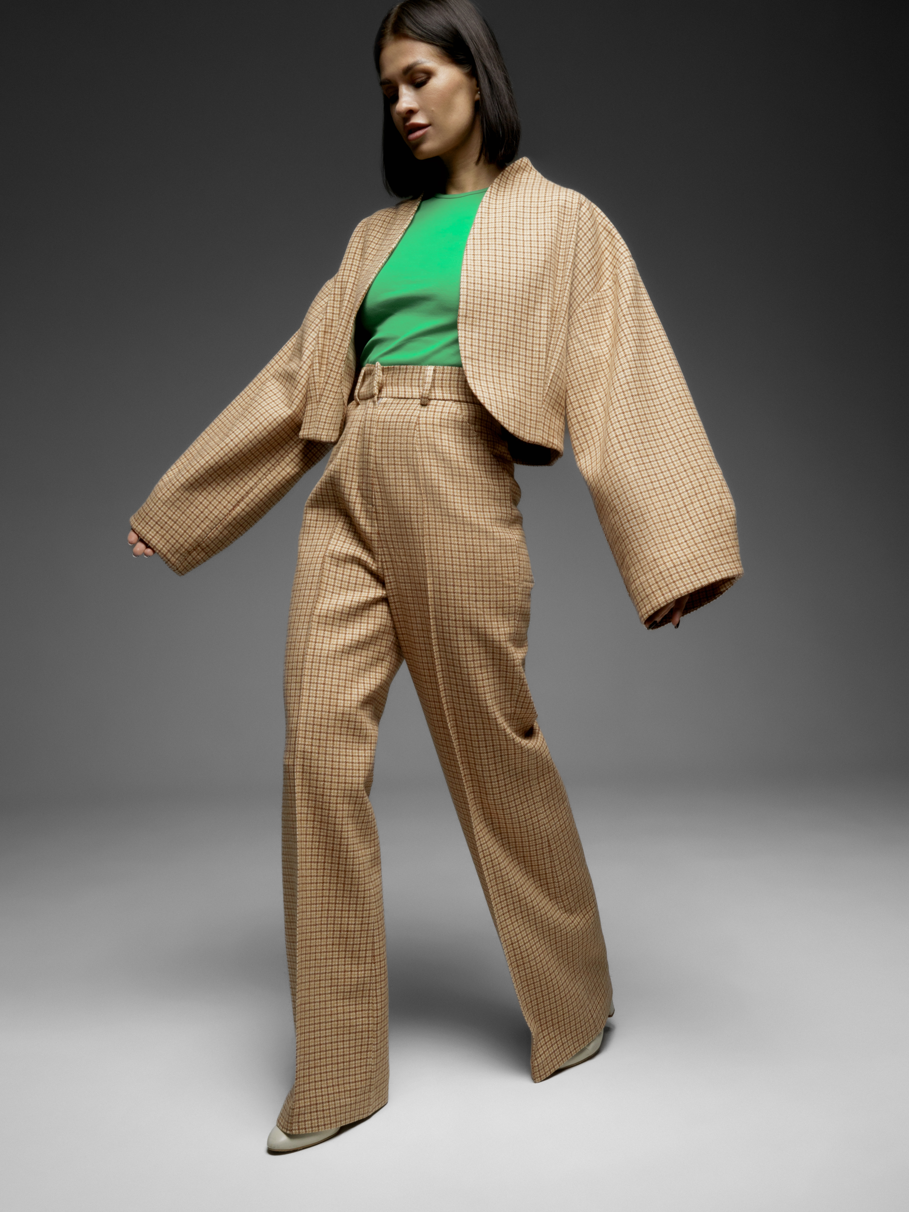 Можно подобрать брюки из такой же ткани в коллекции LYOS.