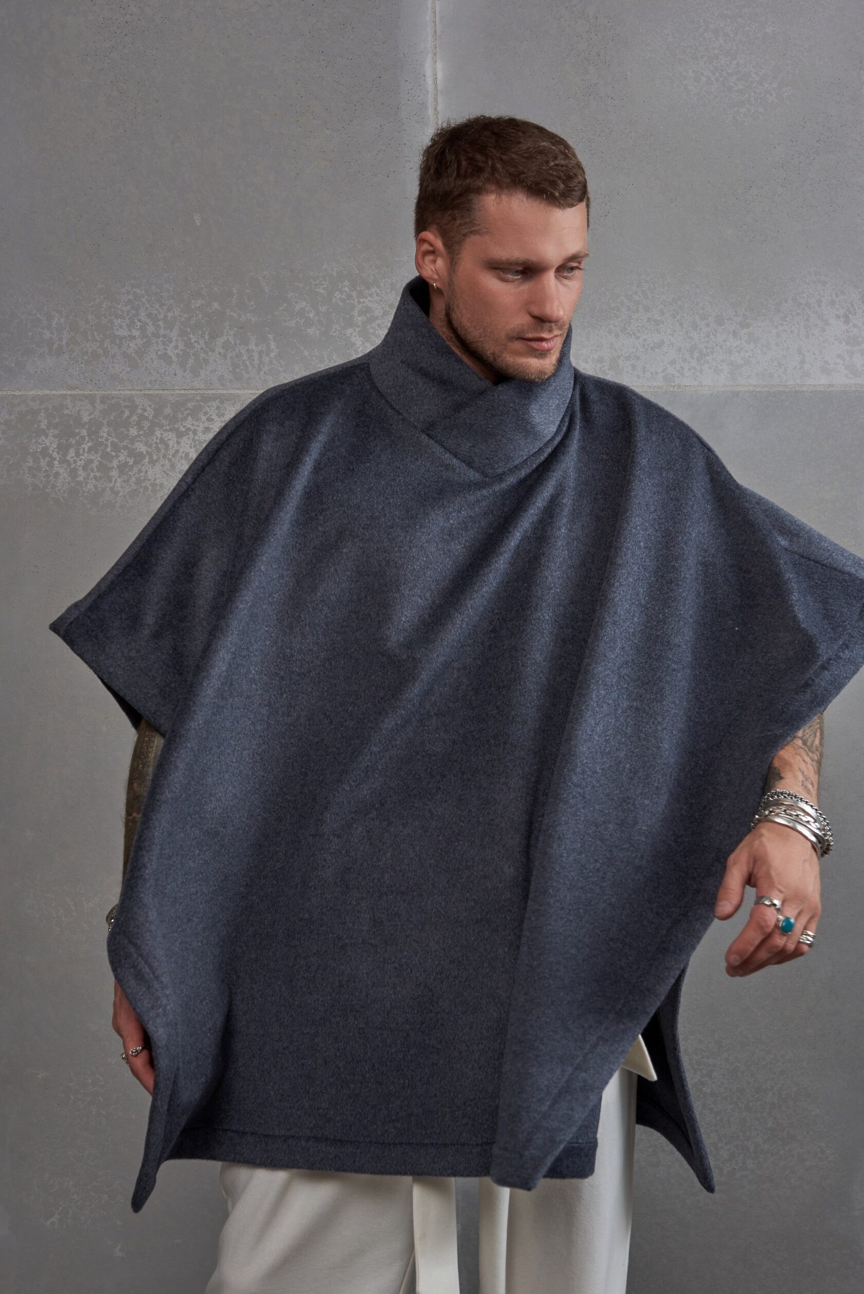 Пончо из 100% шерсти с высоким воротником-стойкой. Гладкая, мягкая на ощупь шерсть слегка блестит на солнце. Пояс позволяет легко изменить силуэт пончо, превращая его в легкое и свободное пальто. Пончо удобно носить как верхнюю одежду осенью, поверх верхней одежды в ветренную погоду или кутаться в него дома и в офисе в холодное время года.