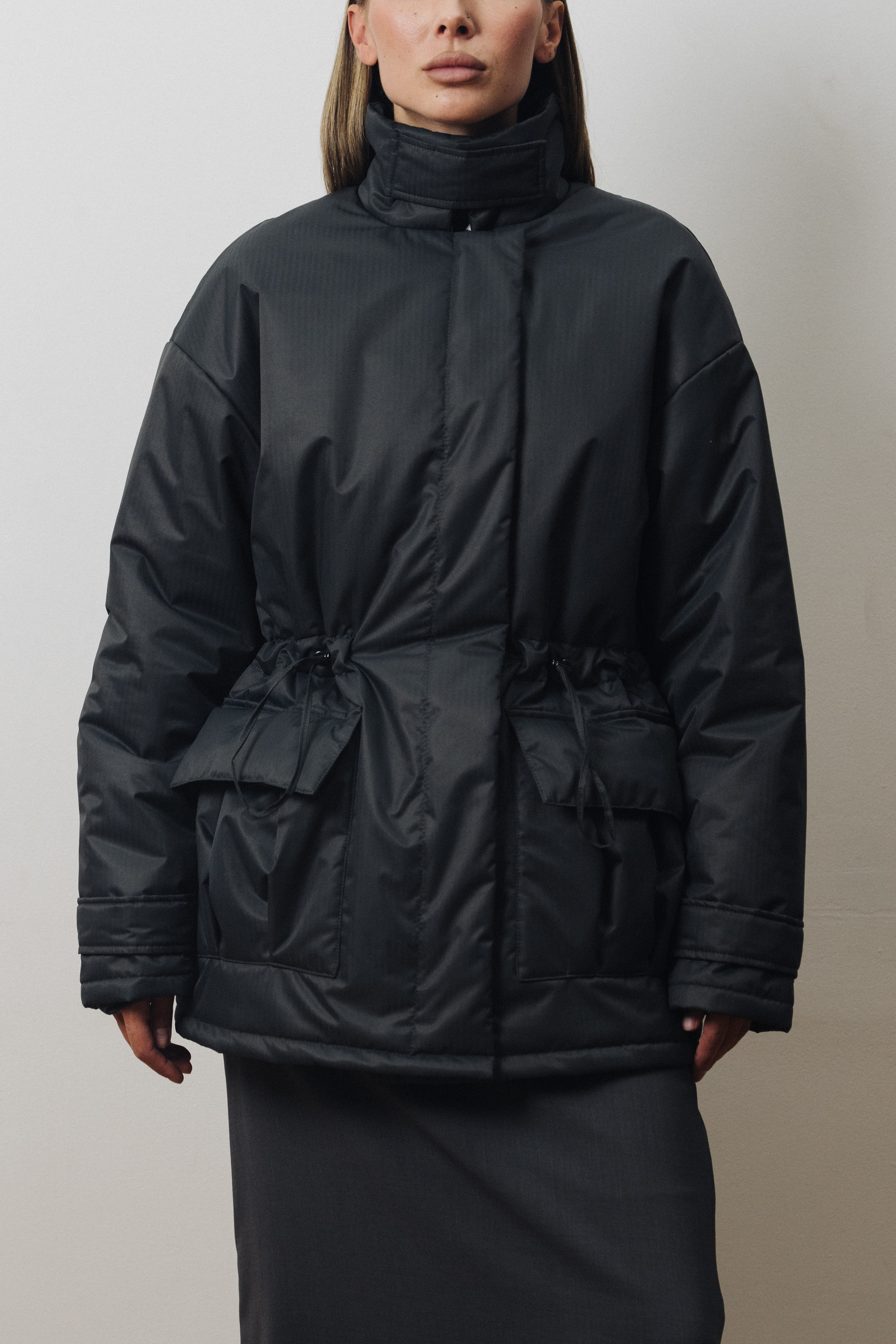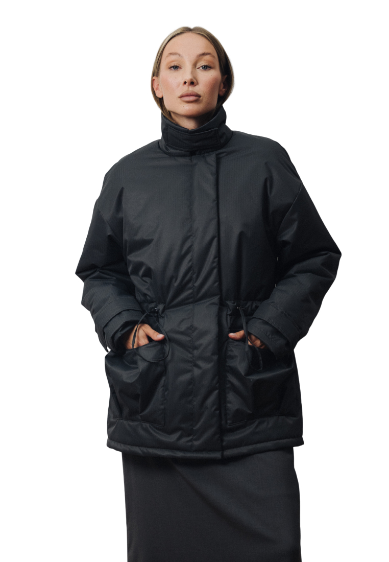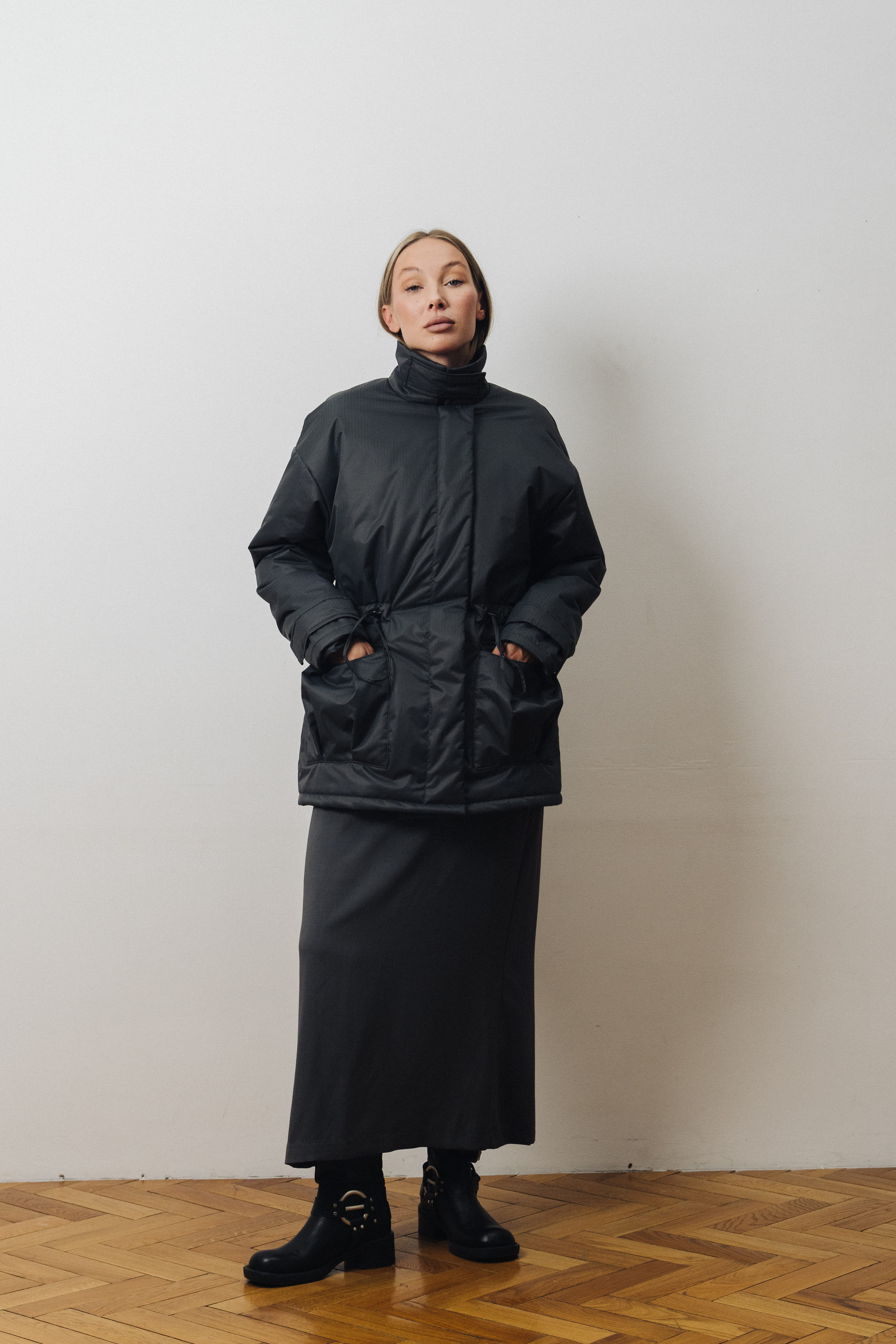Куртка-парка oversize кроя с акцентными карманами и кулиской на талии. Идеальный вариант на демисезонный период, наполнитель из слайтекса позволяет ей быть легкой и при этом устойчивой к морозам до -10 градусов.
