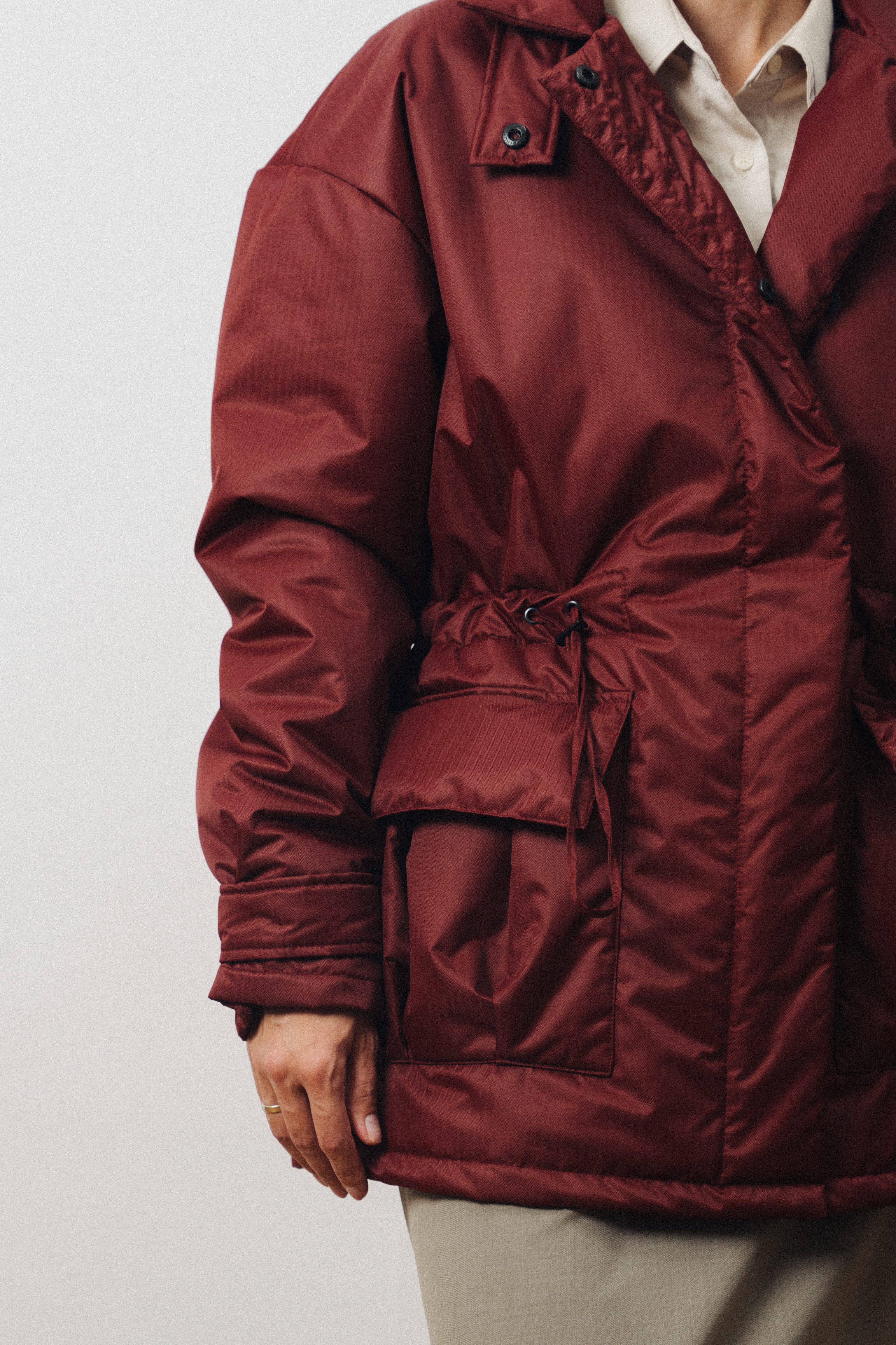 Детали: ворот-стойка на кнопке; кулиска на талии; два глубоких внешних накладных кармана; спущенный плечевой шов; застежка на кнопки; ткань верха с влагоотталкивающими свойствами.