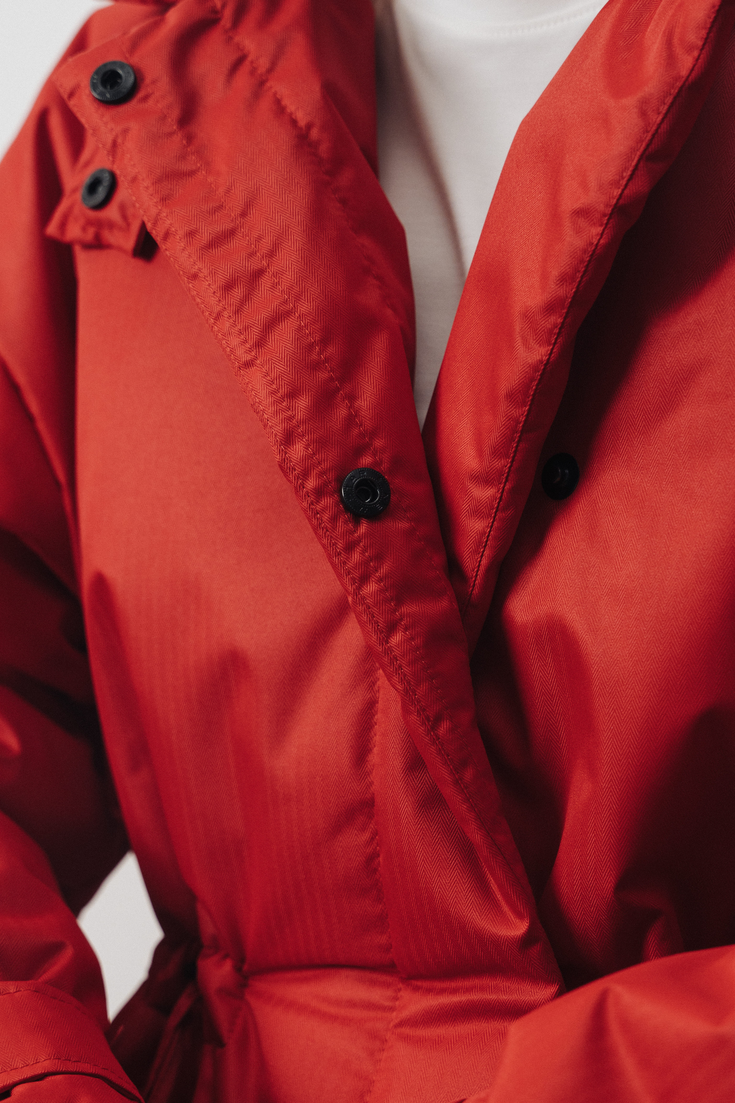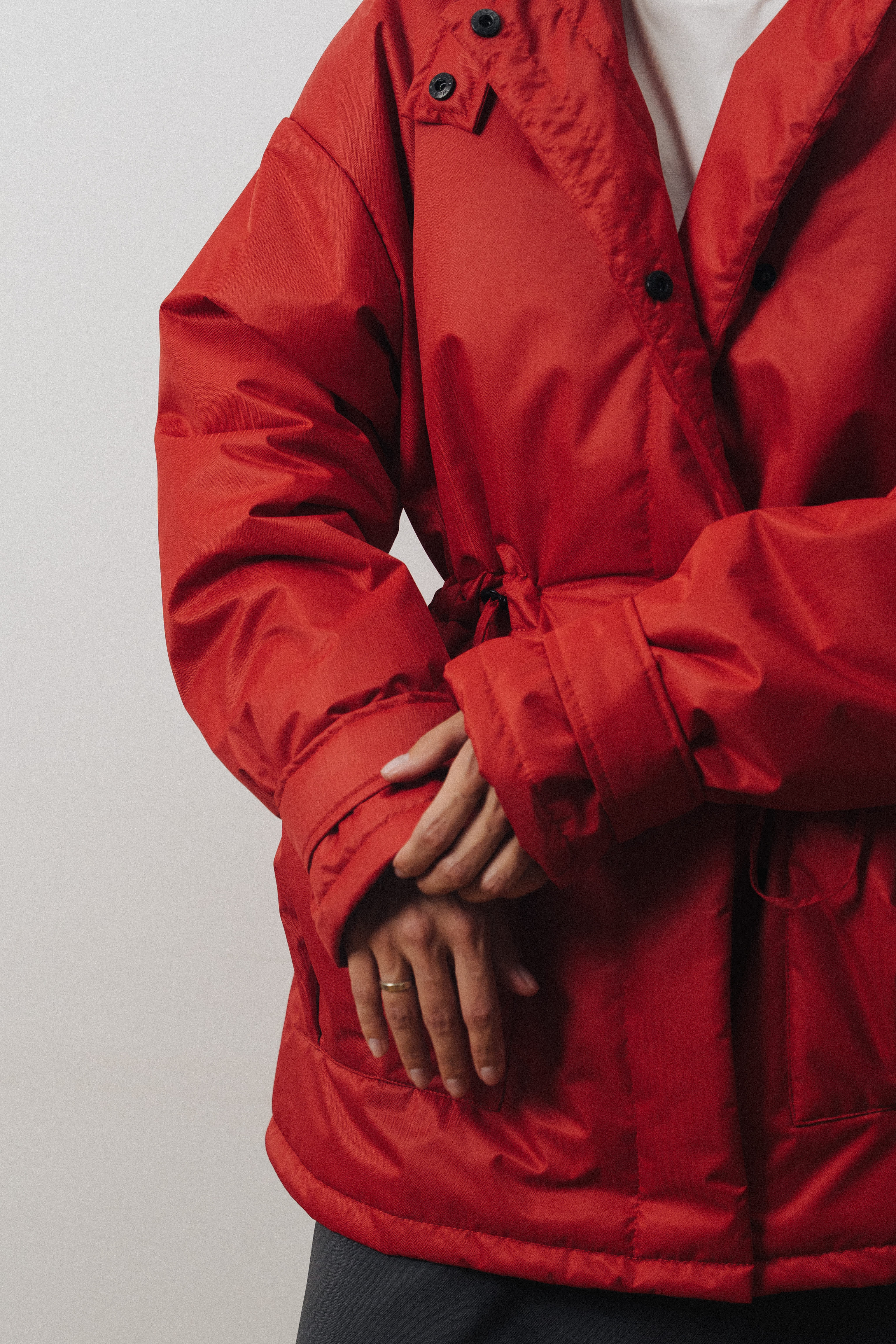 Детали: ворот-стойка на кнопке; кулиска на талии; два глубоких внешних накладных кармана; спущенный плечевой шов; застежка на кнопки; ткань верха с влагоотталкивающими свойствами.