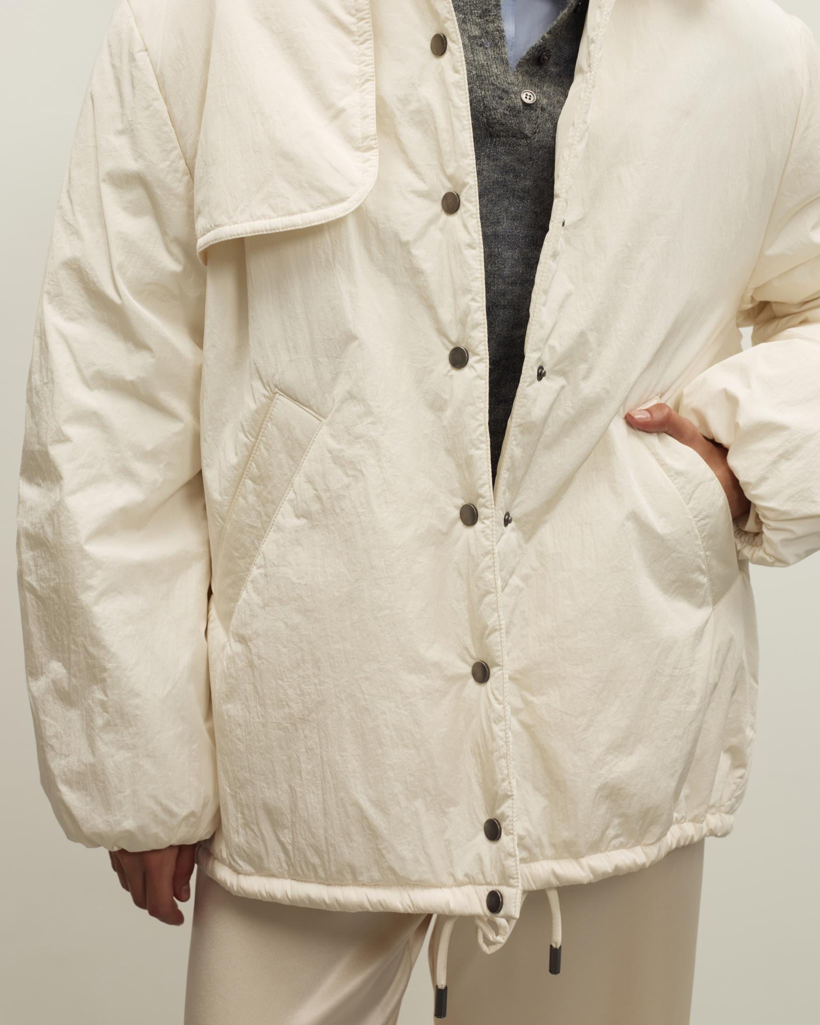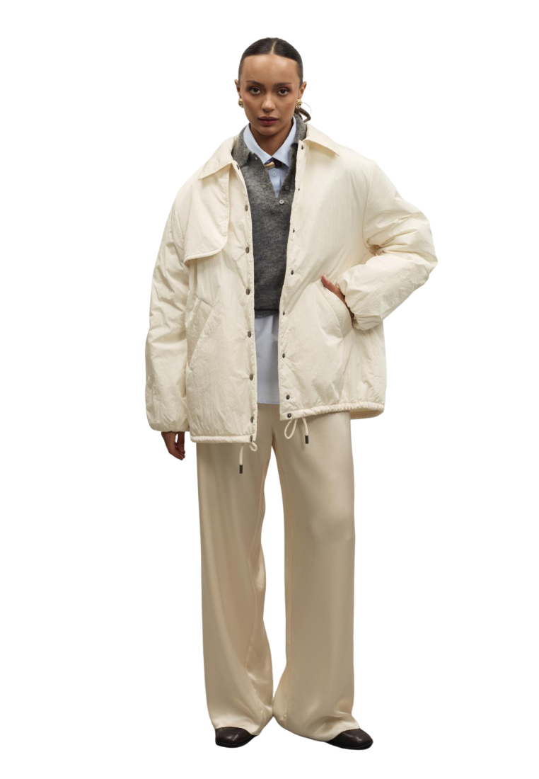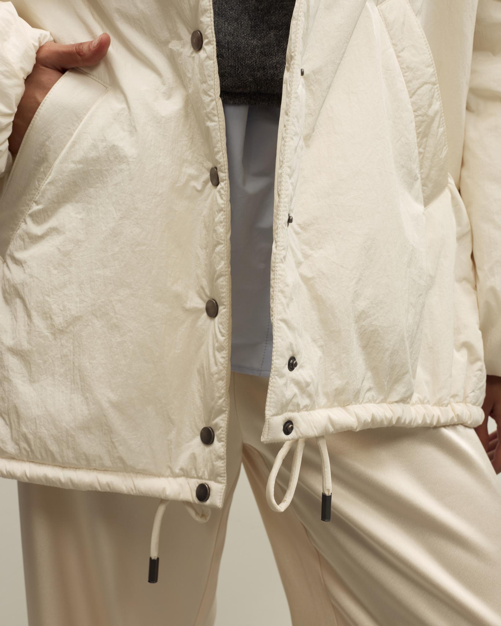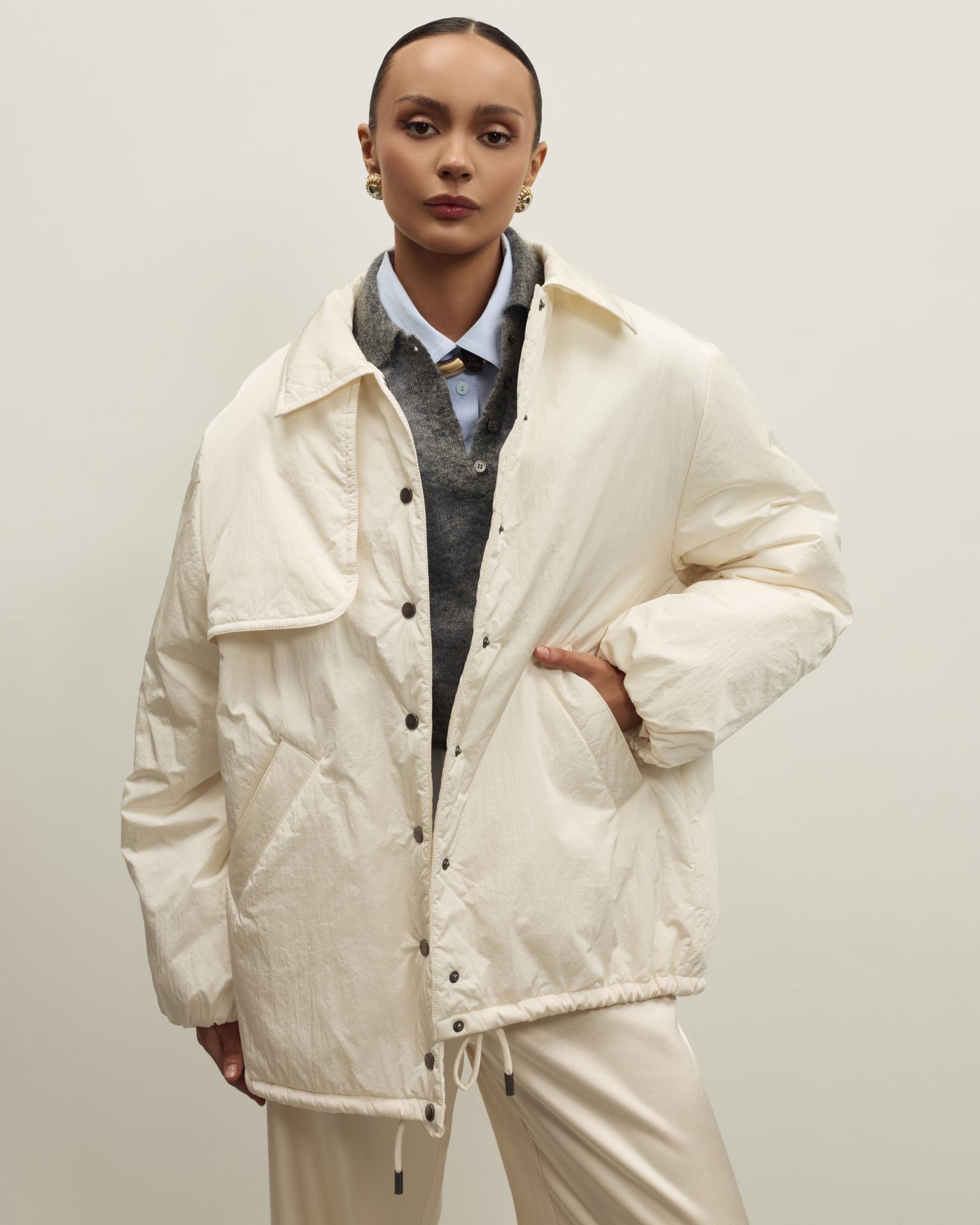 Куртка дополнена боковыми карманами и кулиской по низу, позволяющей регулировать объем и посадку. Отложной воротник делает образ более собранным, светлый нейтральный цвет легко сочетается с базовым гардеробом — от брюк и джинсов до юбок и платьев. Отличный вариант для повседневных традиционных образов и событий.