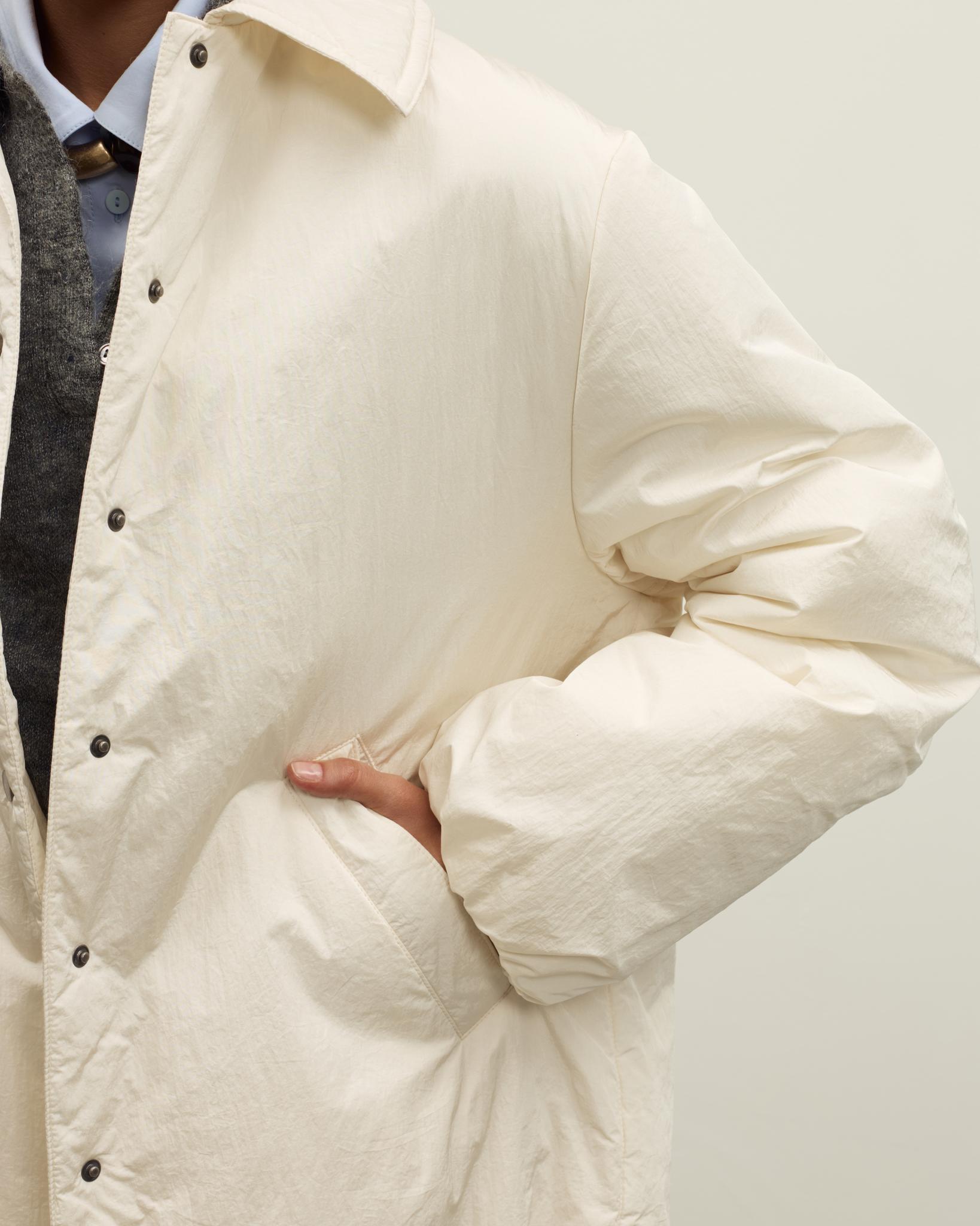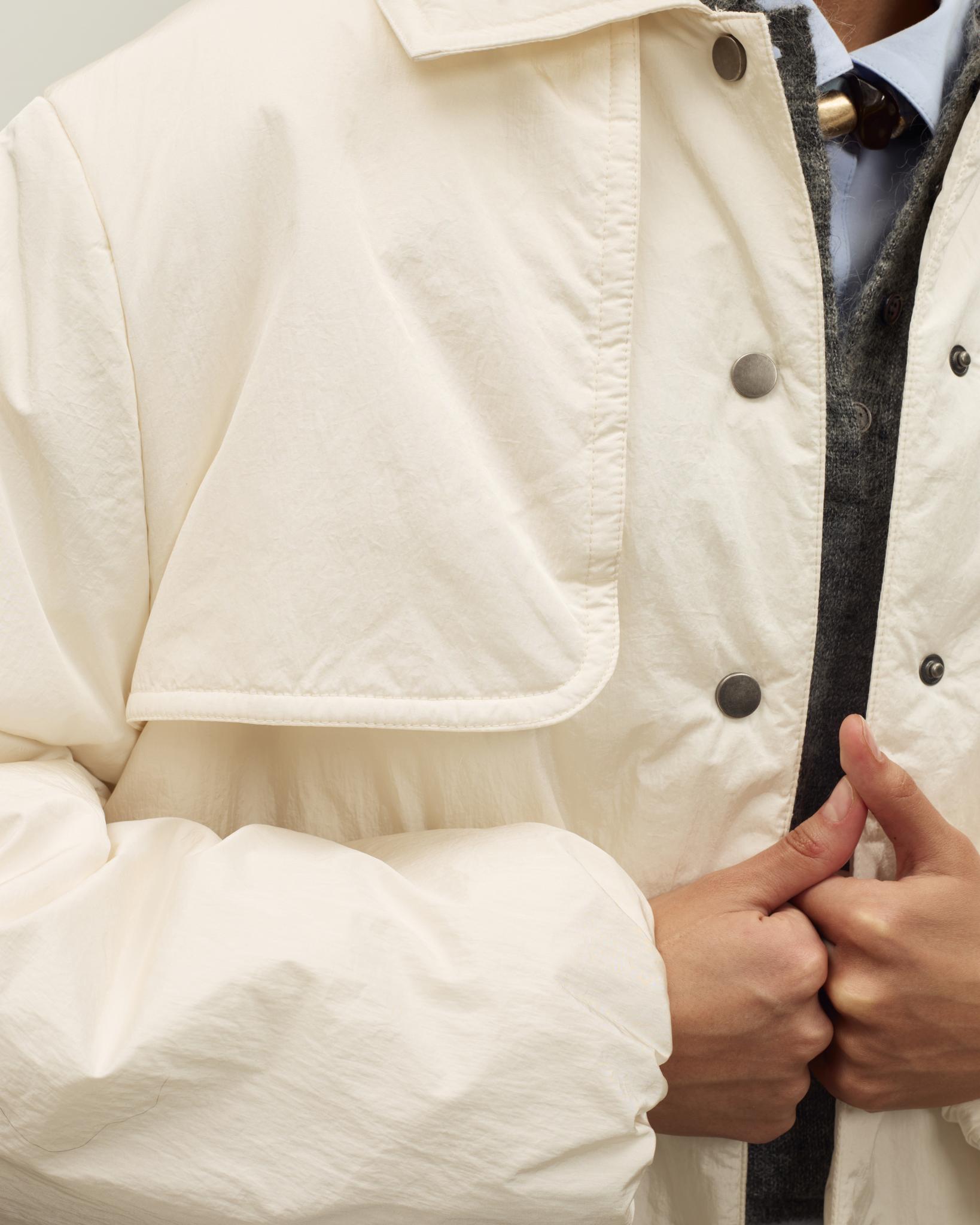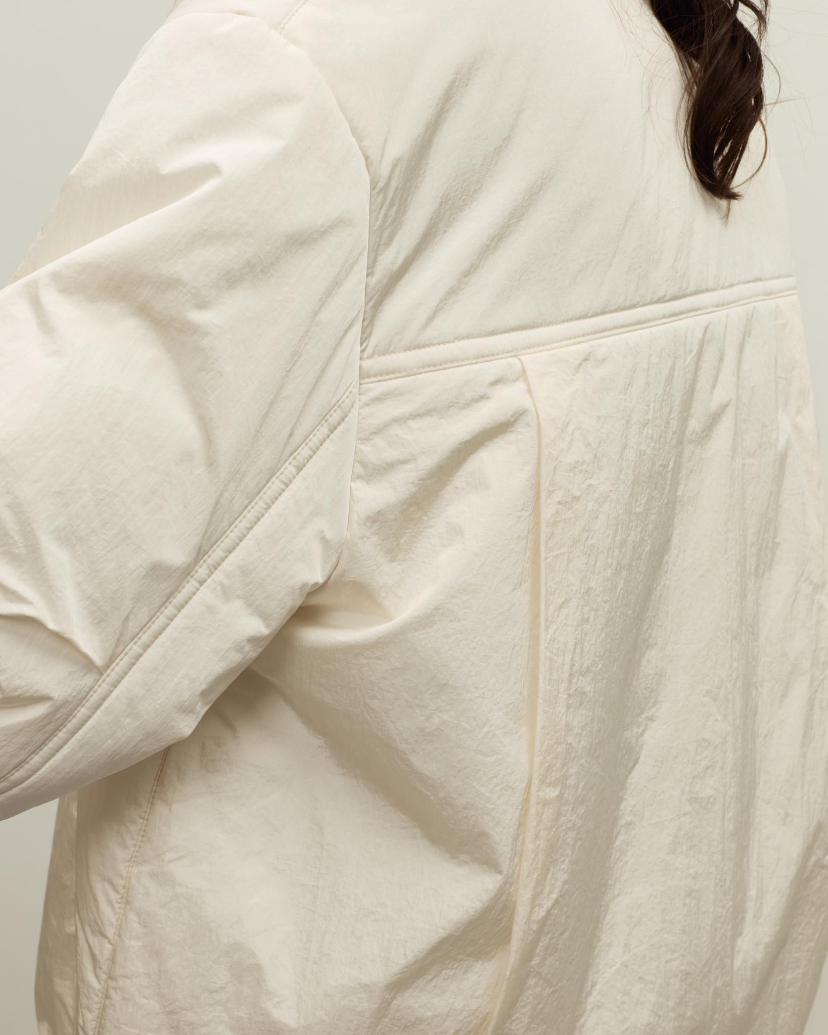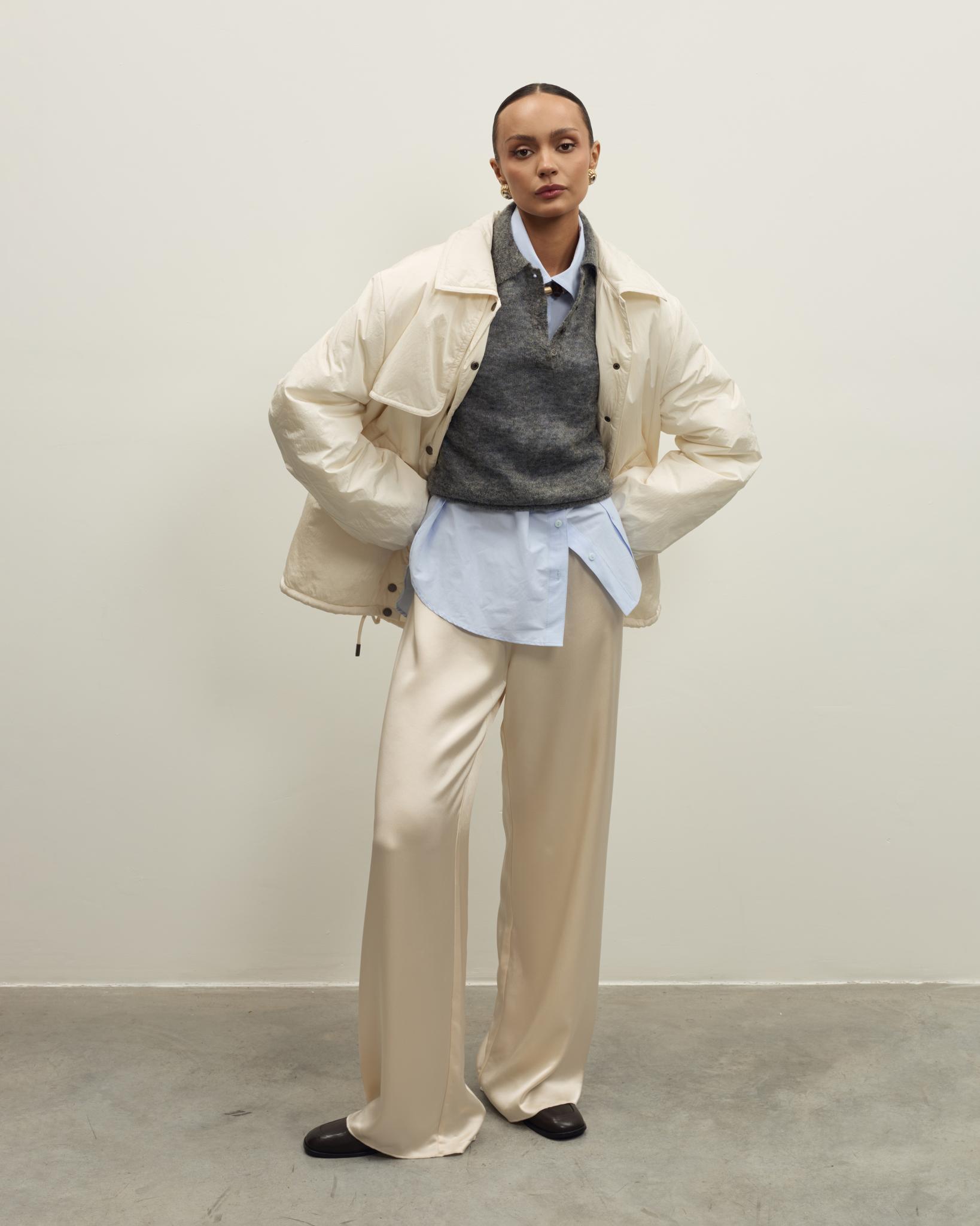 Куртка дополнена боковыми карманами и кулиской по низу, позволяющей регулировать объем и посадку. Отложной воротник делает образ более собранным, светлый нейтральный цвет легко сочетается с базовым гардеробом — от брюк и джинсов до юбок и платьев. Отличный вариант для повседневных традиционных образов и событий.