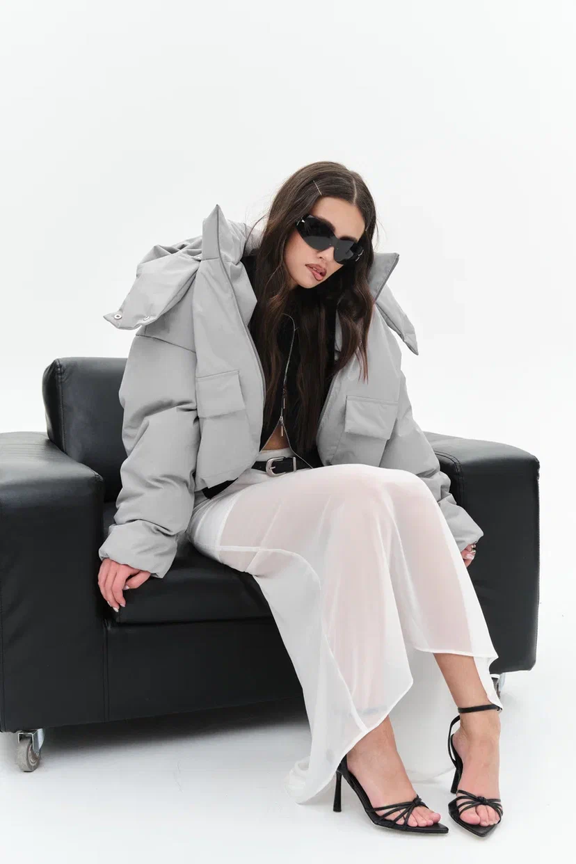Женская укороченная косуха из фактурной экокожи цвета серый питон, максимально схожая с натуральной. Модель свободного кроя, длинными рукавами и втачными молниями, прорезными карманами на молниях, широкими отложным воротником и лацканами, погонами на плечах, широким поясом с пряжкой, продетым...