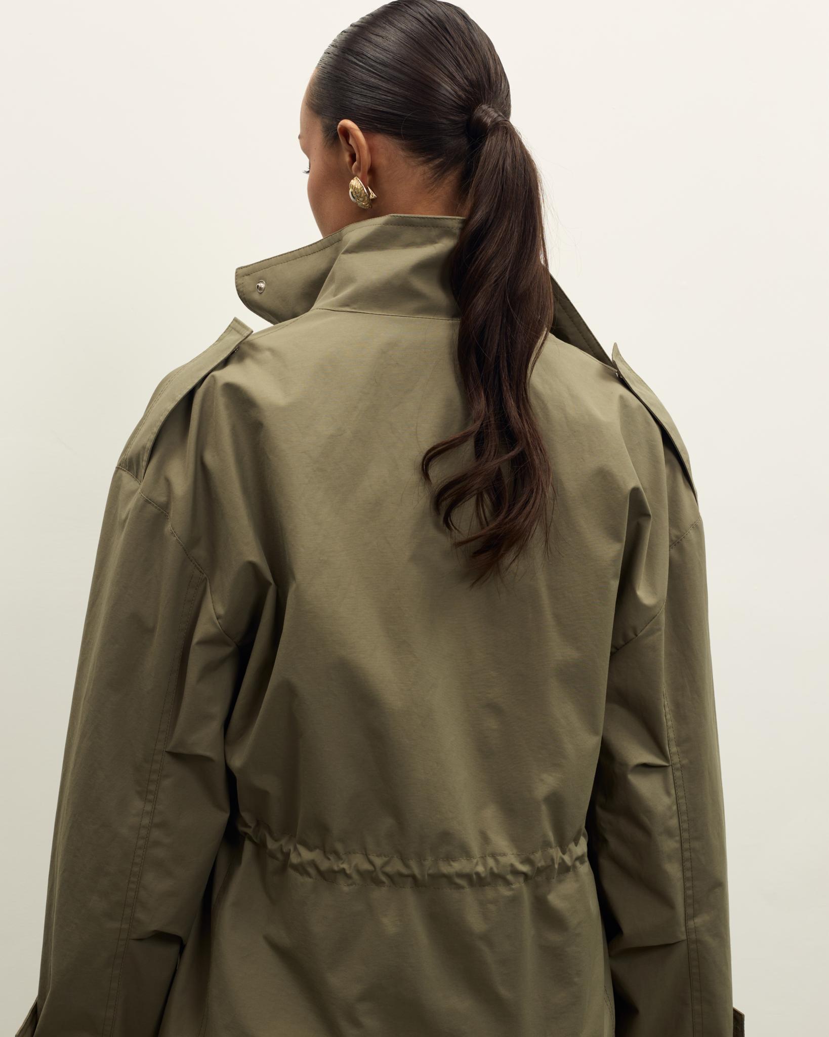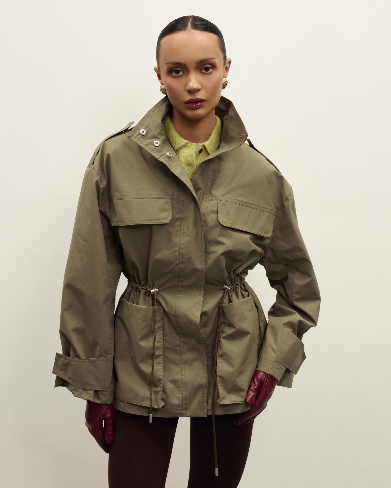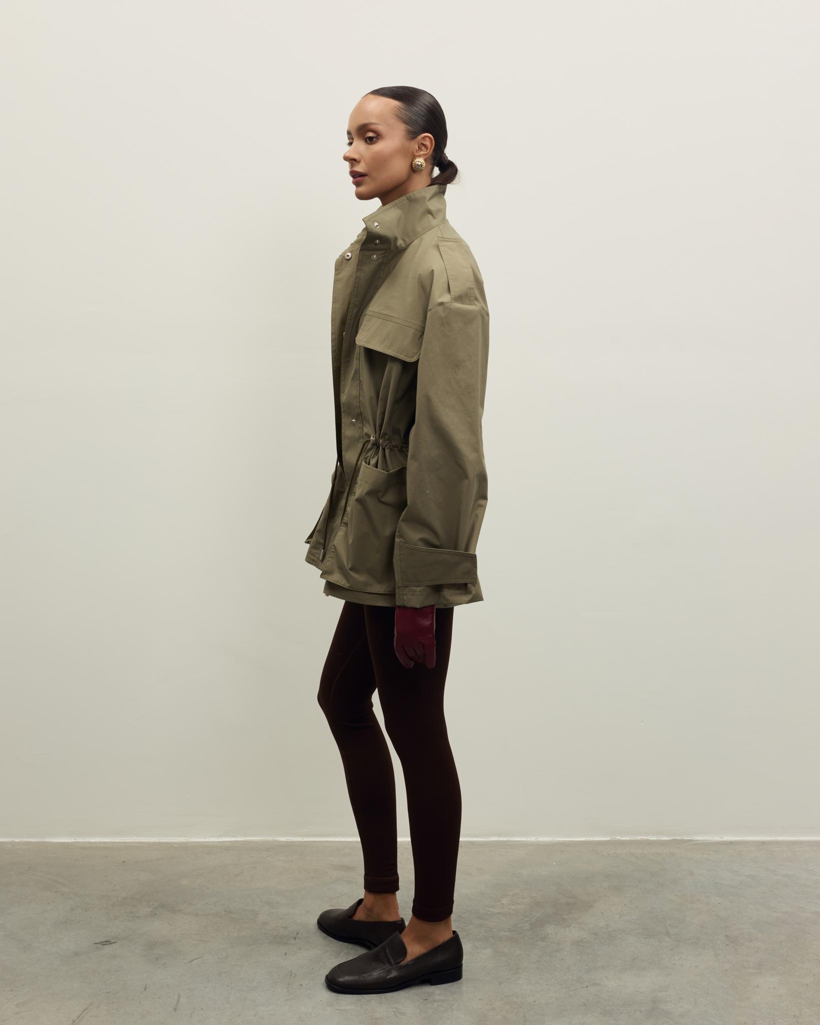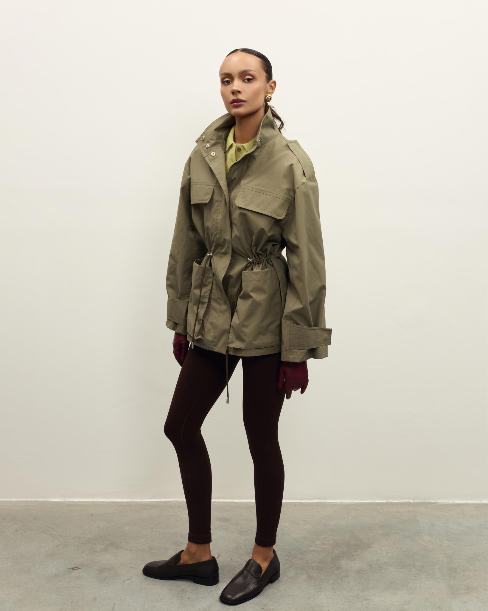 Лёгкая куртка из плотного хлопка — универсальная модель для демисезонного гардероба. Прямой, слегка свободный силуэт обеспечивает комфортную посадку, а кулиска на талии позволяет регулировать объём и подчёркивать фигуру. Высокий воротник защищает от ветра, создавая более собранный и аккуратный образ.