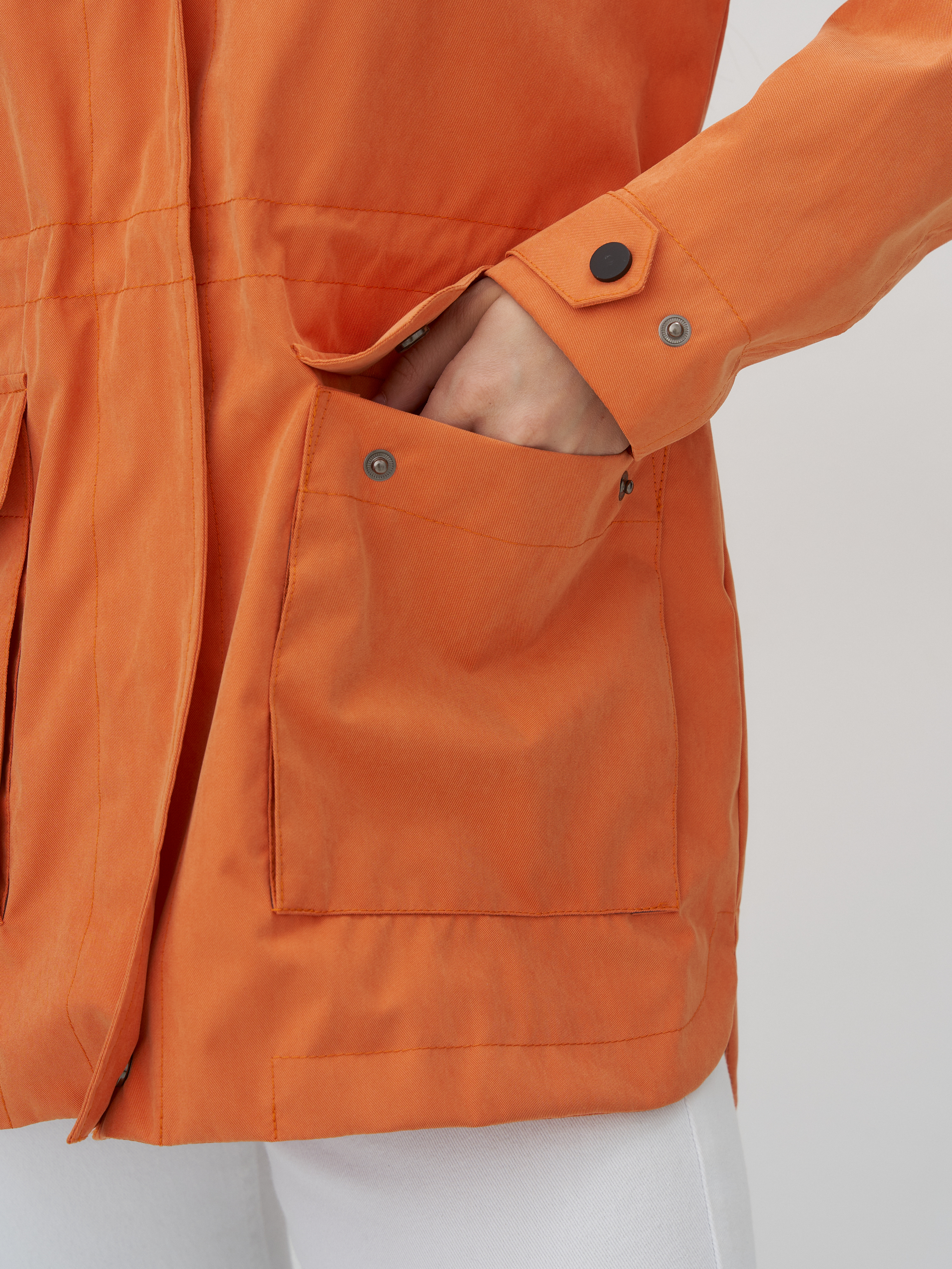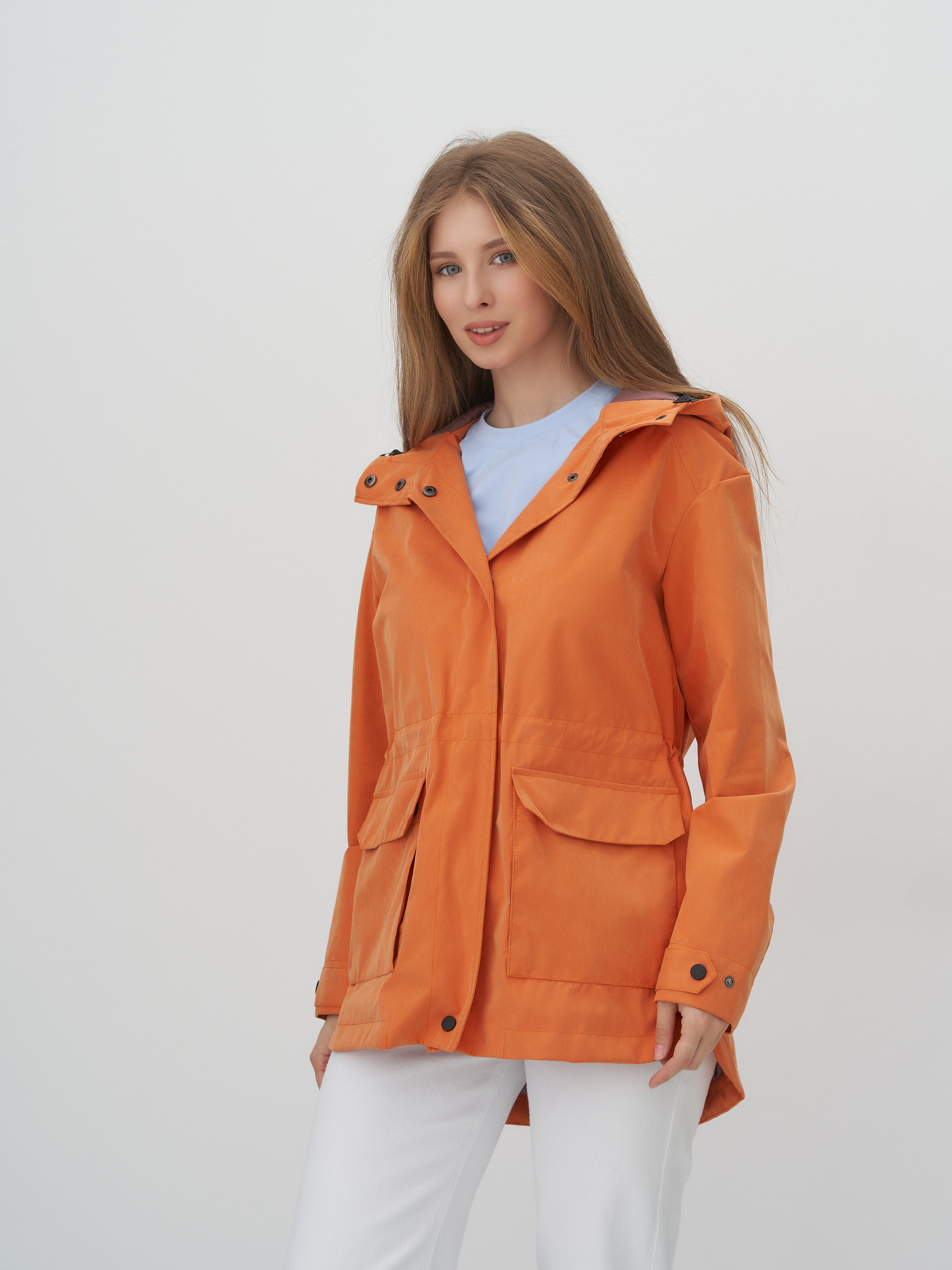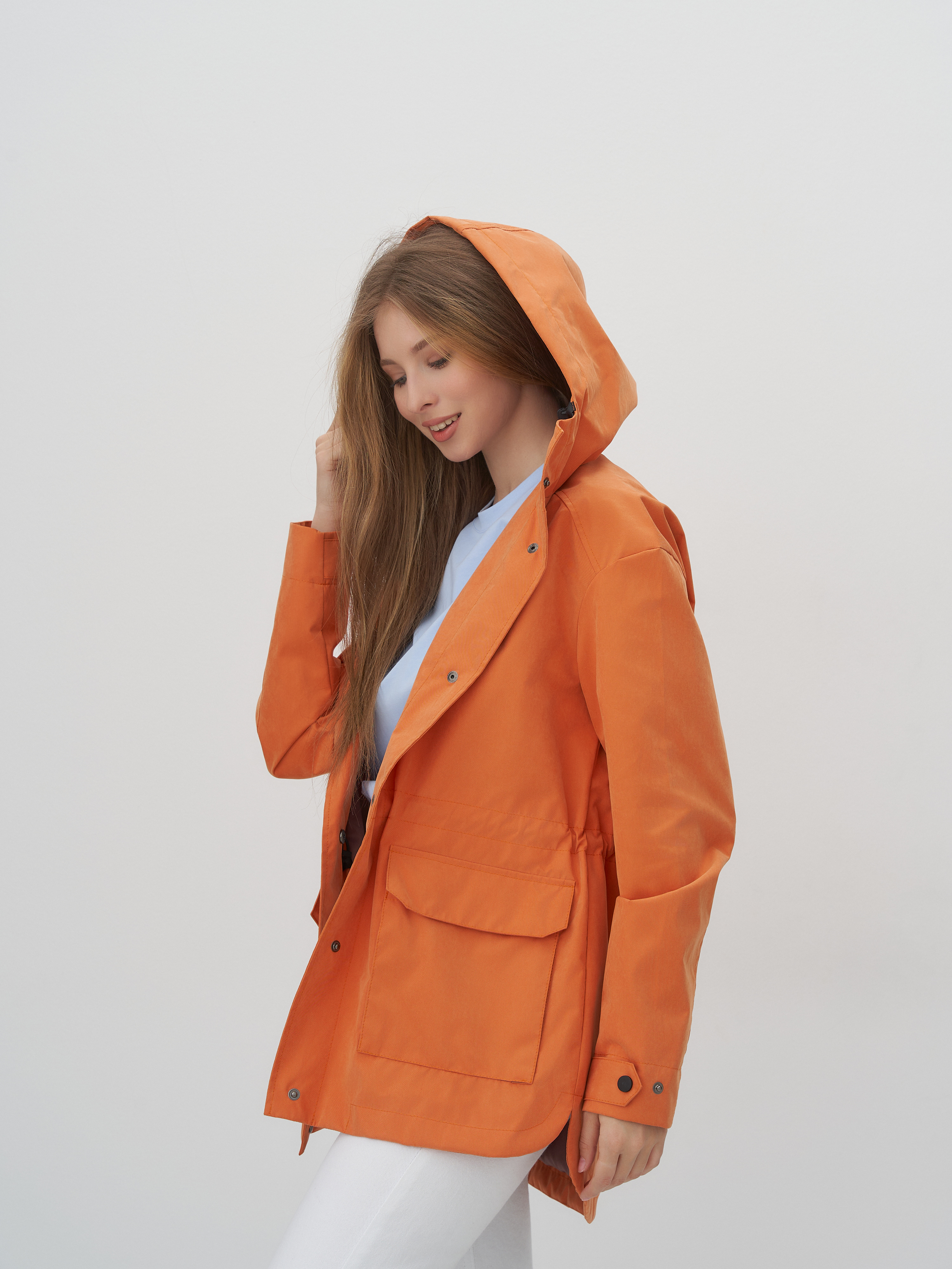 Детали ветровки: удобные внешние накладные карманы на кнопках, внутренняя утяжка на талии, регулируемые манжеты и глубокий регулируемый капюшон.