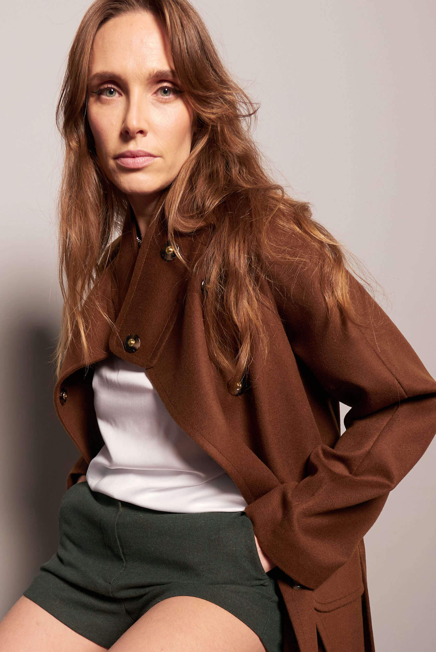 Укороченный тренч в сложном зелёном оттенке хаки. Невероятно приятное бархатистое полотно, трендовая длина и продуманный до мелочей дизайн изделия. Стилизуйте тренч в повседневных образах: как в расслабленных, так и в деловых. Или же играйте с цветом и фактурами, сочетая контрастные оттенки и текстуры. Тренч легко впишется в гардероб и дополнит базовые изделия или усложнит смелые образы. Параметры изделия: Размер S Полуобхват по линии талии 53 см Полуобхват по линии груди 54 см Длина по спинке 74 см Длина рукава от ворота 73 см Размер M Полуобхват по линии талии 57 см Полуобхват по линии груди 56 см Длина по спинке 75 см Длина рукава от ворота 74 см Размер L Полуобхват по линии талии 61 см Полуобхват по линии груди 58 см Длина по спинке 76 см Длина рукава от ворота 75 см Параметры модели: 77-59-80 Рост модели: 173 см Размер изделия на модели: S Уход: сухая чистка, химчистка