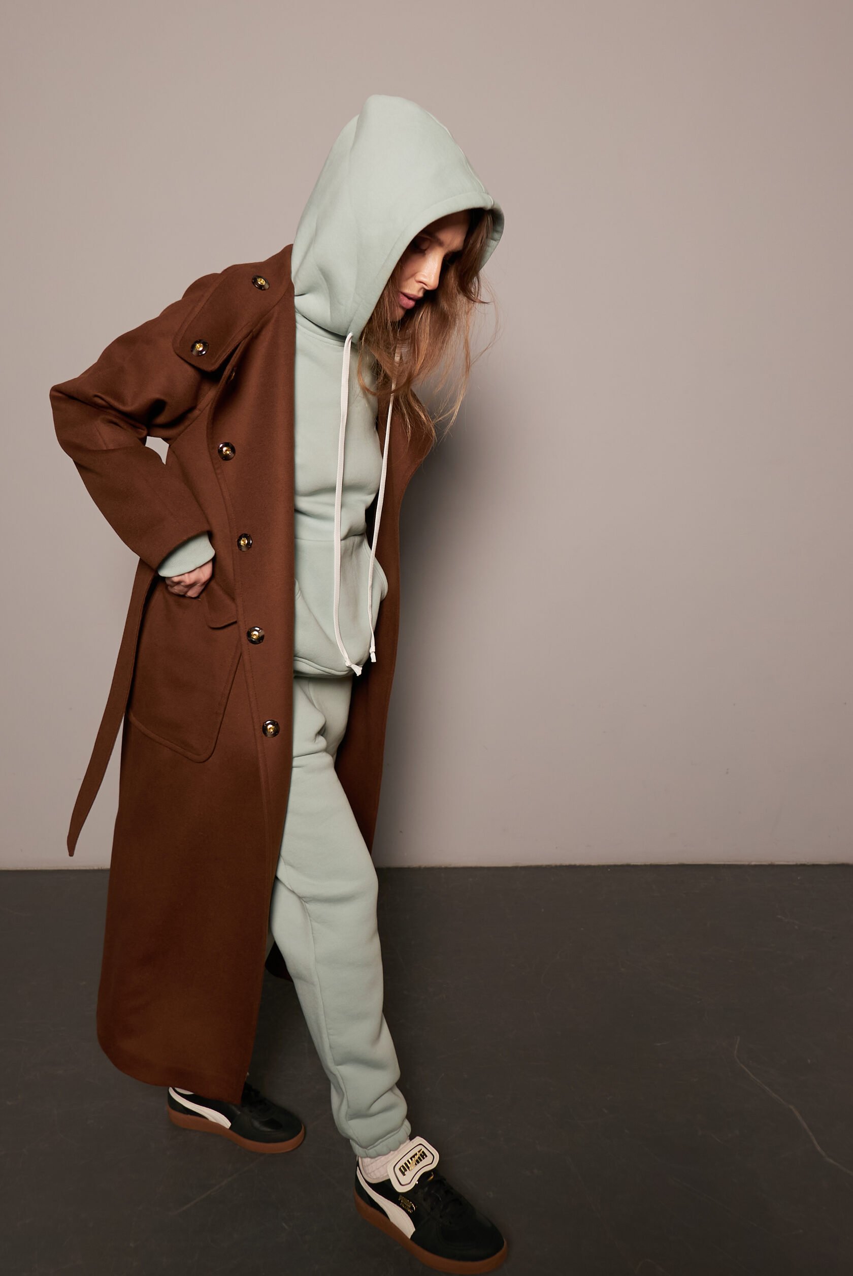 Одно из важнейших требований к верхней одежде – удобство и тепло. В этой модели мы учли и реализовали оба этих качества, не забыв про визуальную составляющую. За счёт спущенной линии плеча и свободного кроя под пальто можно надеть объёмный свитер или жакет. При заказе есть возможность выбрать одно из двух видов утепления до -5 или -10/-15 градусов. Высокий воротник-стойка, застёжка на кнопки и глубокие карманы также стоят на страже сохранения тепла. В комплект мы добавили съёмный пояс из такого же материала. Длина изделия: 117 см