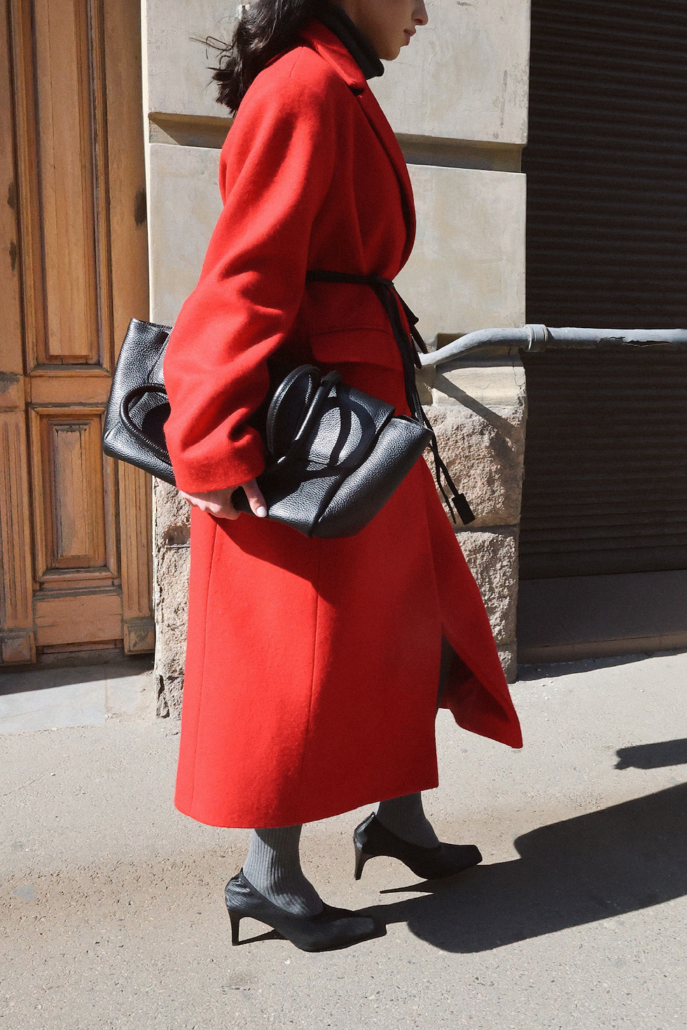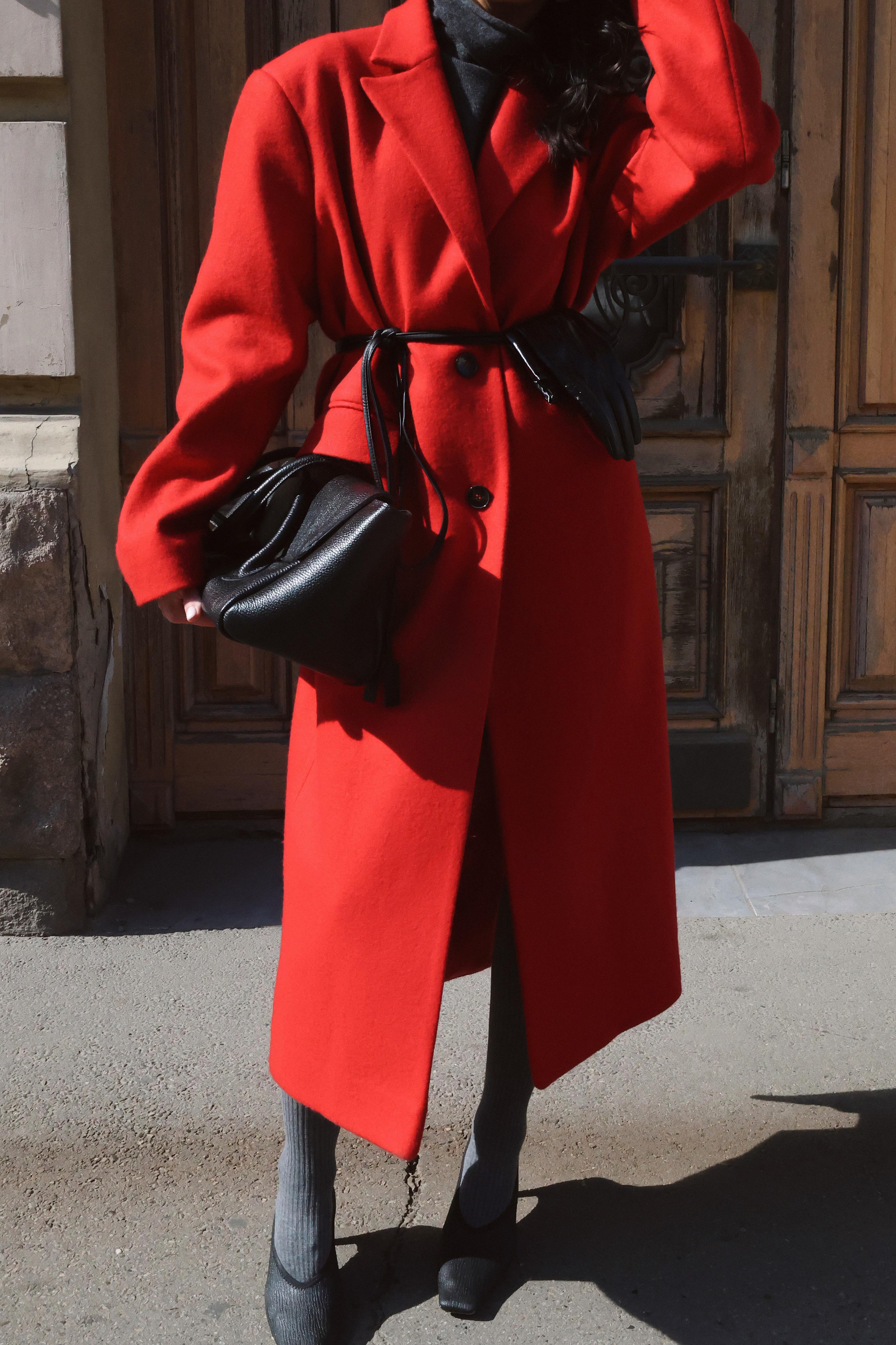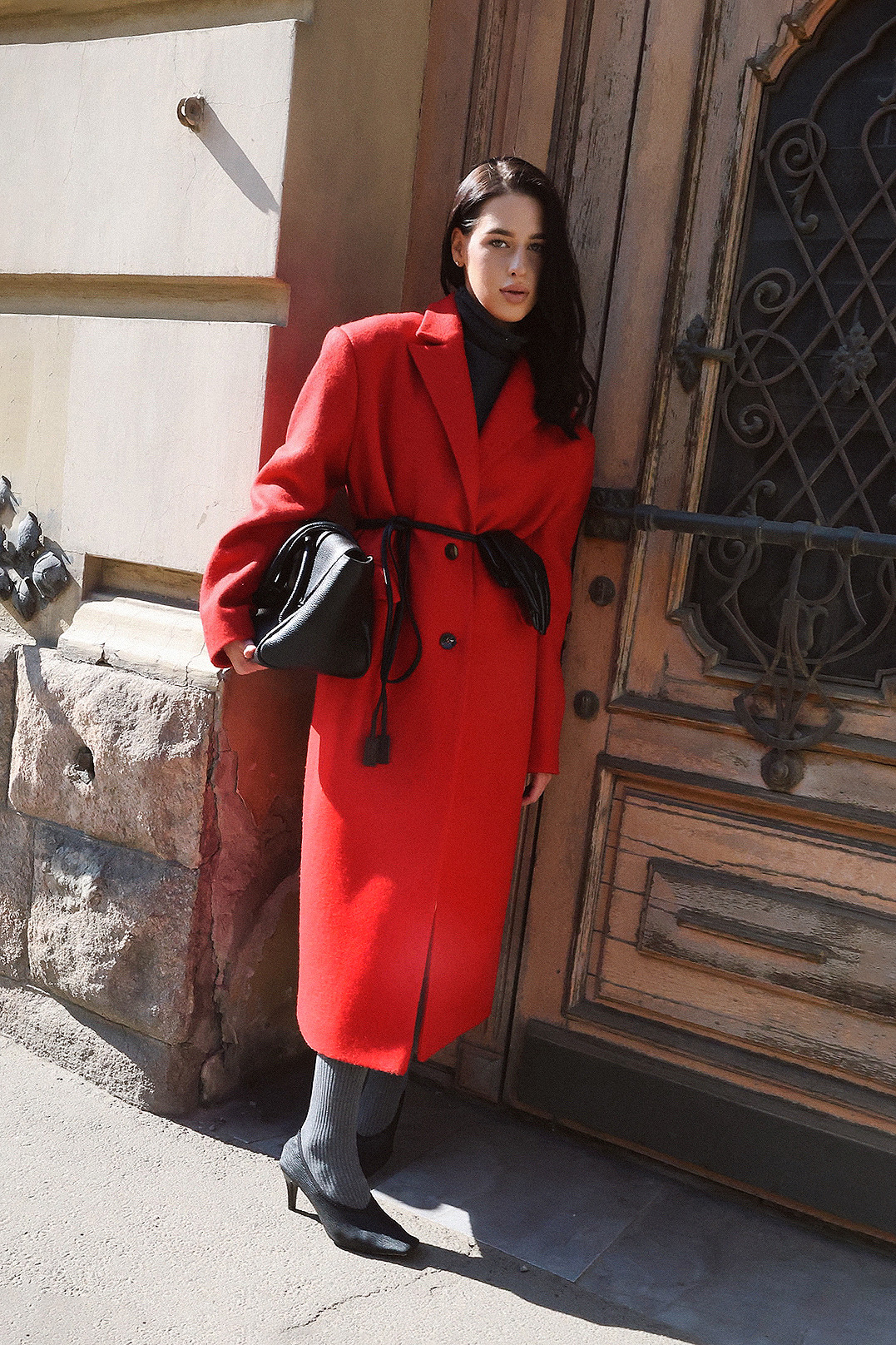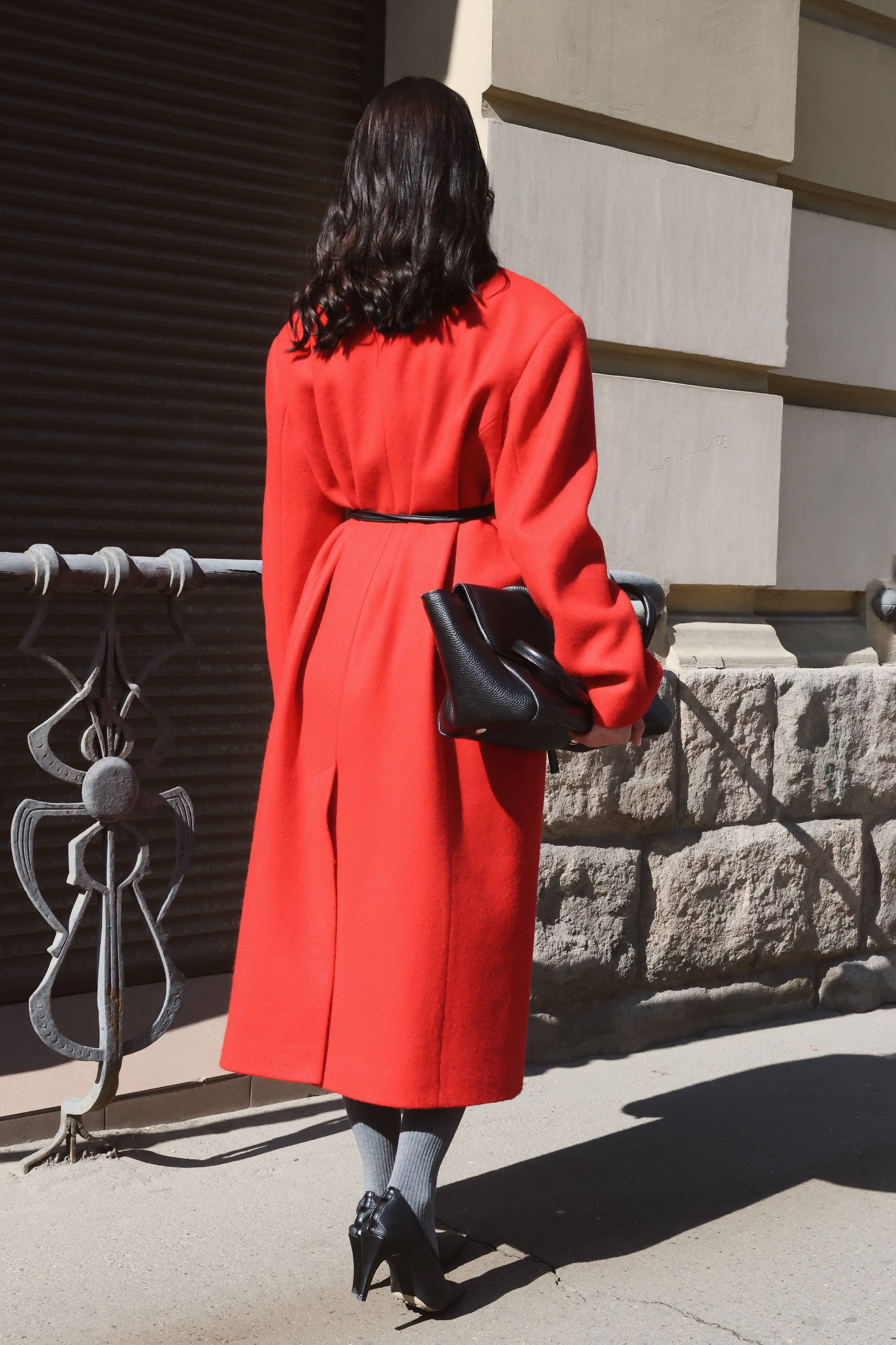 Пальто прямого кроя. Детали: акцентное плечо, застежка на пуговицы, карманы с клапанами, шлица на спинке.