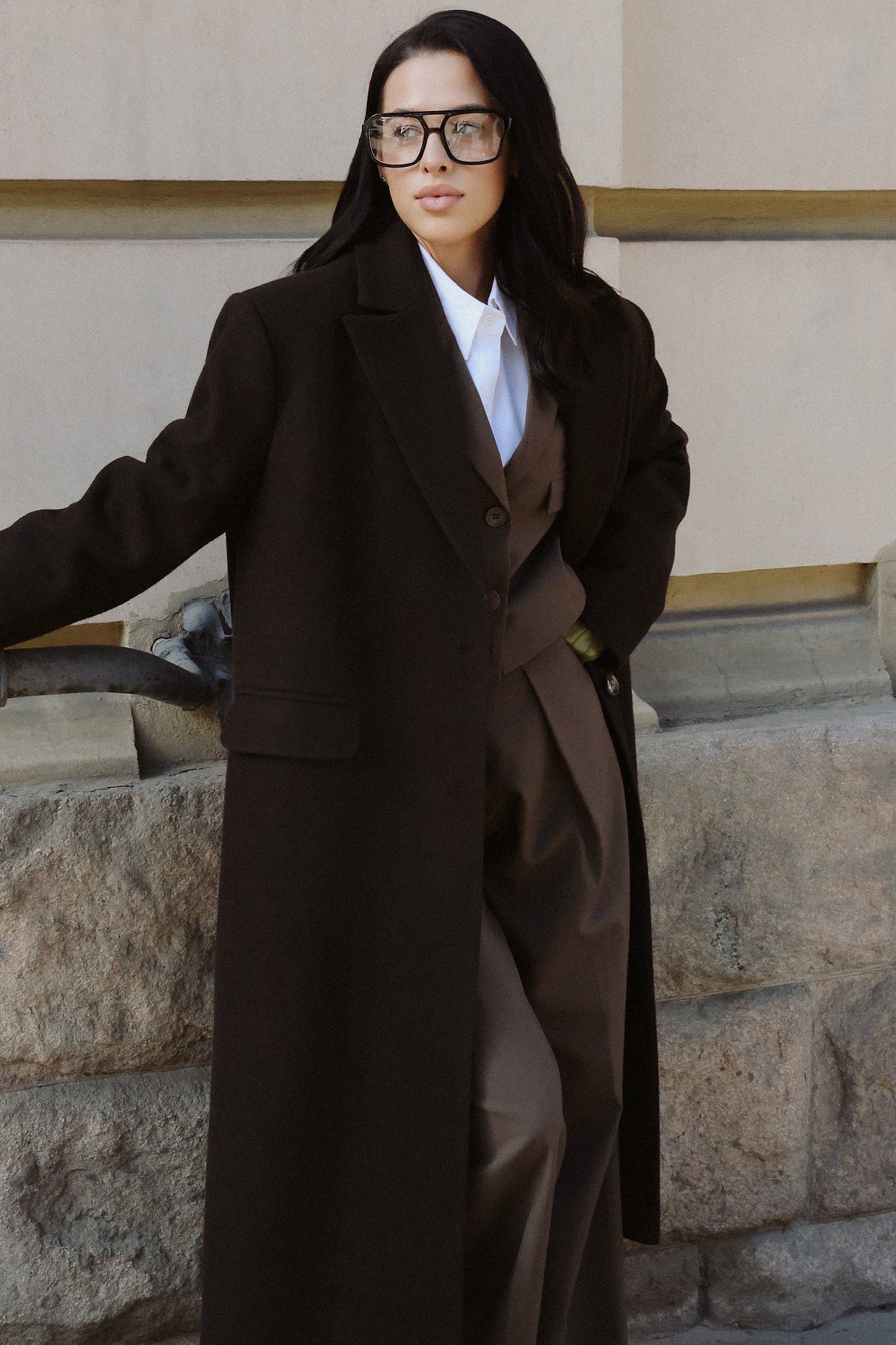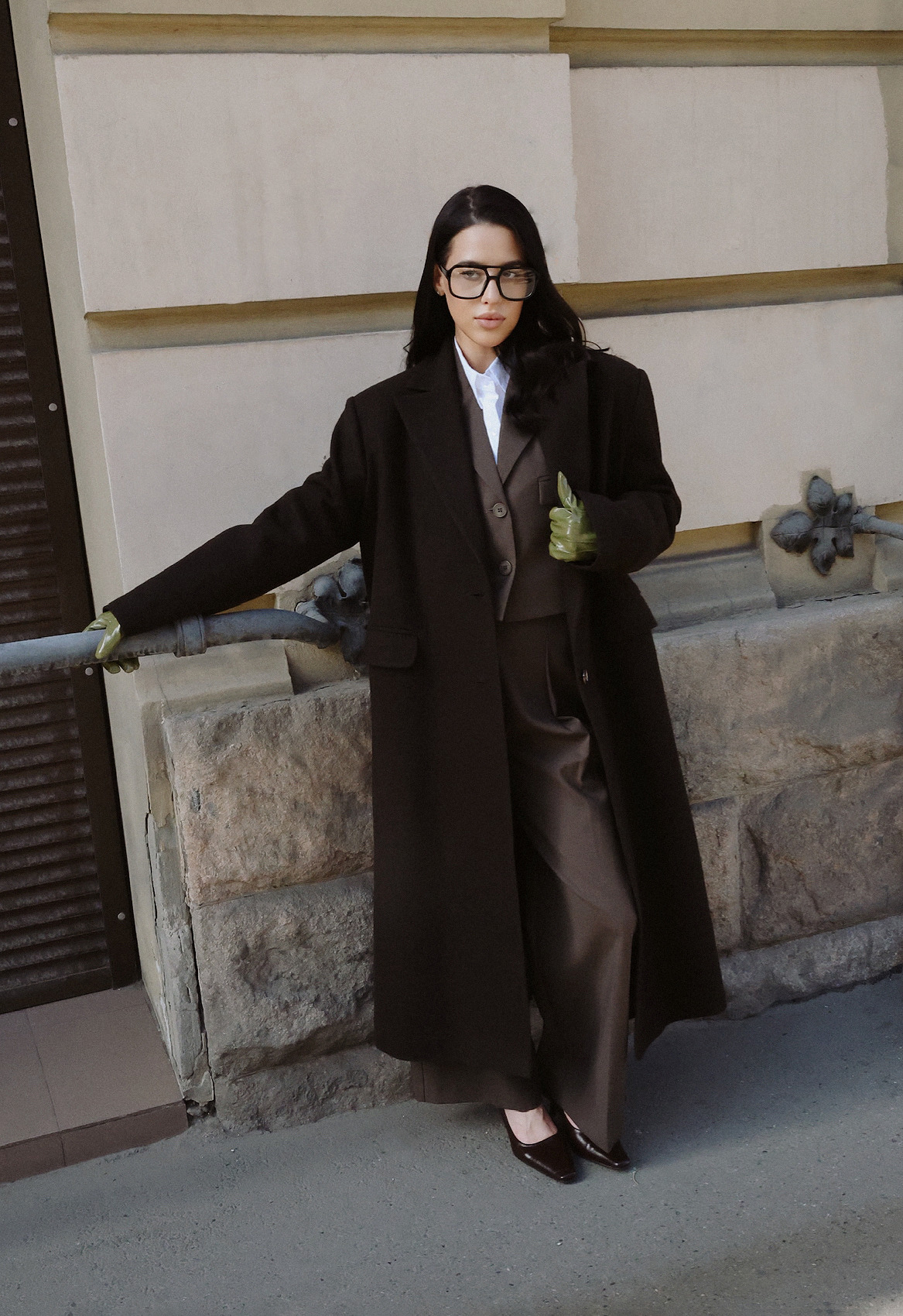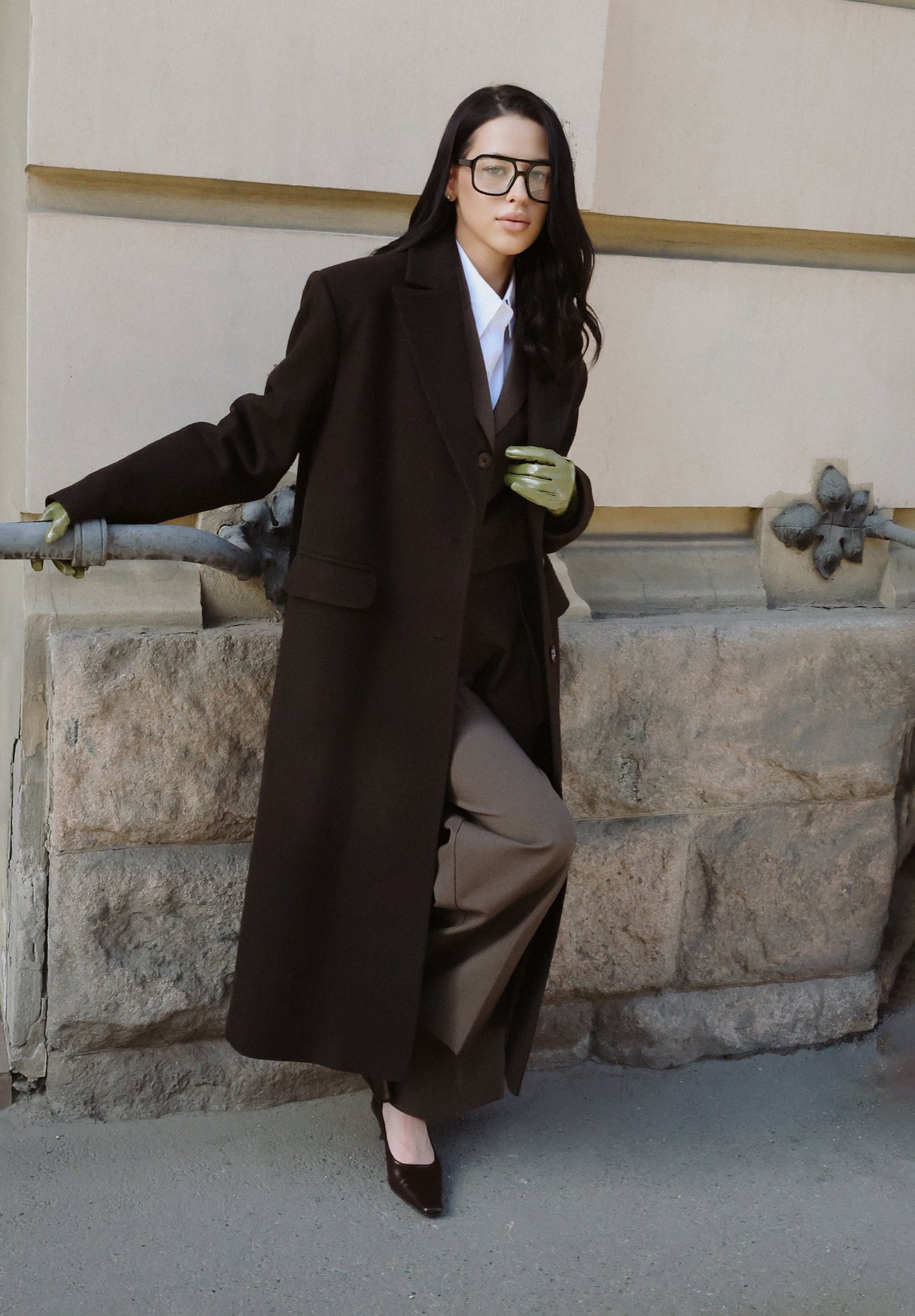 Пальто прямого кроя. Детали: акцентное плечо, застежка на пуговицы, карманы с клапанами, шлица на спинке.