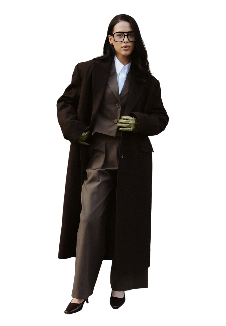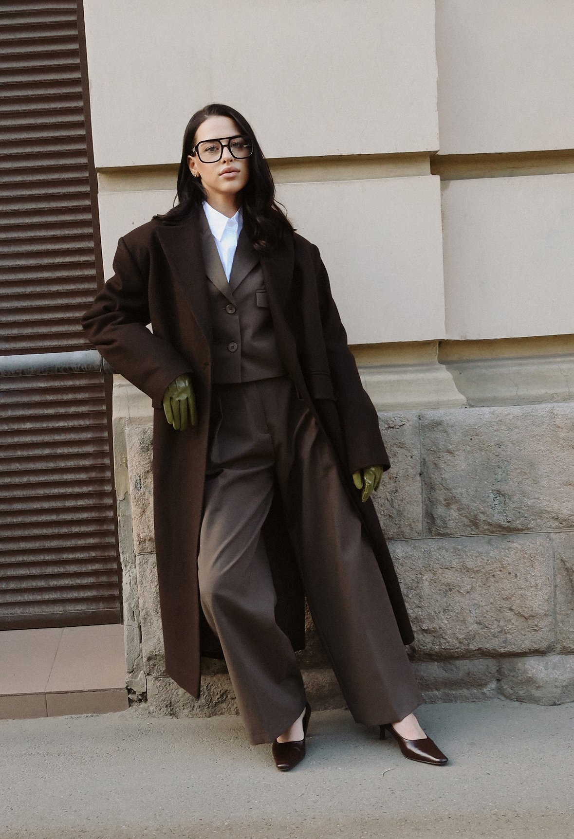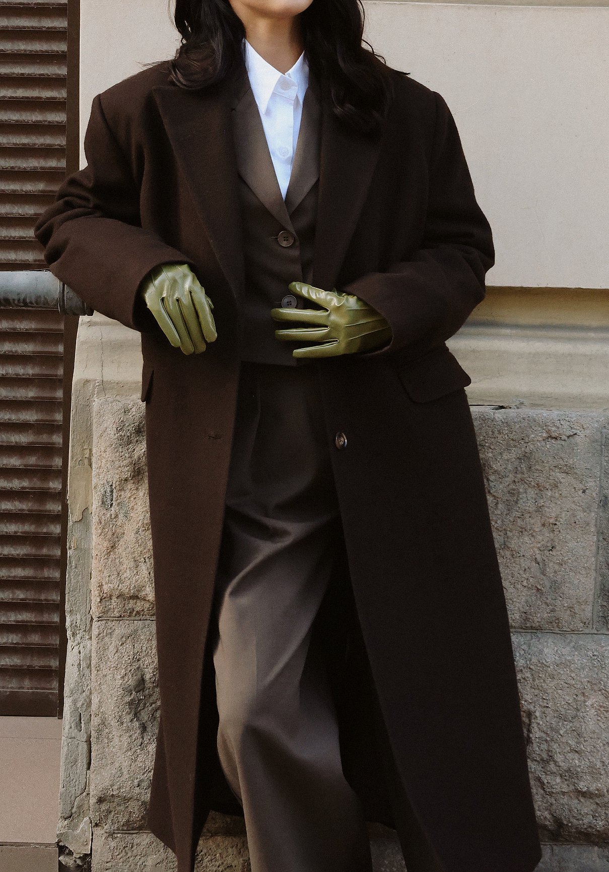 Пальто прямого кроя. Детали: акцентное плечо, застежка на пуговицы, карманы с клапанами, шлица на спинке.