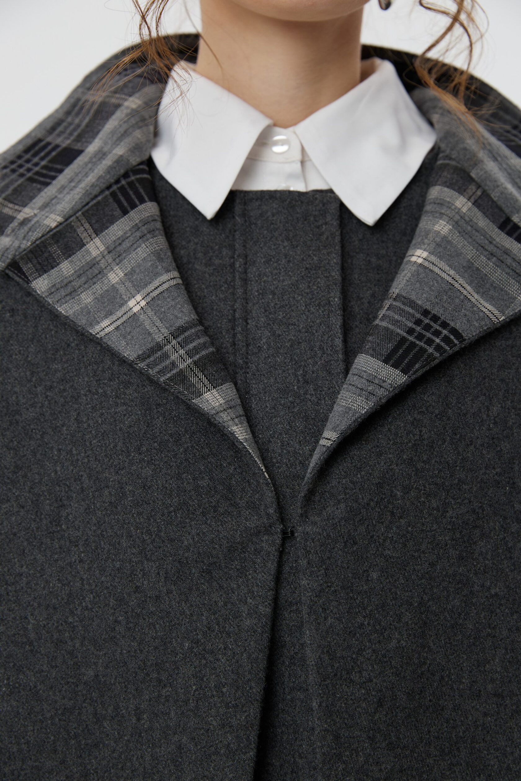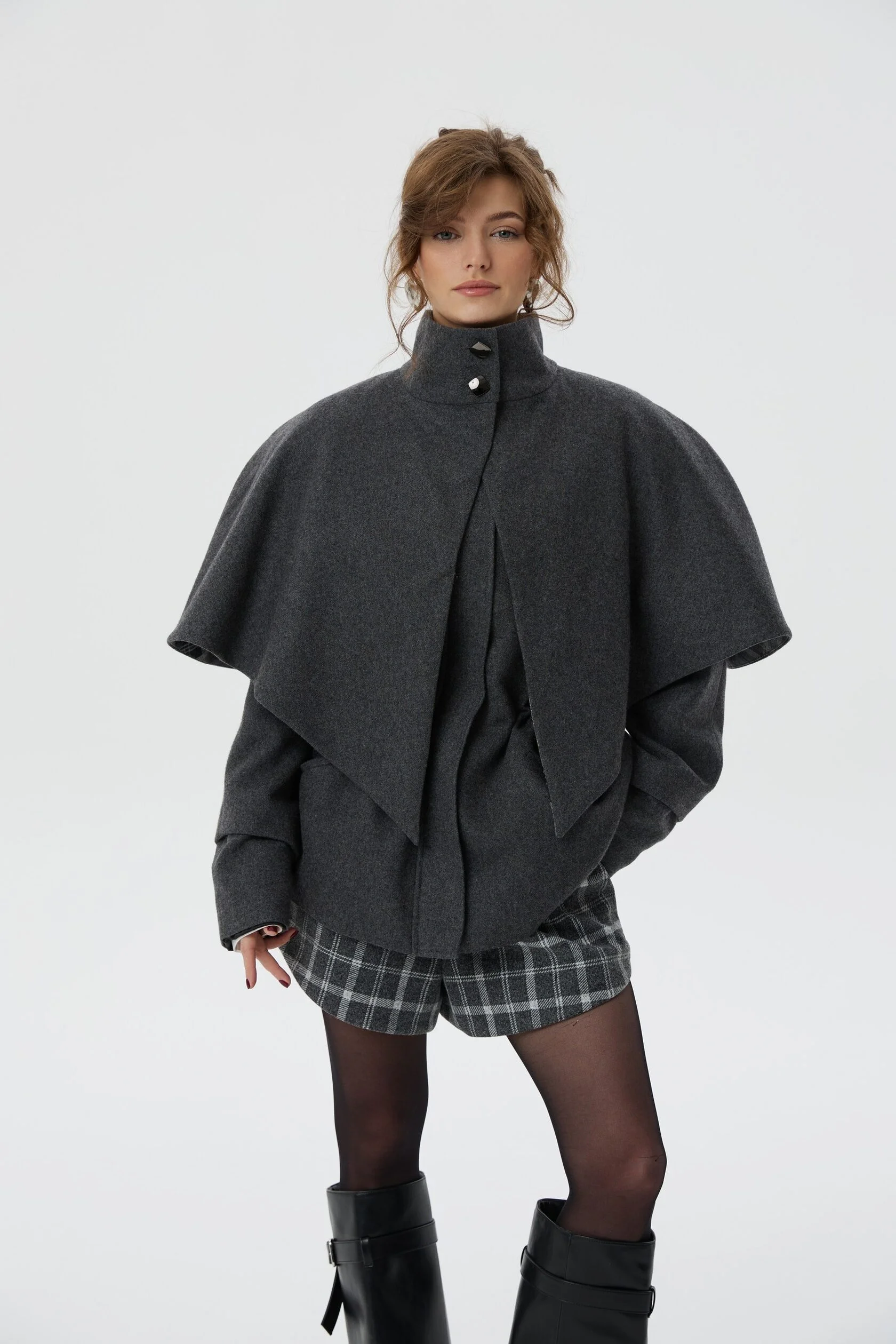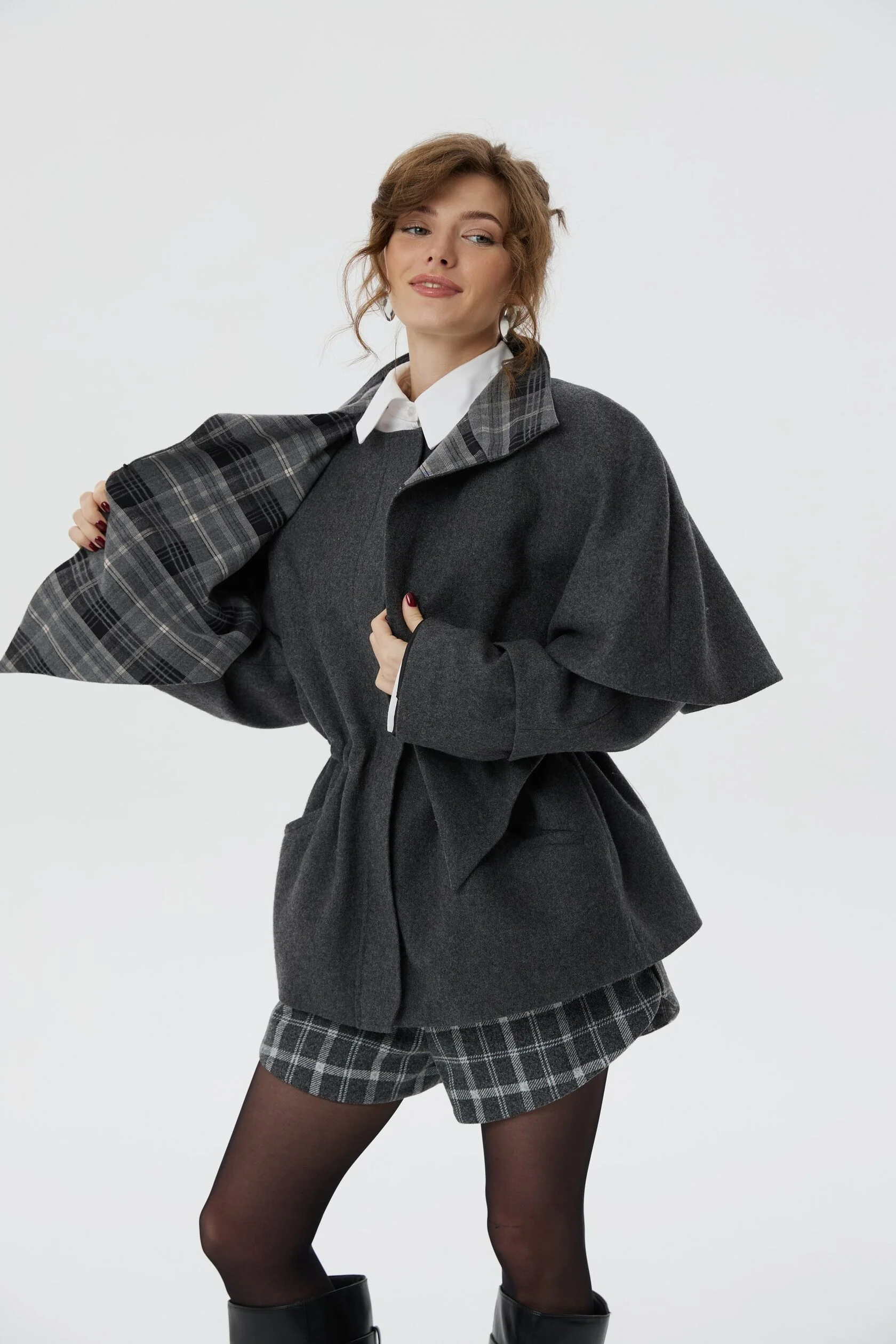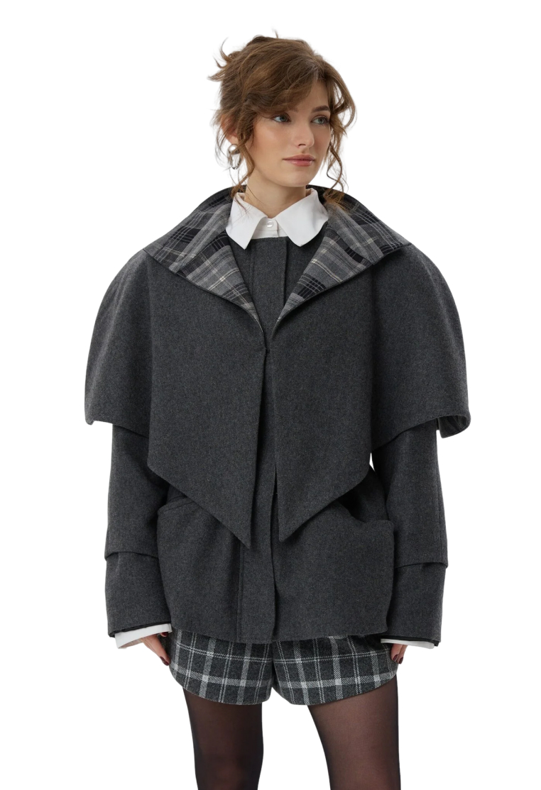 Пальто Шерлок сделано из тонкой пальтовой ткани, в составе которой 50% шерсти. Все внимание в этом изделии приковано к воротнику-стойке, который вместе с отлетной накидкой-кейпом создает многослойность, а благородная клетка игриво выглядывает из-под него. Плечи подчеркнуты формоустойчивыми подплечниками, а на талии расположена кулиса, благодаря которой можно придавать пальто разные силуэты.