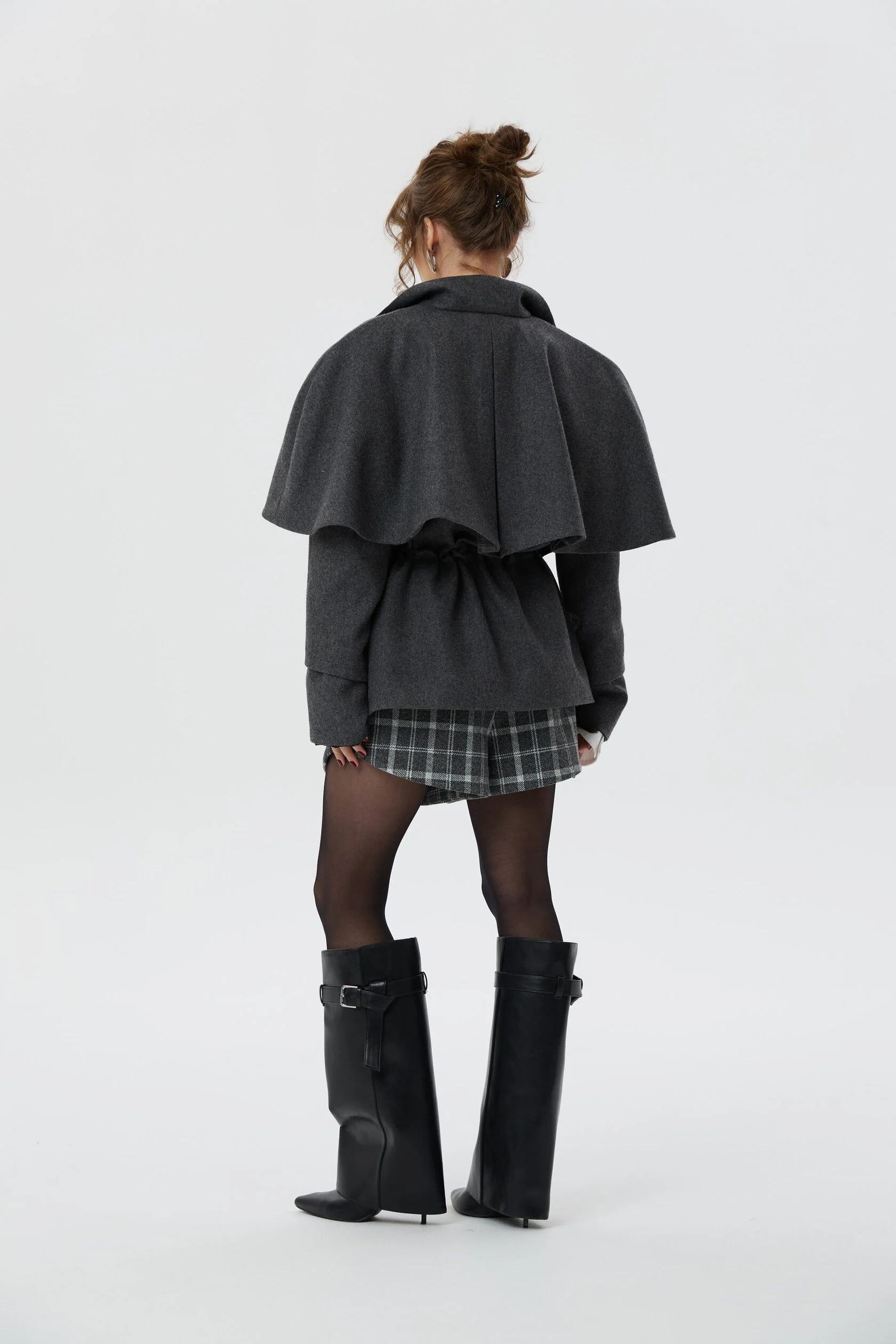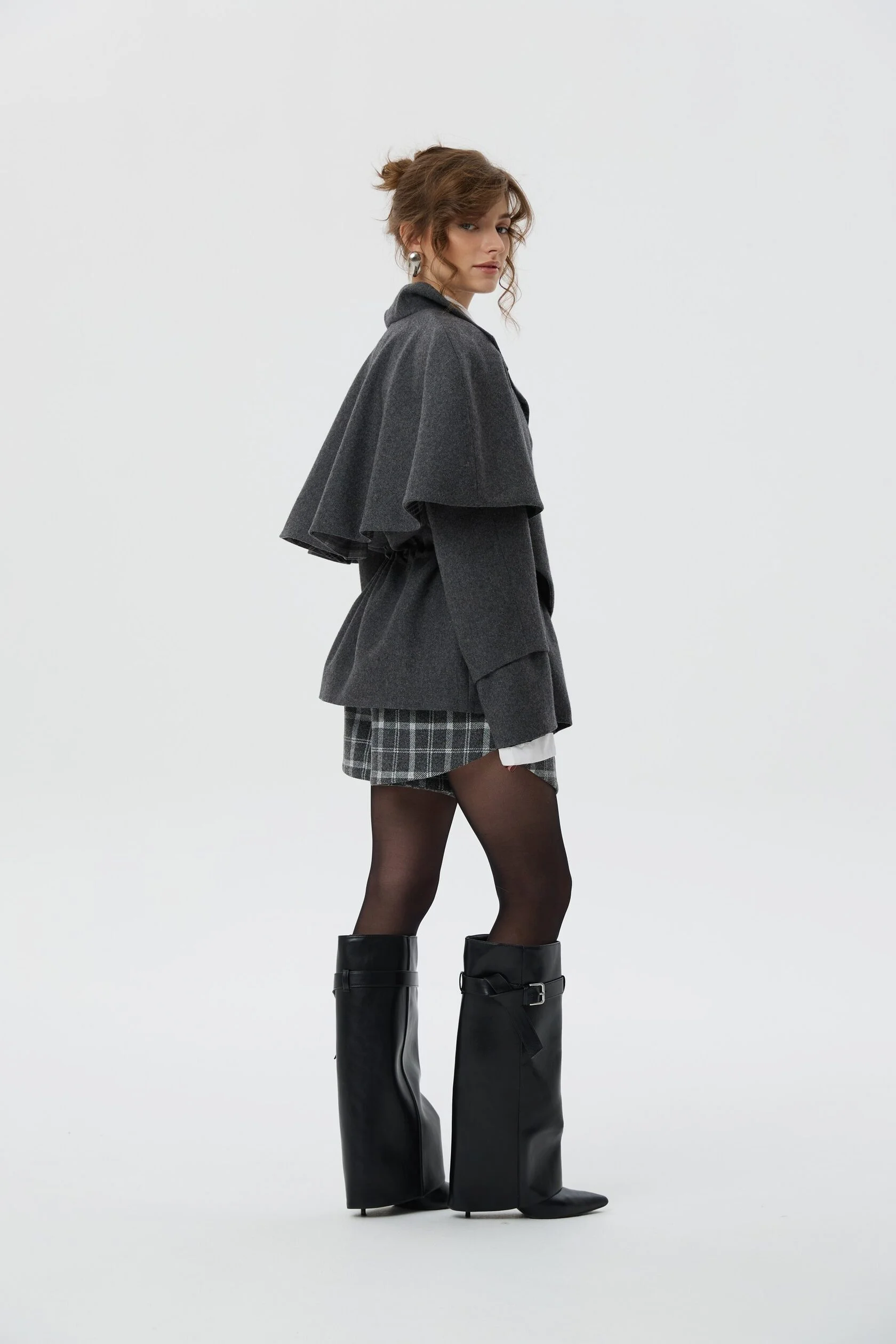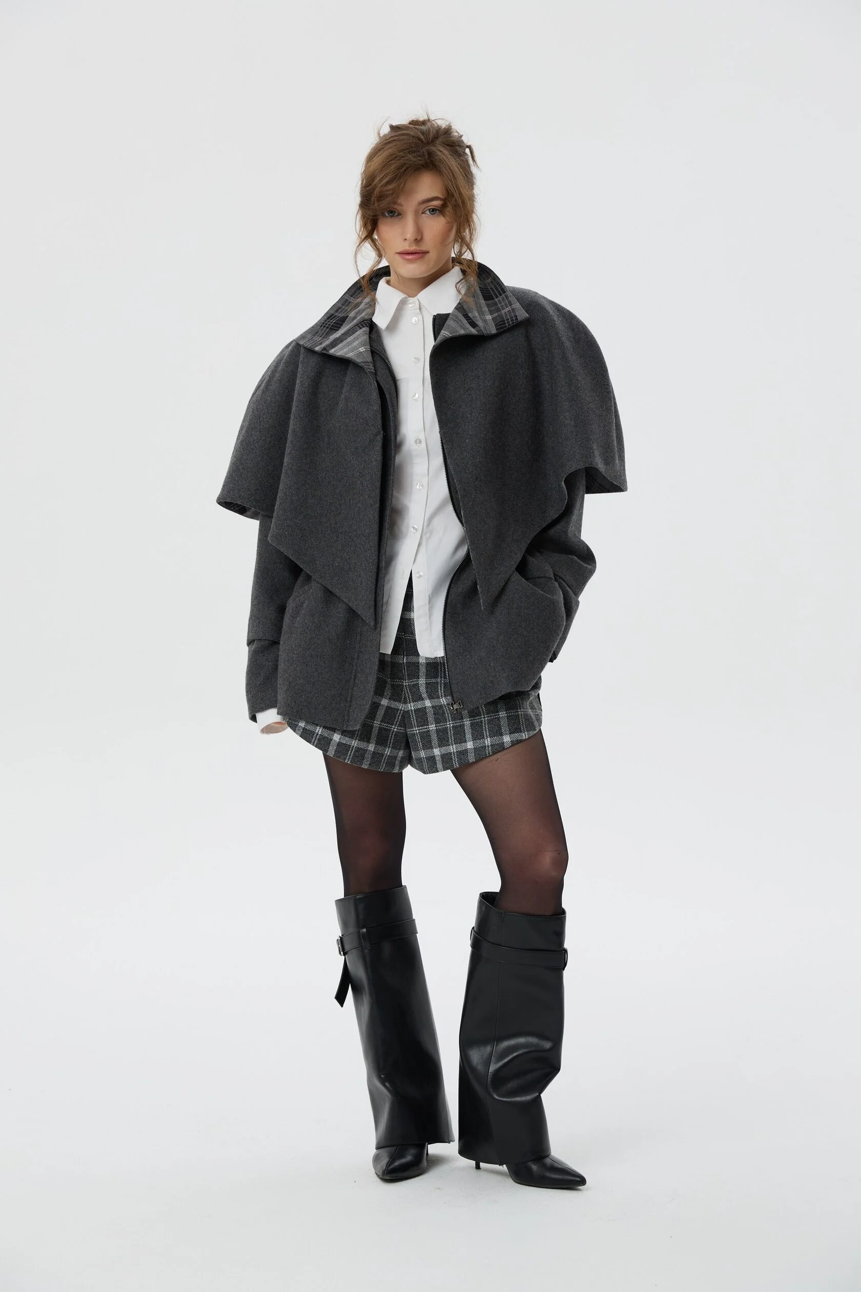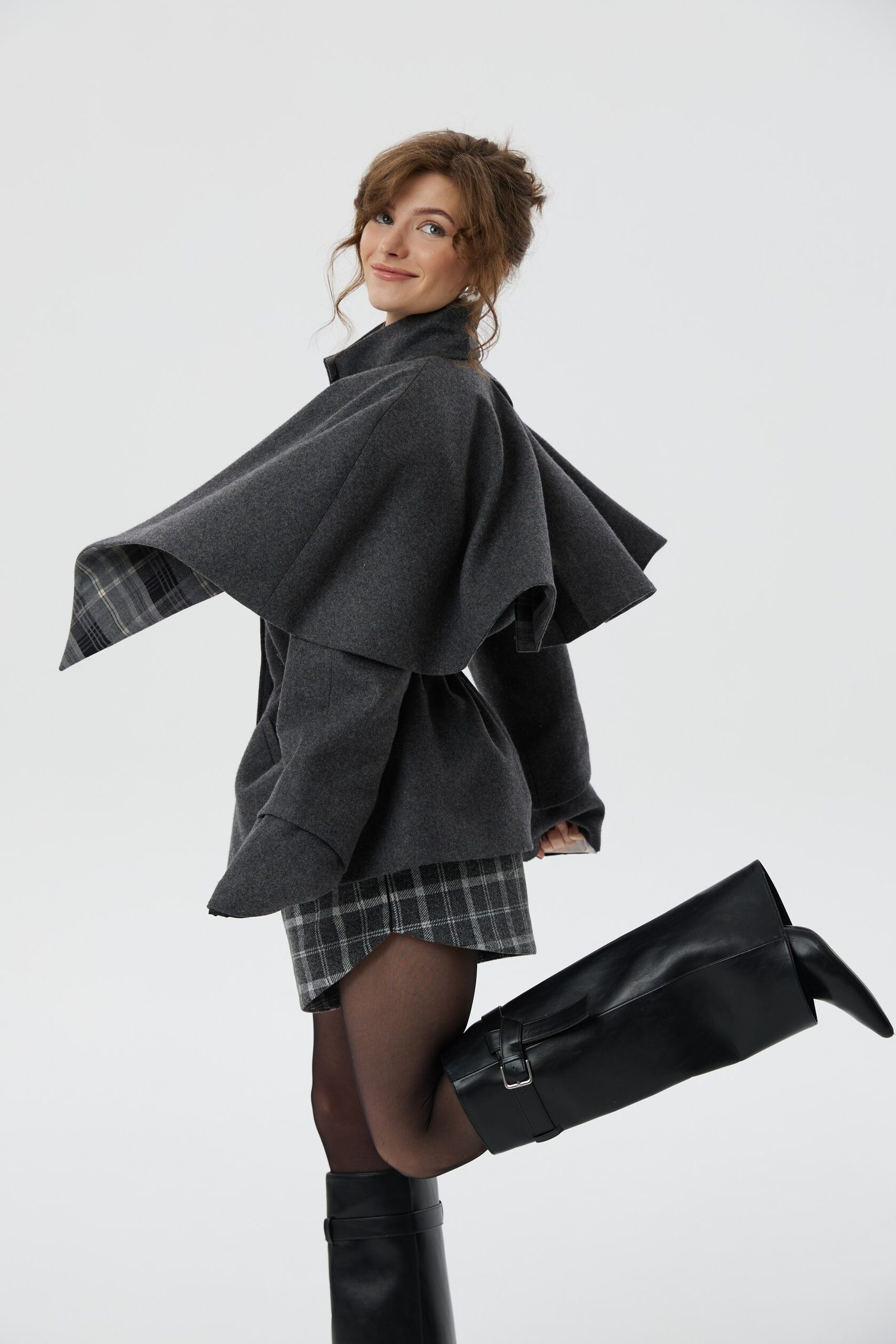 Пальто Шерлок сделано из тонкой пальтовой ткани, в составе которой 50% шерсти. Все внимание в этом изделии приковано к воротнику-стойке, который вместе с отлетной накидкой-кейпом создает многослойность, а благородная клетка игриво выглядывает из-под него. Плечи подчеркнуты формоустойчивыми подплечниками, а на талии расположена кулиса, благодаря которой можно придавать пальто разные силуэты.