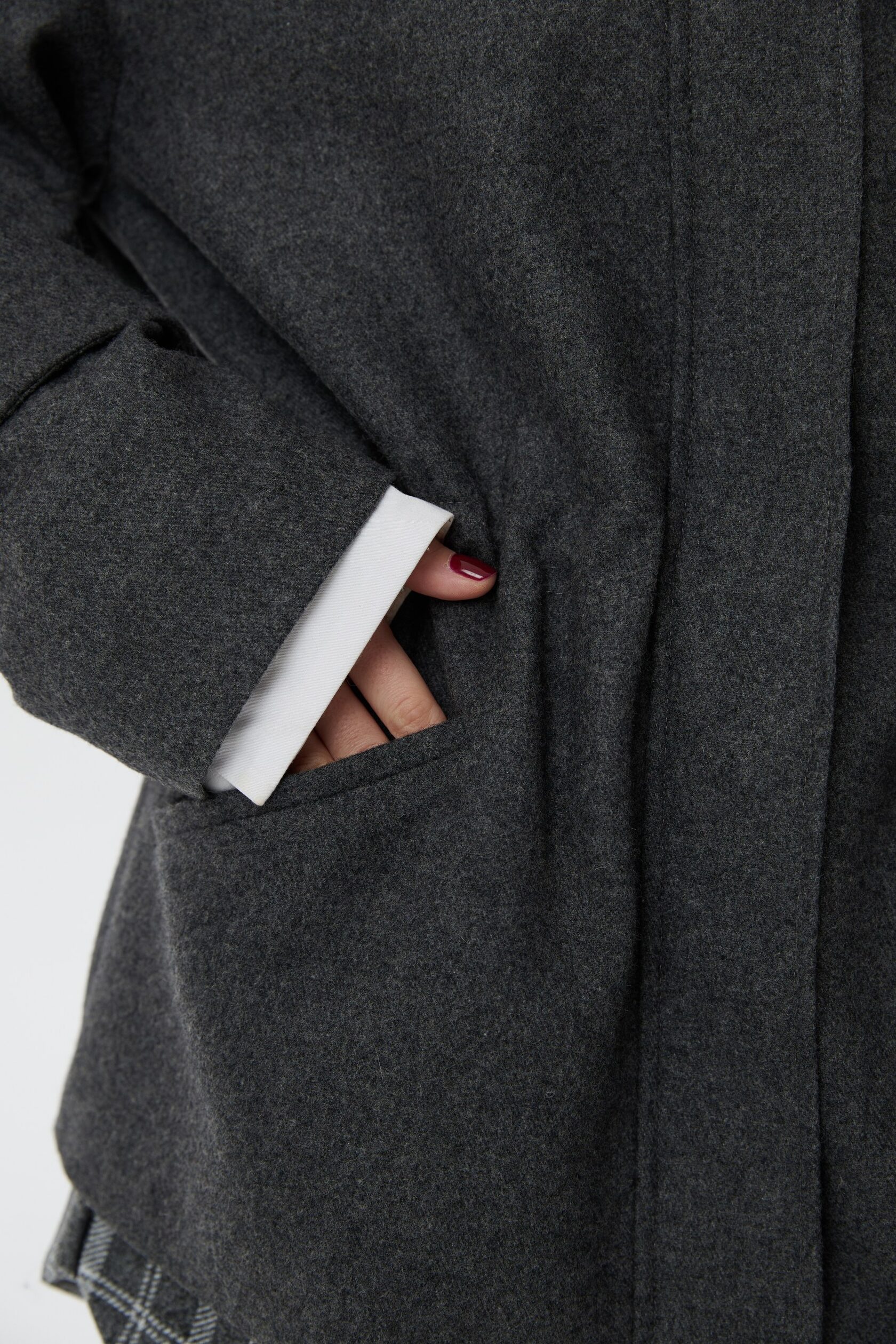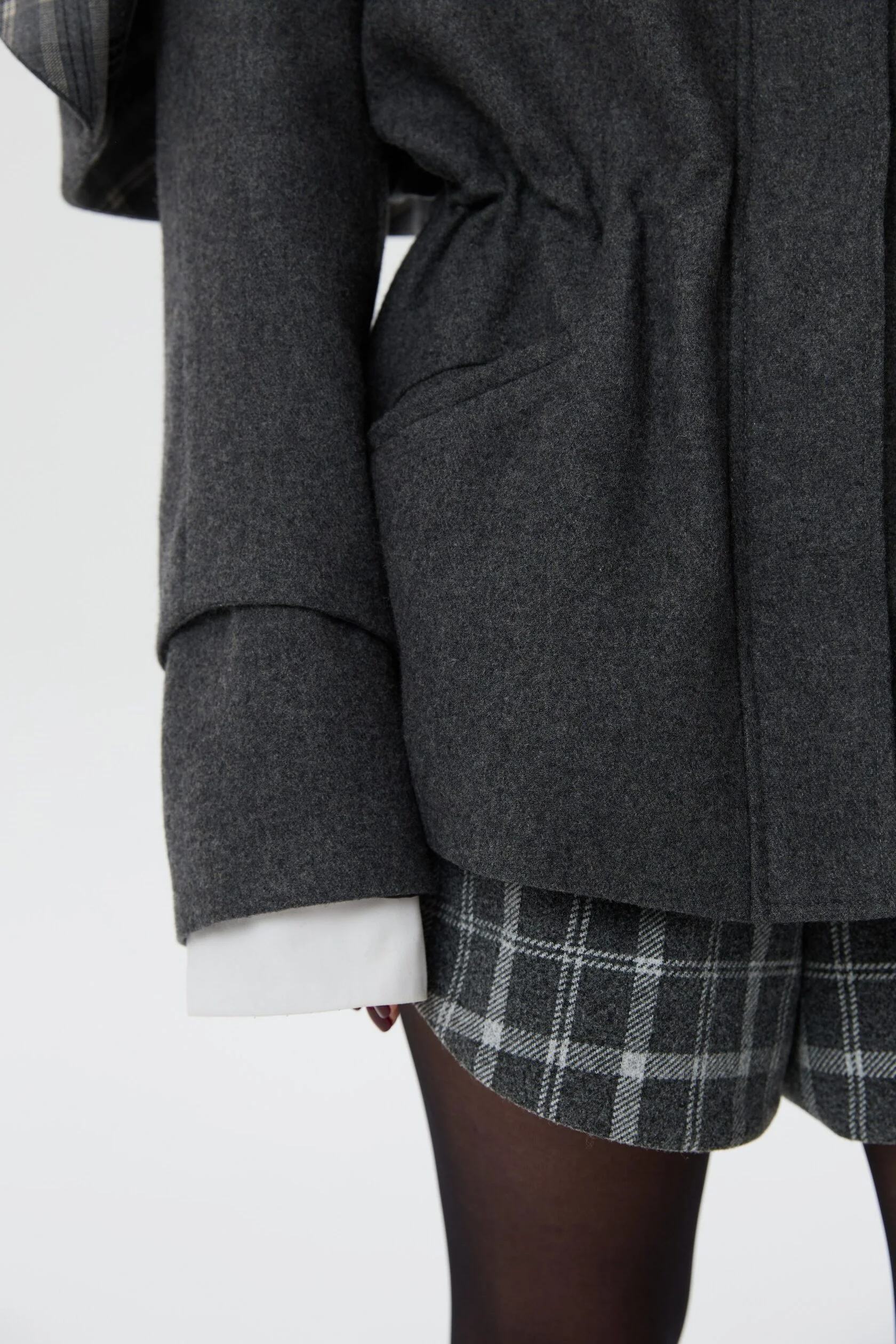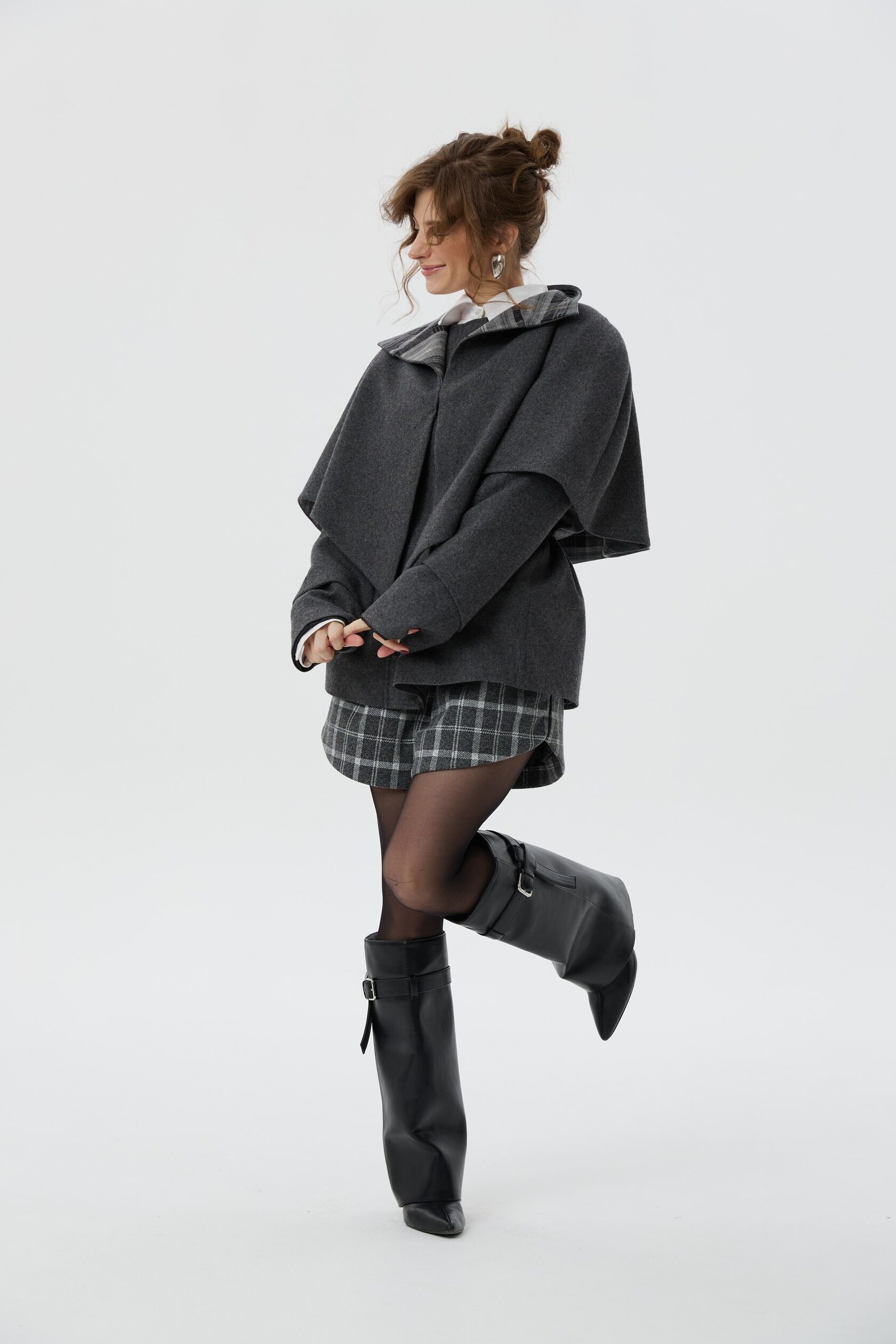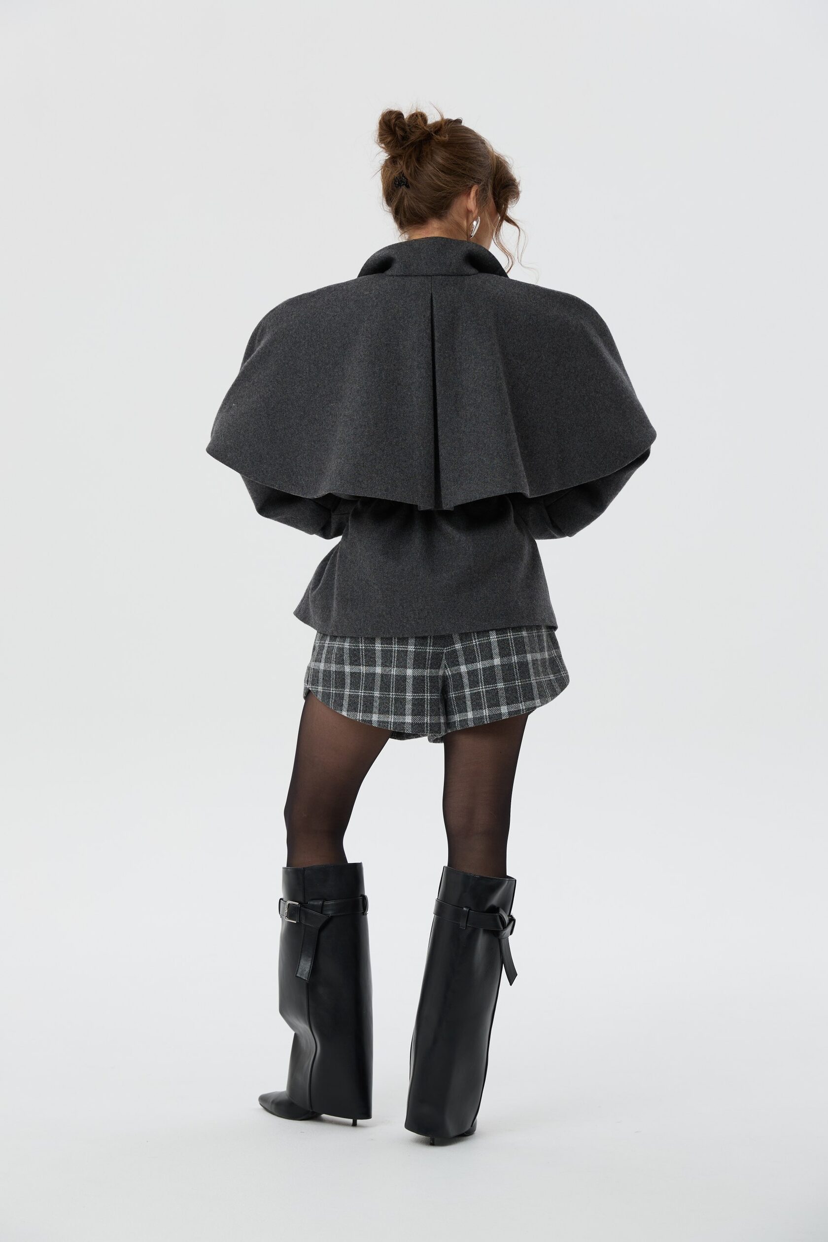 Пальто Шерлок сделано из тонкой пальтовой ткани, в составе которой 50% шерсти. Все внимание в этом изделии приковано к воротнику-стойке, который вместе с отлетной накидкой-кейпом создает многослойность, а благородная клетка игриво выглядывает из-под него. Плечи подчеркнуты формоустойчивыми подплечниками, а на талии расположена кулиса, благодаря которой можно придавать пальто разные силуэты.