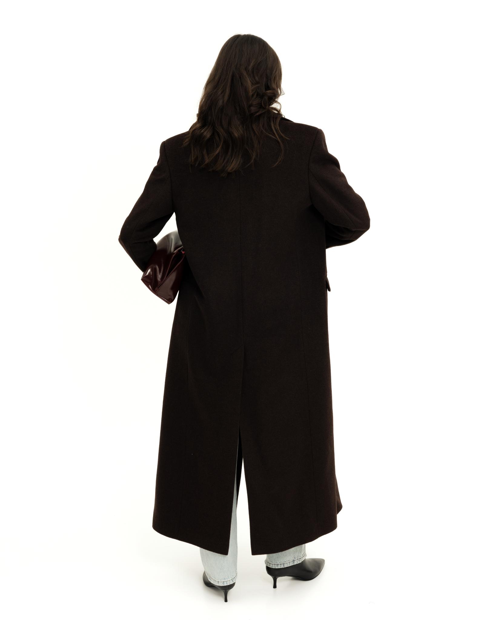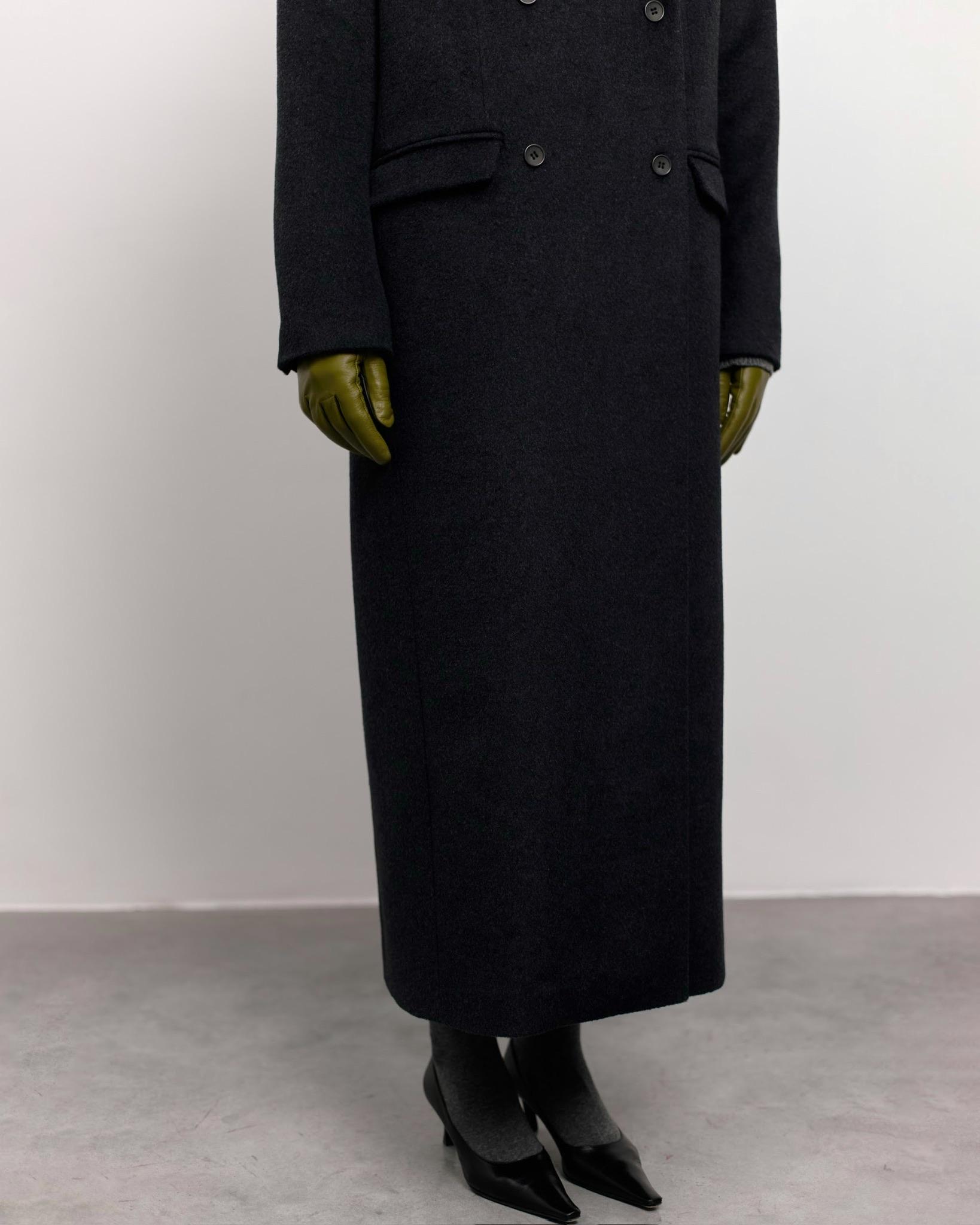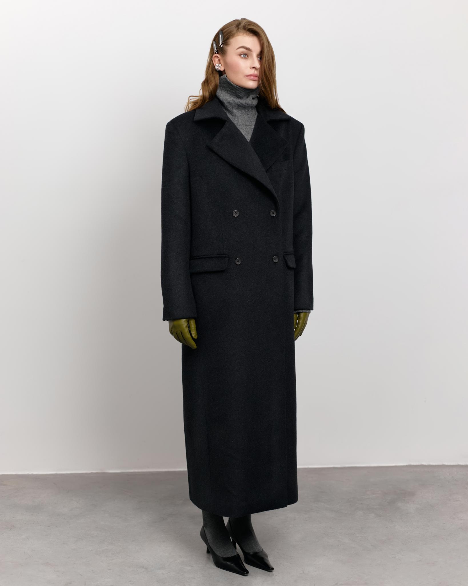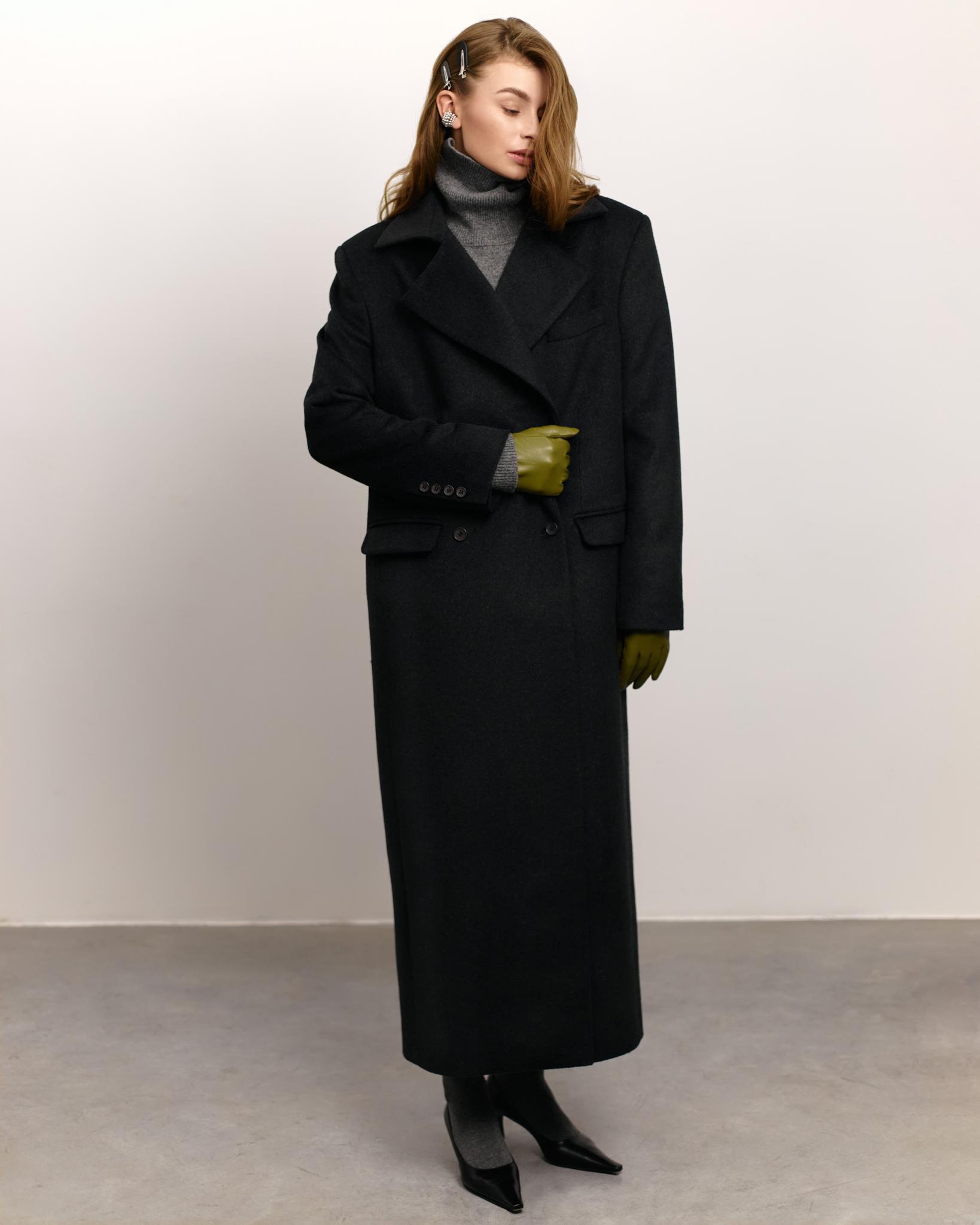 Двубортное шерстяное пальто THE COAT свободного кроя с английским воротником на подкладке - самый незаменимый элемент гардероба. Имеет боковые карманы и застегивается на пуговицы. Высокая шлица сзади дает возможность продемонстрировать стройность ваших ног, а так же обеспечивает свободу движений.