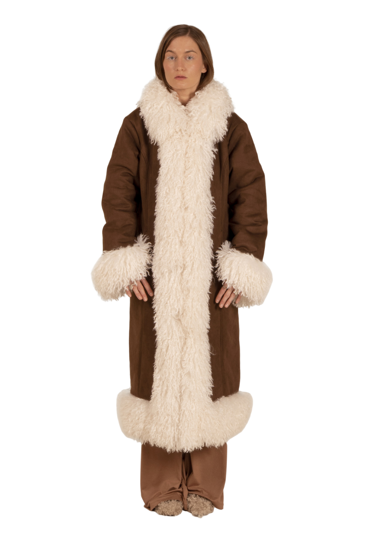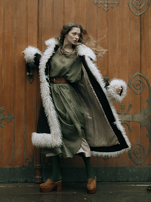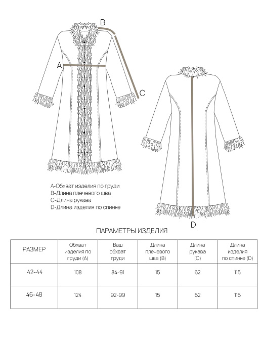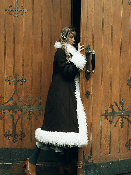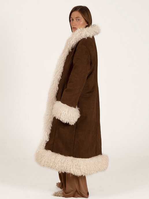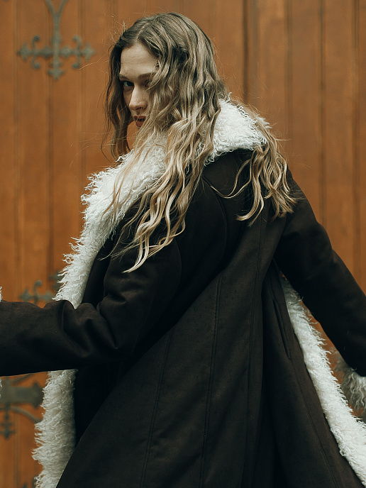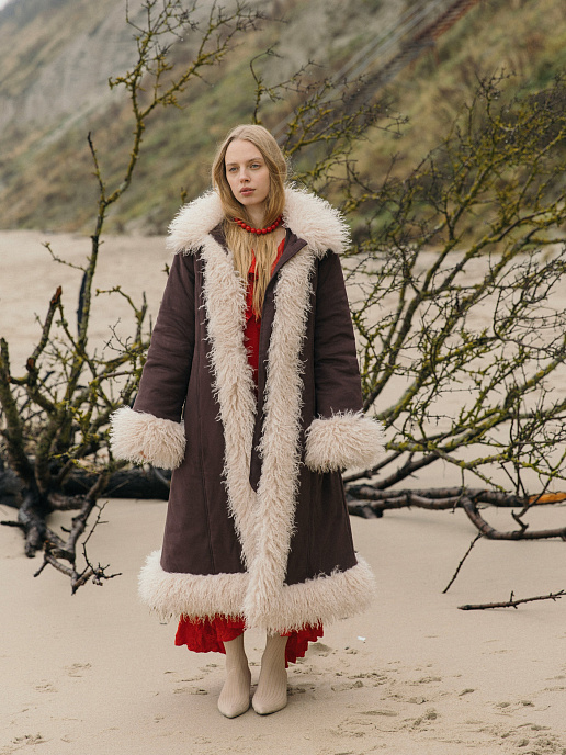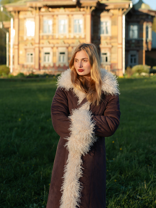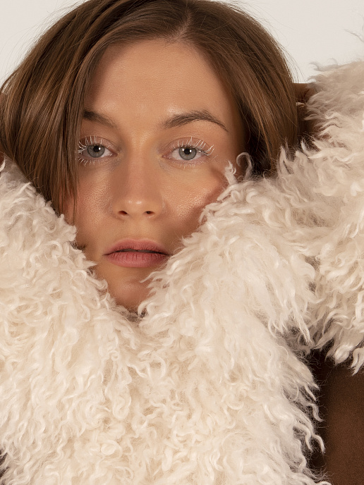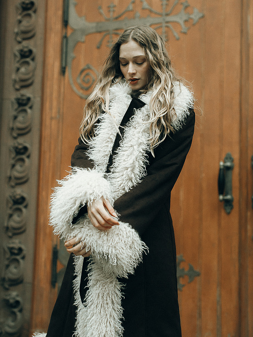 Роскошная отделка- эффектная оторочка из меха типа «лама» по воротнику, бортам, низу изделия и манжетам.