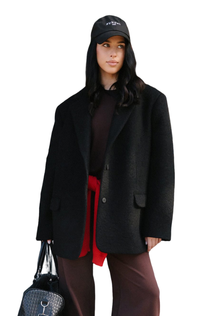 Пиджак-пальто oversize кроя из драпа букле. Плотная, износостойкая ткань без предрасположенности к пилингу. Сохранение тепла за счет большого содержания шерсти. Застежка на пуговицы; два кармана с клапаном; шлица на спинке.