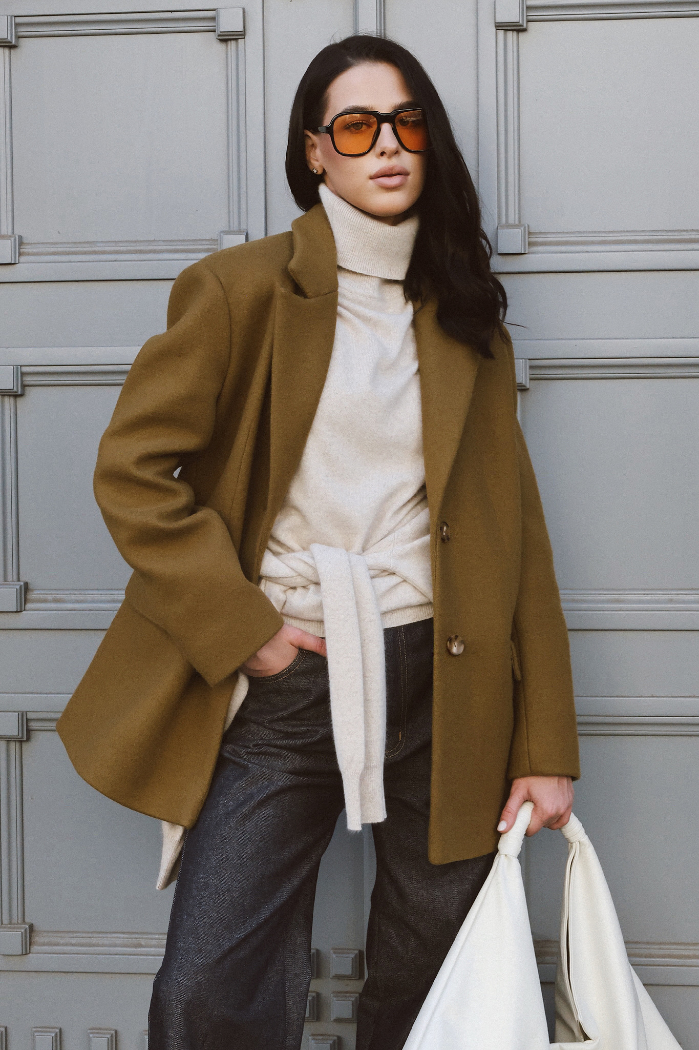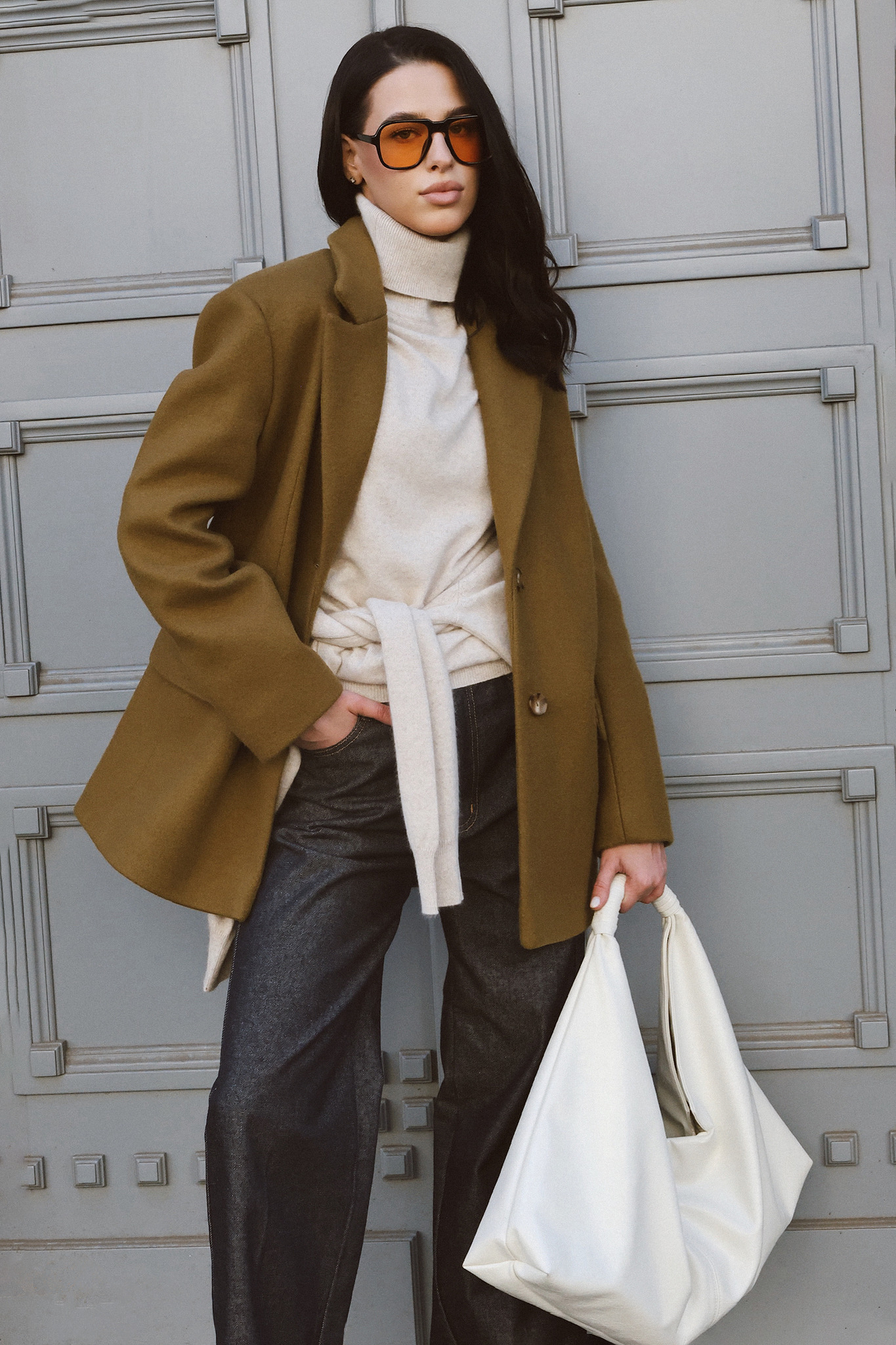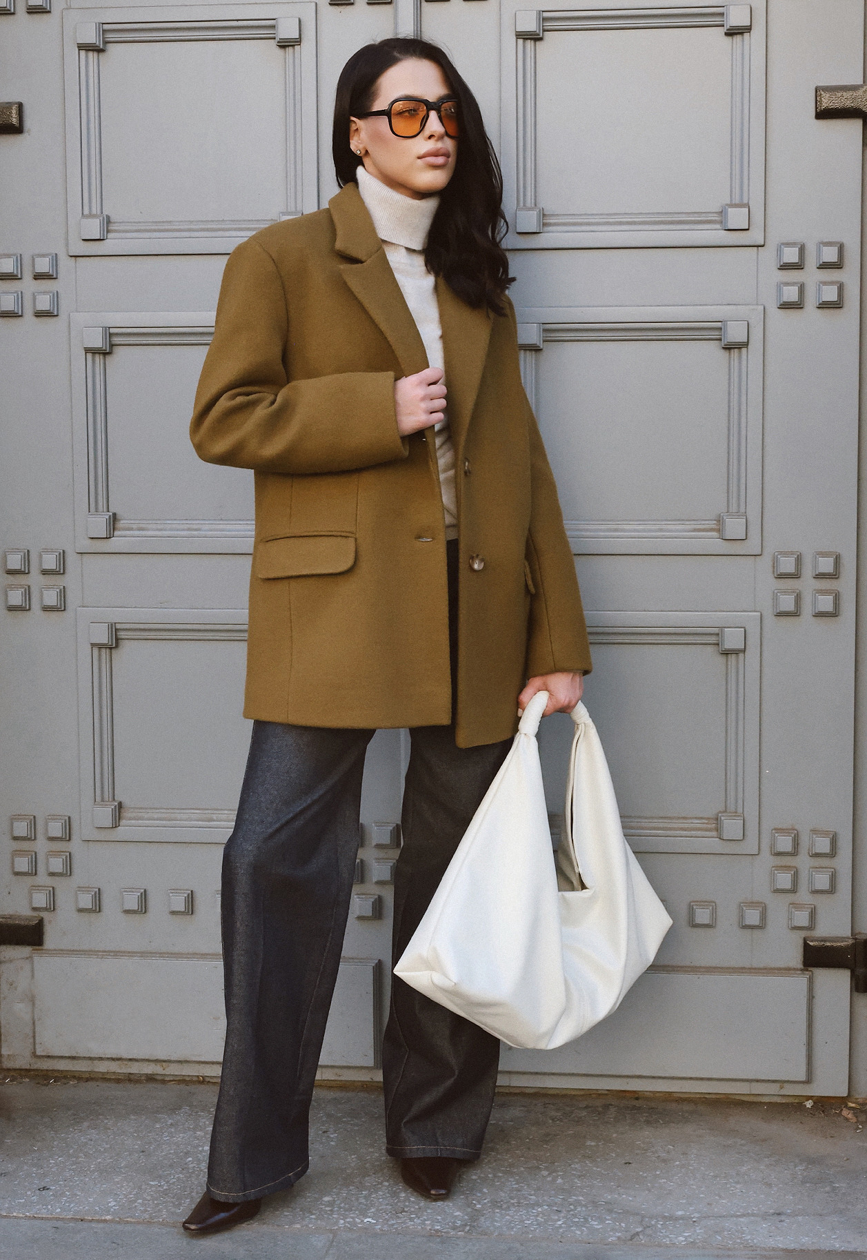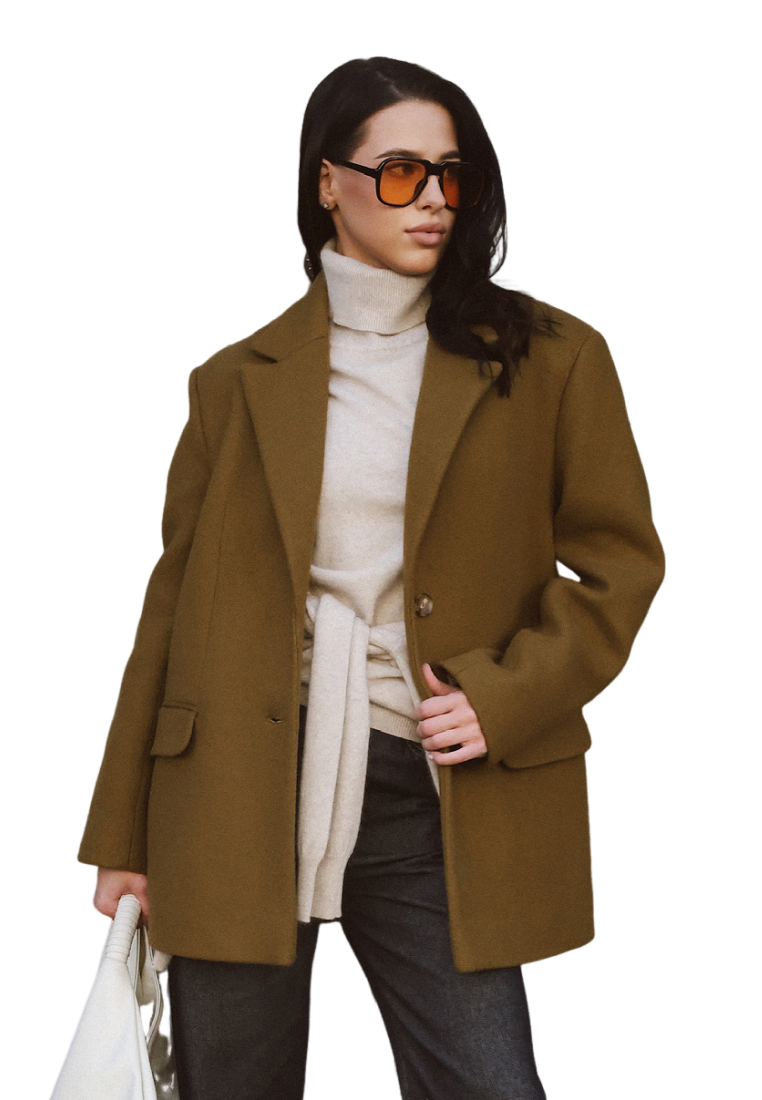 Пиджак-пальто прямого кроя. Детали: акцентное плечо, застежка на пуговицы, карманы с клапанами, шлица на спинке.