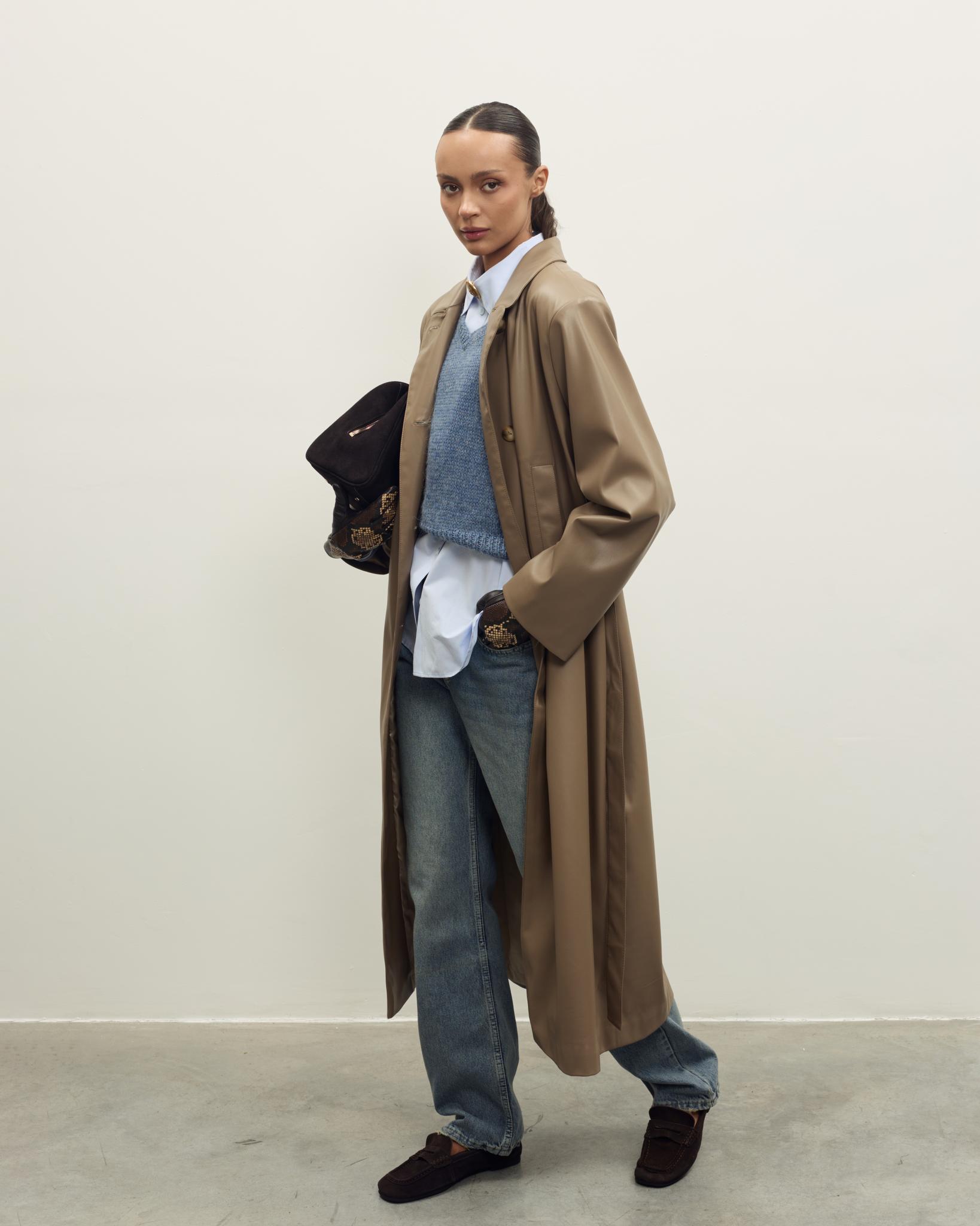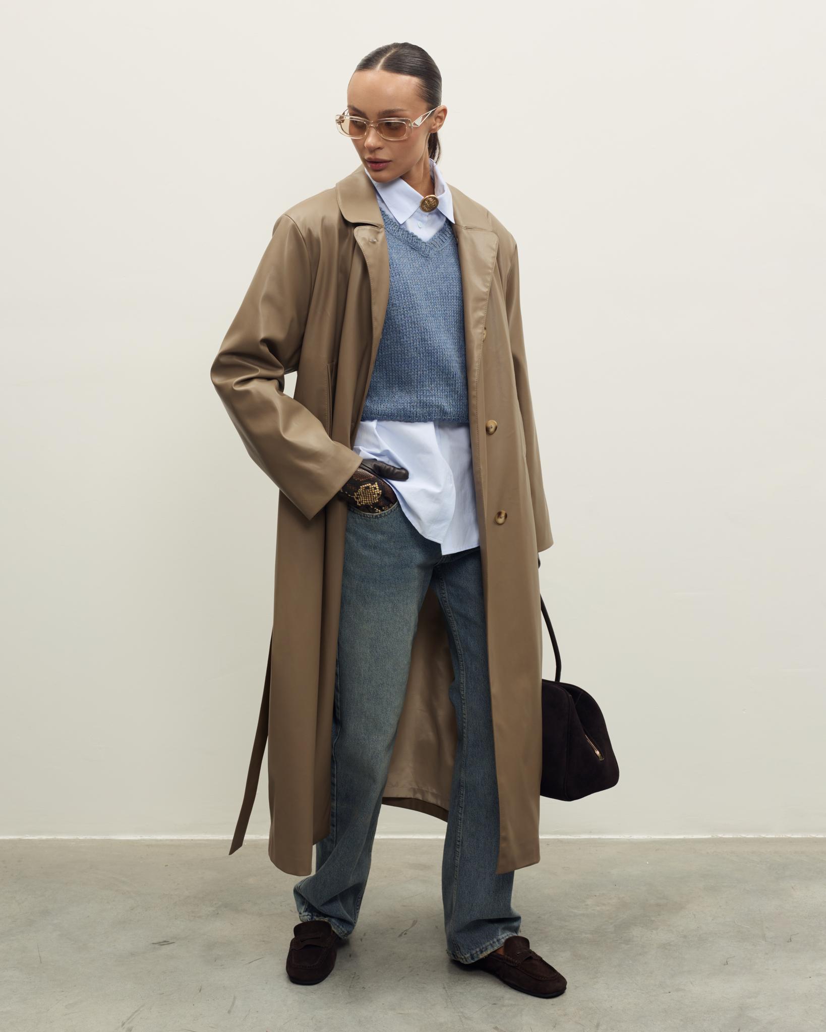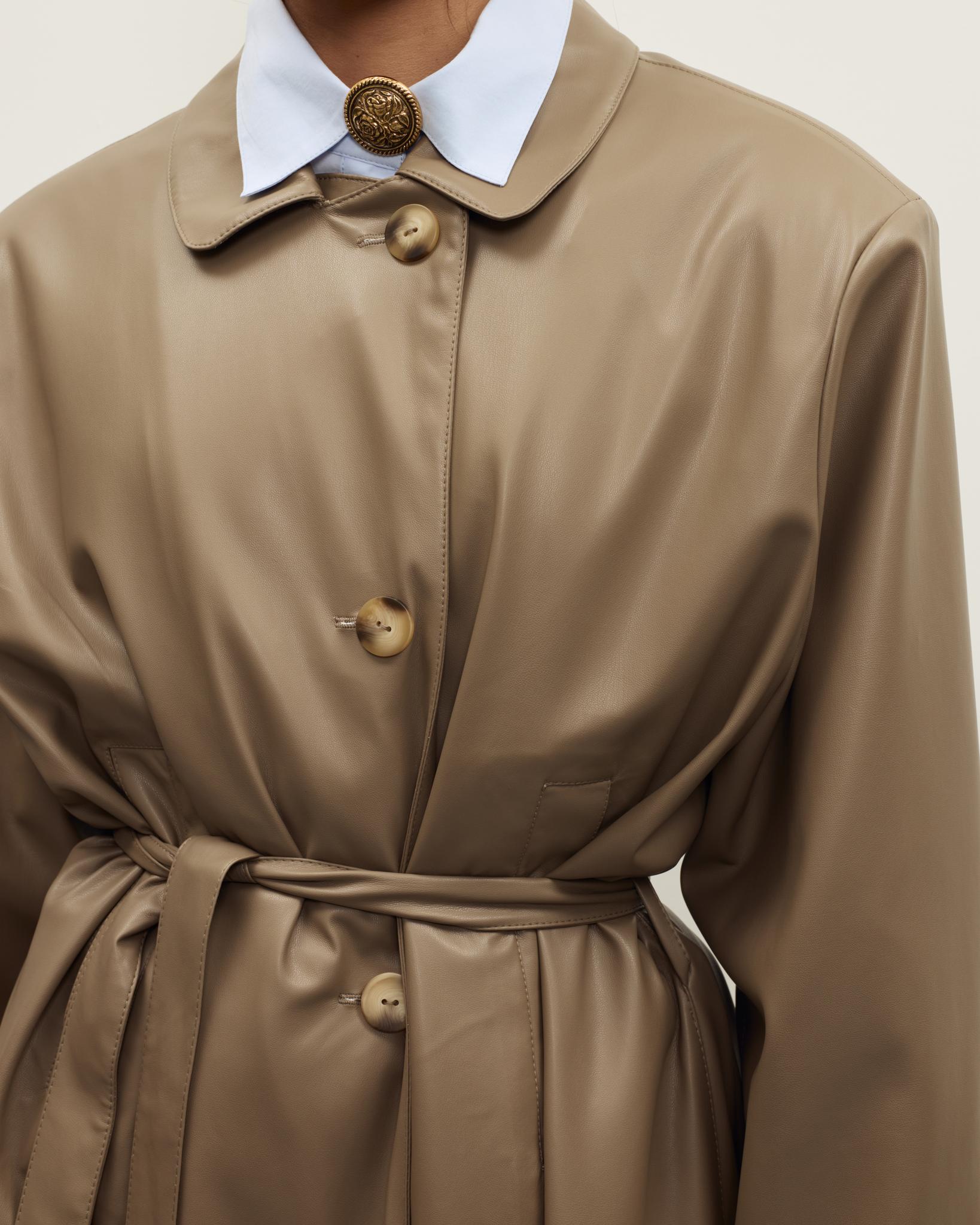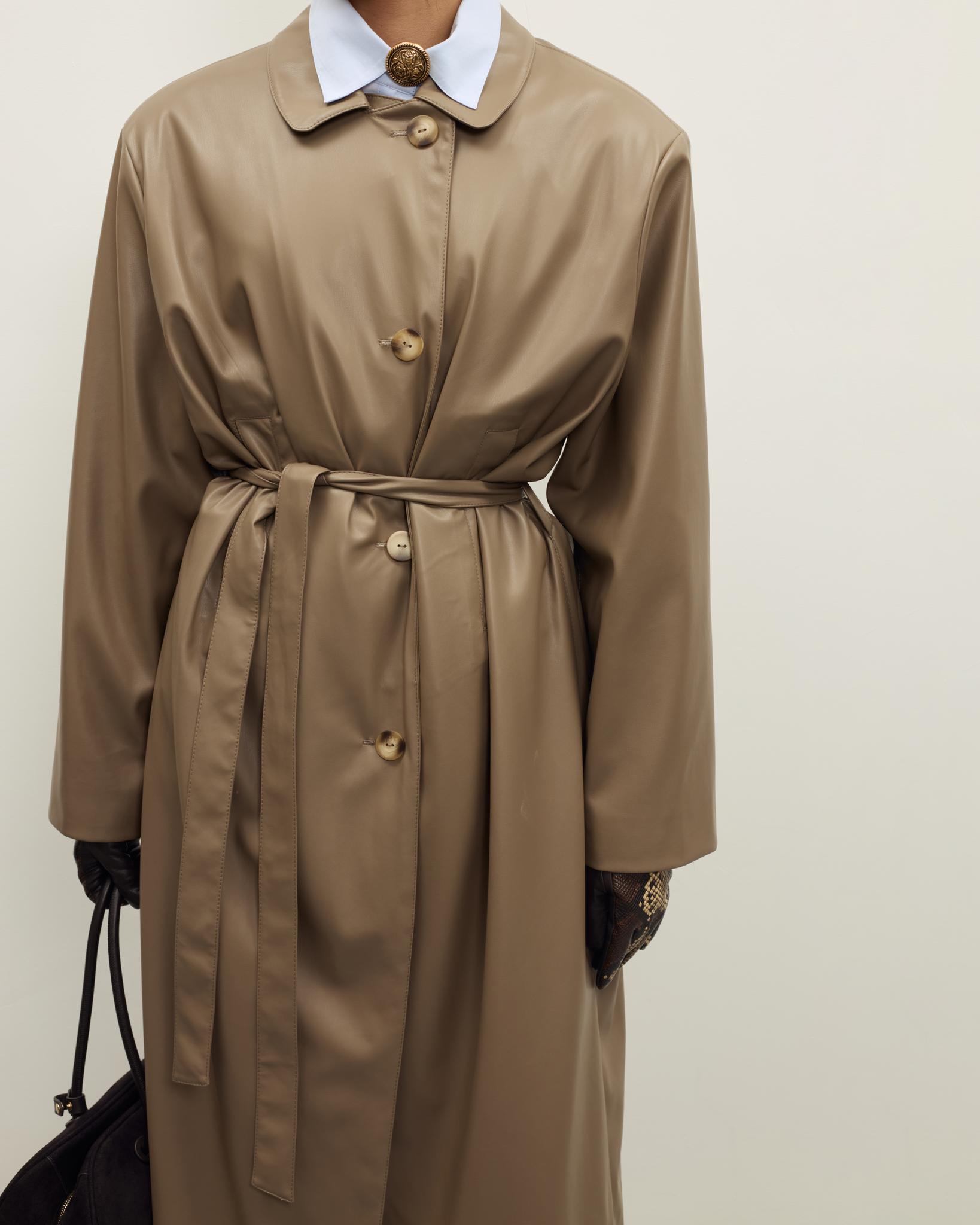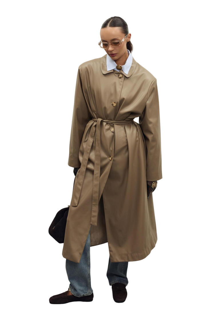 Мягкая, гладкая эко-кожа придаёт образу аккуратный и современный вид, а универсальный бежево-коричневый оттенок легко сочетается с базовым гардеробом — джинсами, брюками и платьями. Плащ отлично подойдёт как для повседневных выходов, так и для более собранных офисных образов.