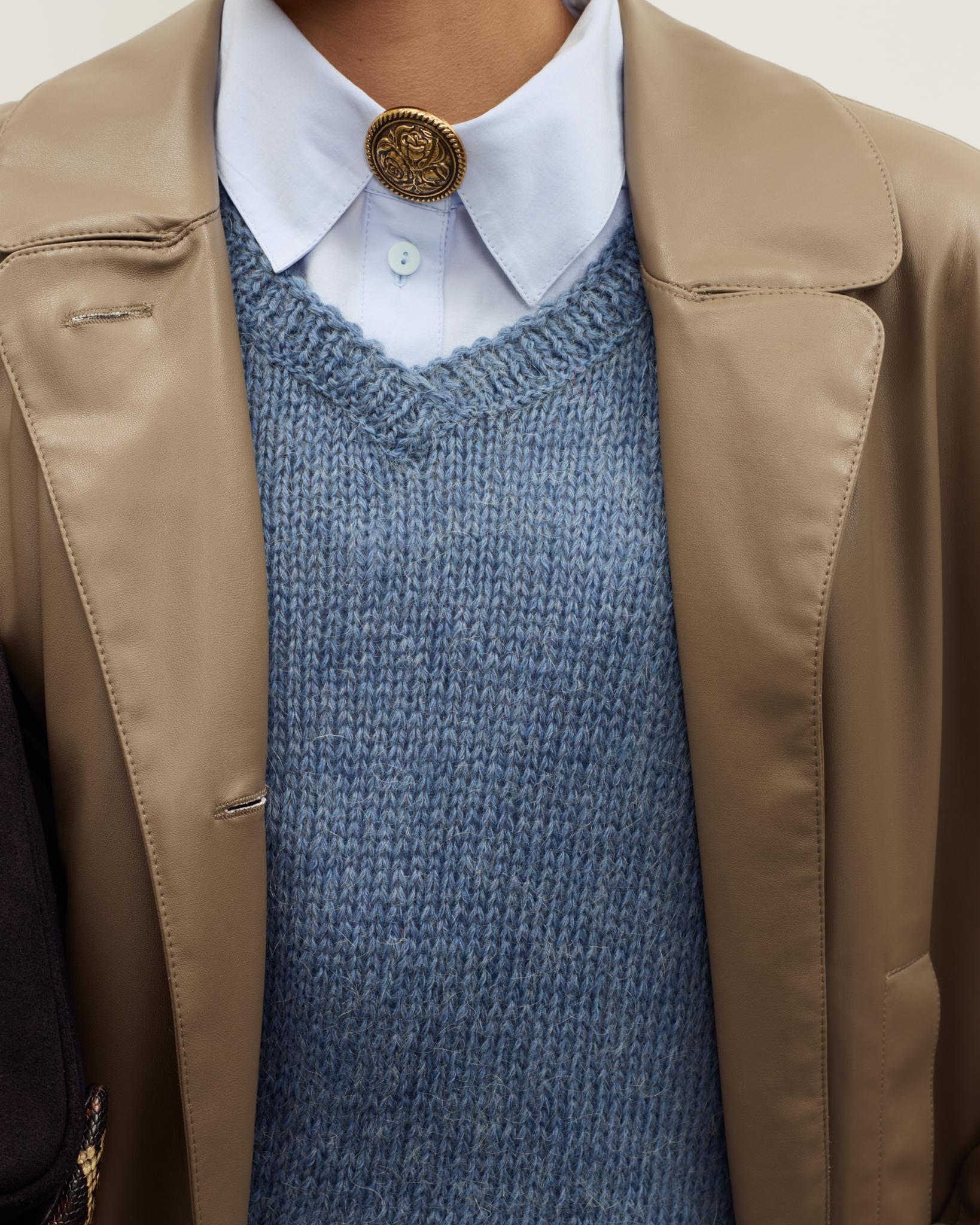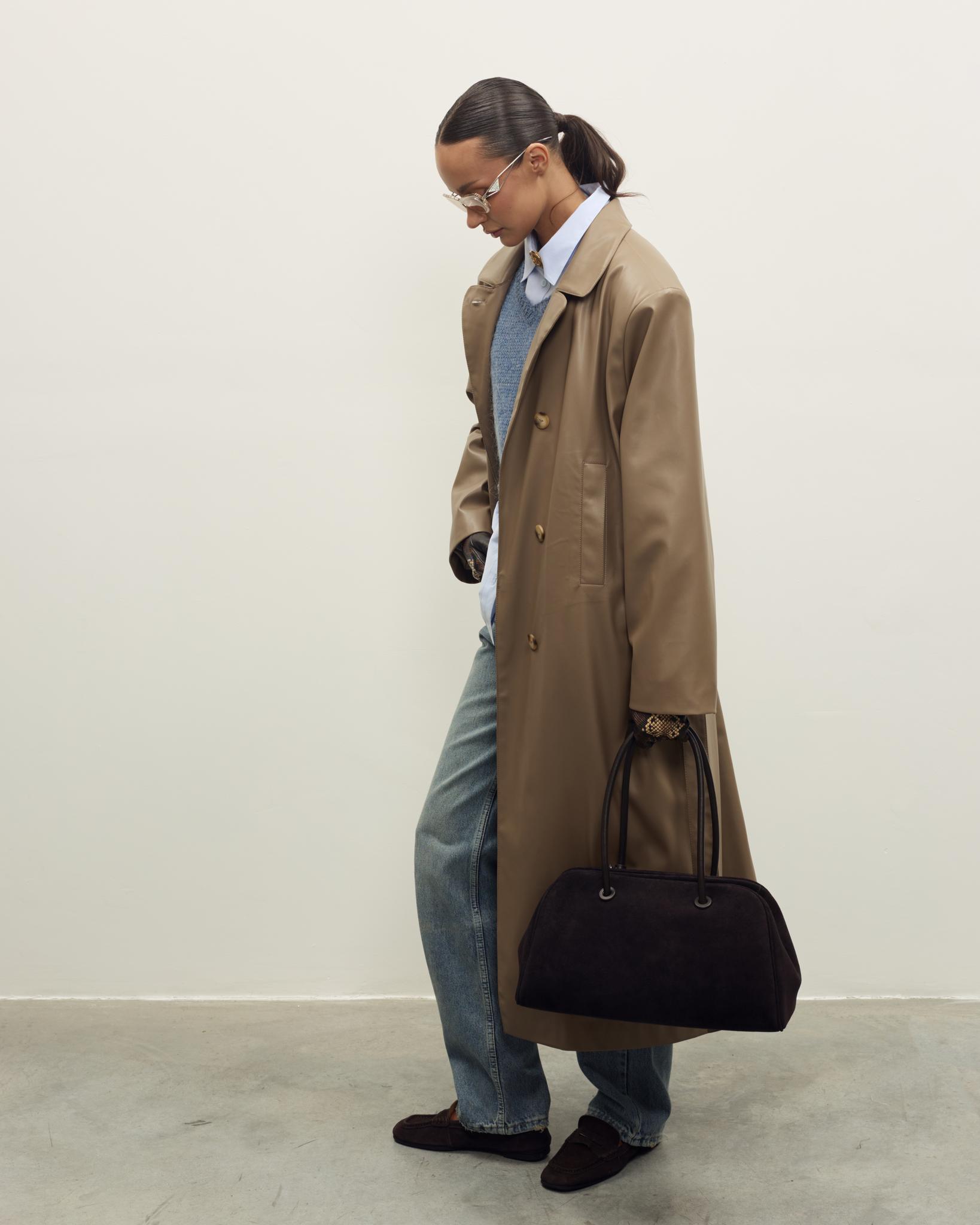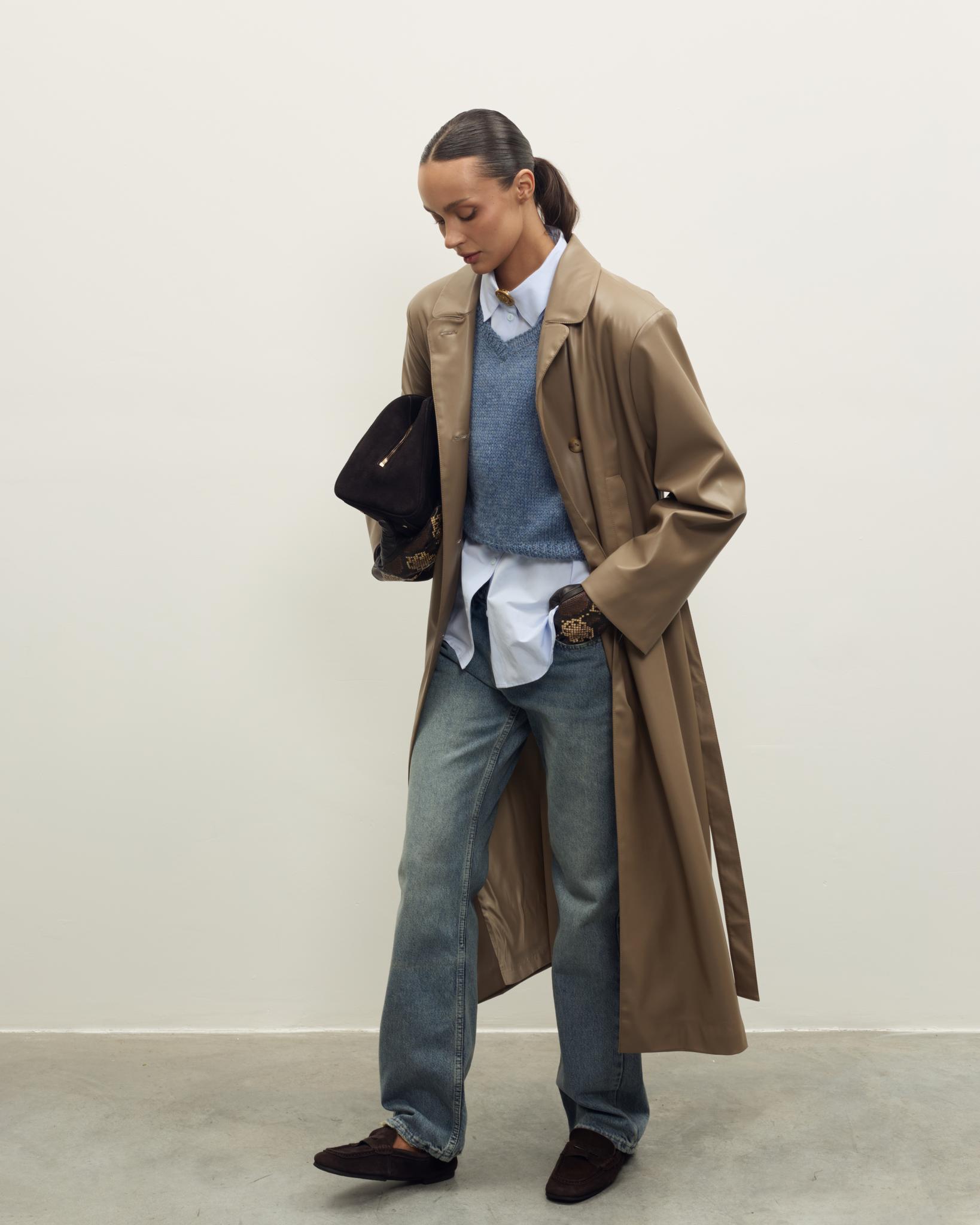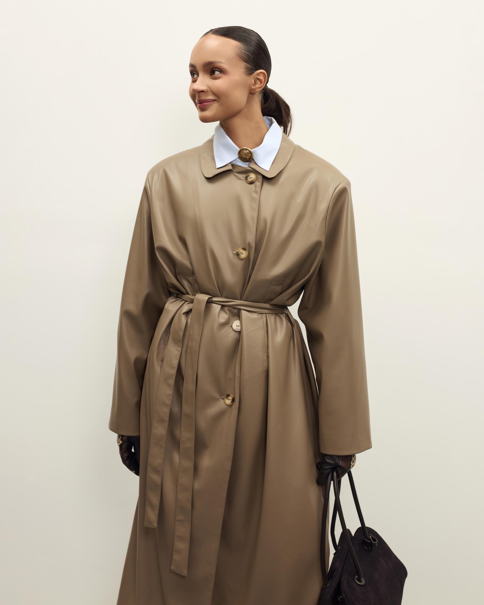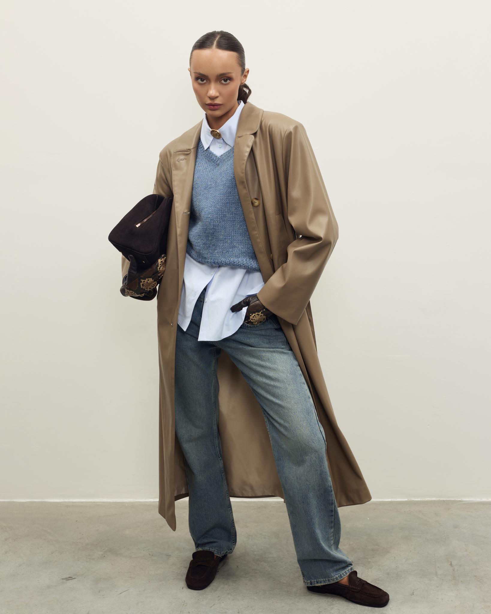 Мягкая, гладкая эко-кожа придаёт образу аккуратный и современный вид, а универсальный бежево-коричневый оттенок легко сочетается с базовым гардеробом — джинсами, брюками и платьями. Плащ отлично подойдёт как для повседневных выходов, так и для более собранных офисных образов.