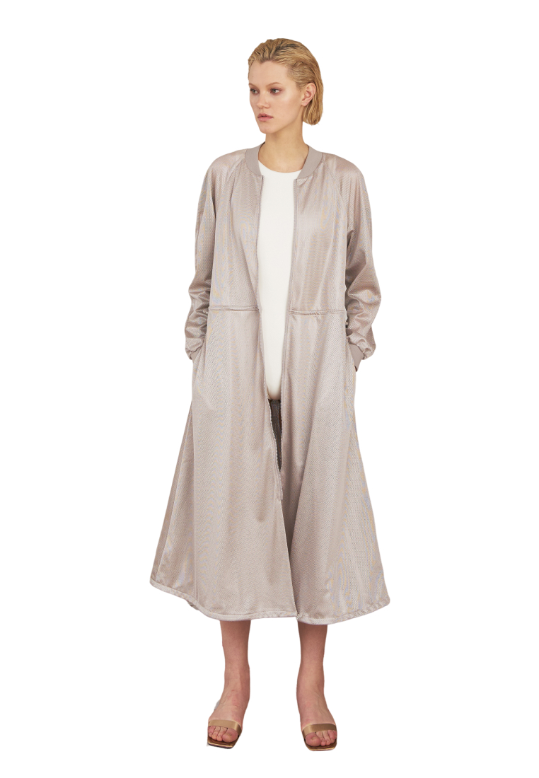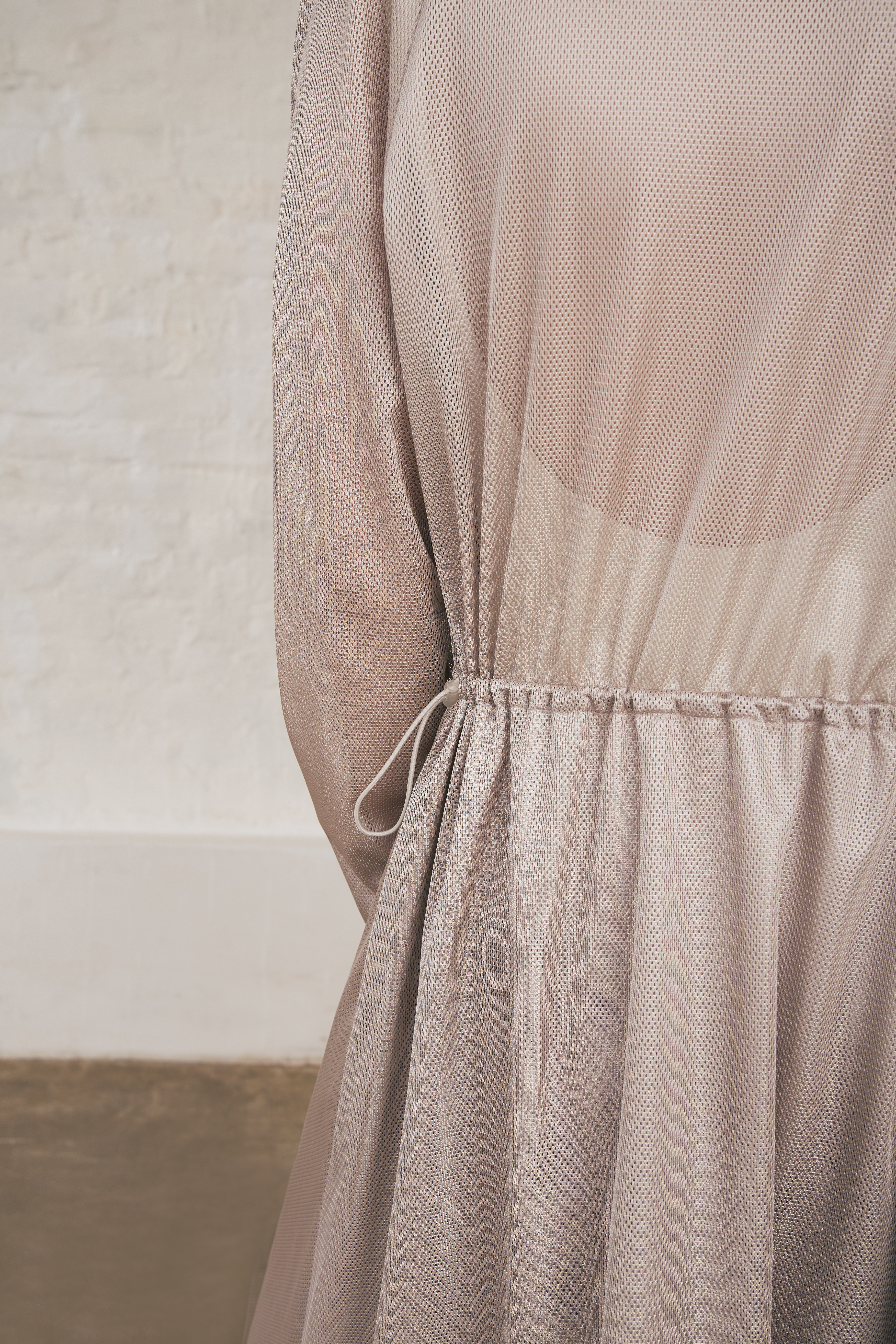 Спортивное платье в окрасе мираж. Выполнено из оригинальной сетки, на двух кулисках (с возможностью регулирования ширины и драпировки). Ворот из хлопковой трикотажной резинки.