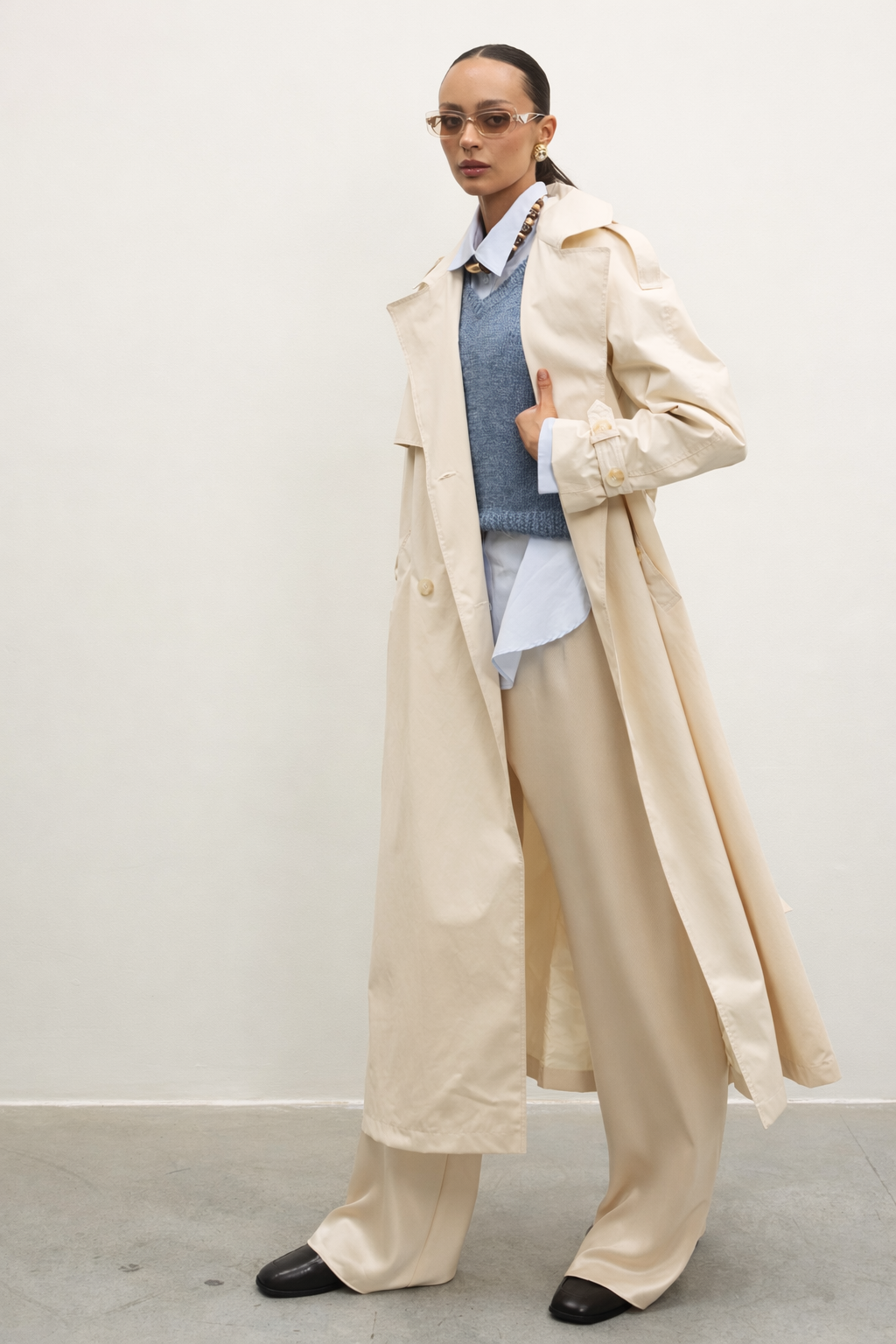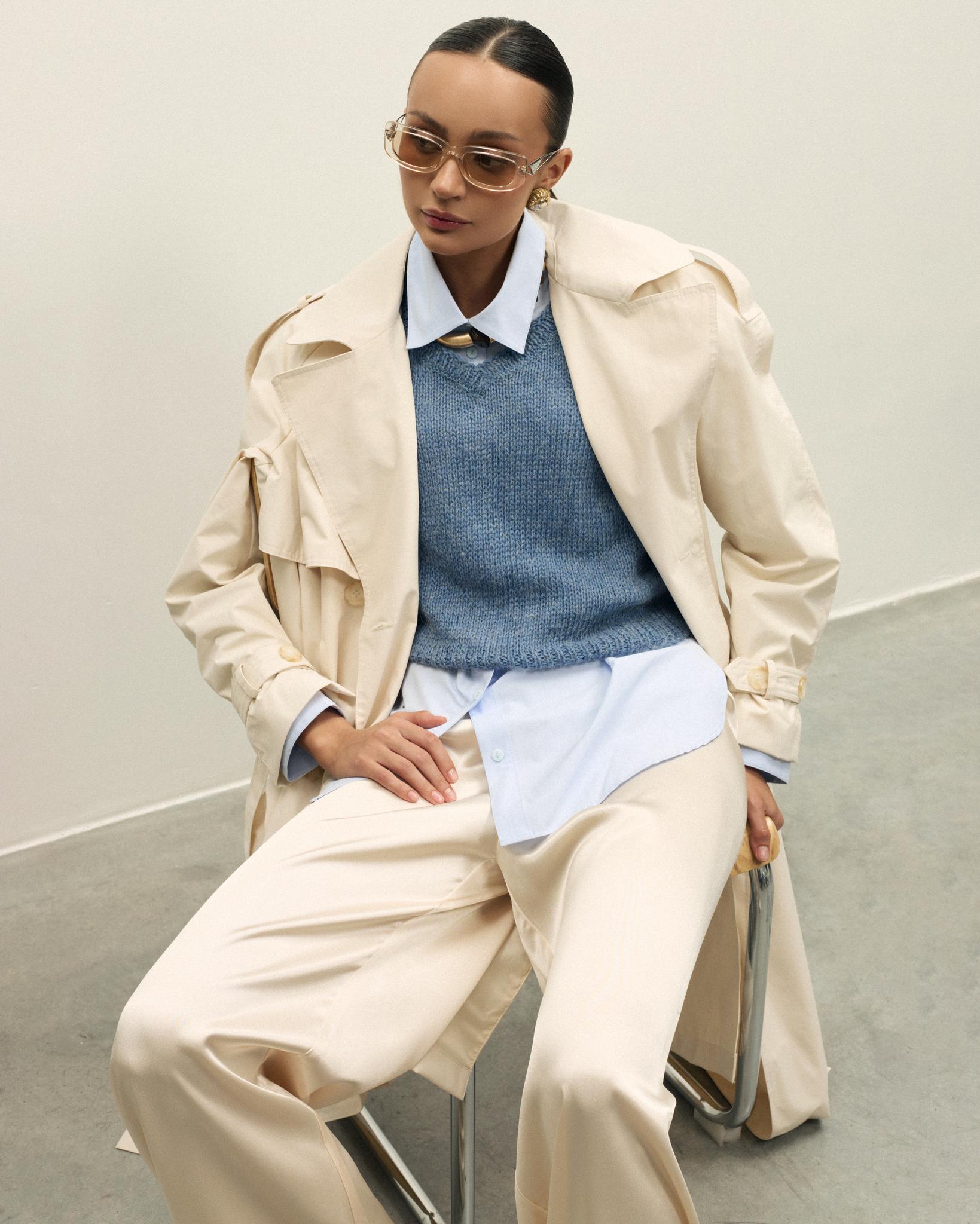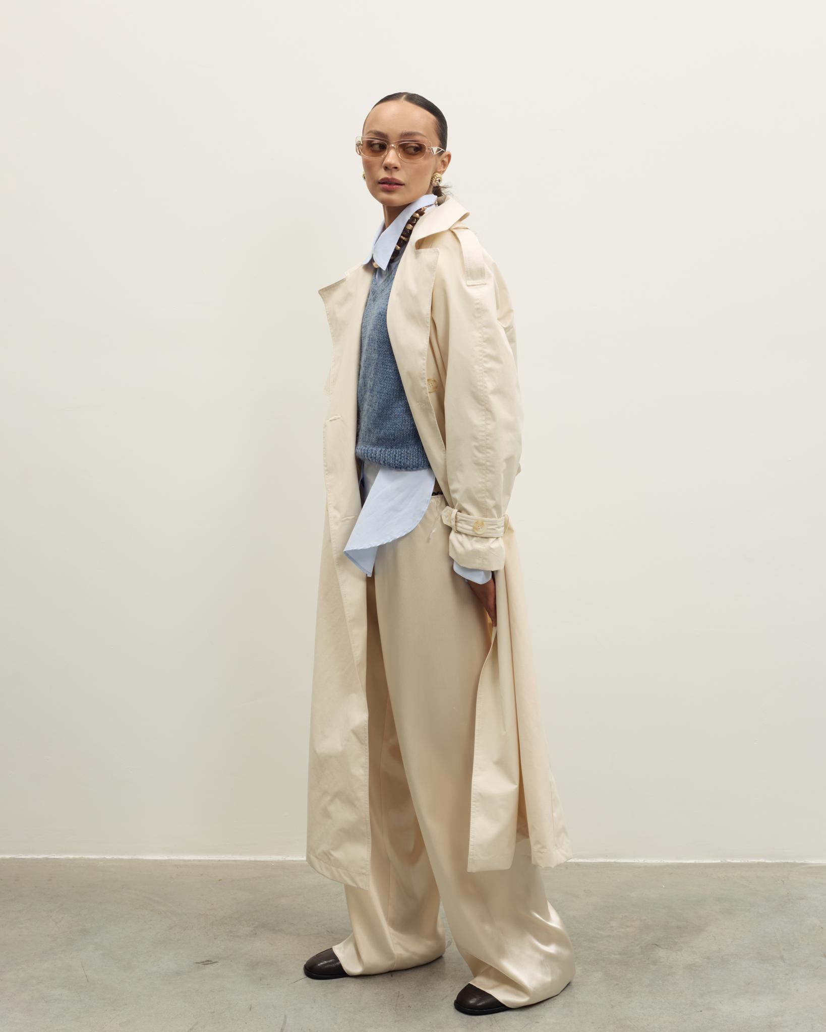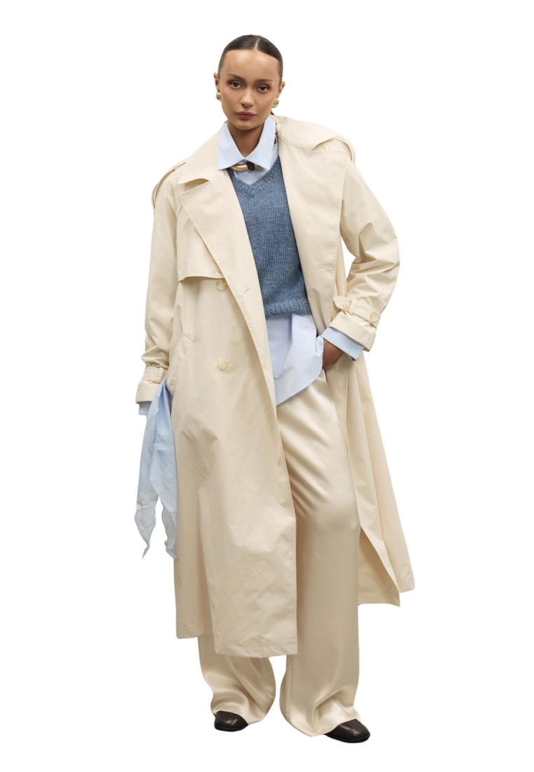Лёгкая, но плотная хлопковая ткань красиво держит форму, оставаясь комфортной в течение всего дня. Тренч идеально подходит для модных образов, и деловых встреч — это инвестиционная вещь, которая будет актуальна всегда.