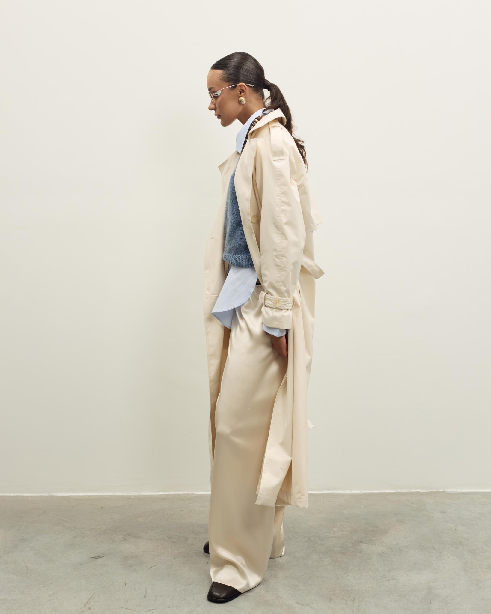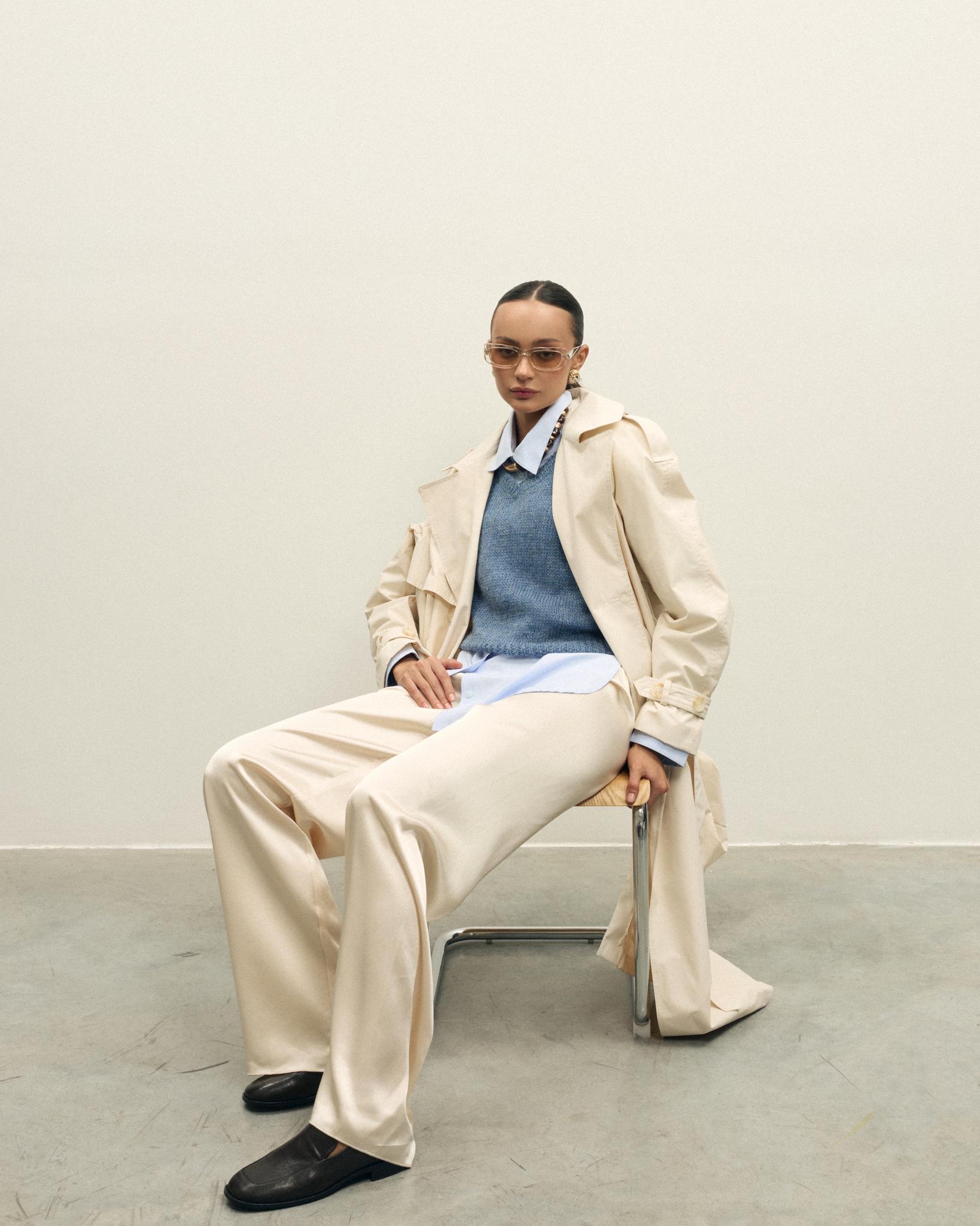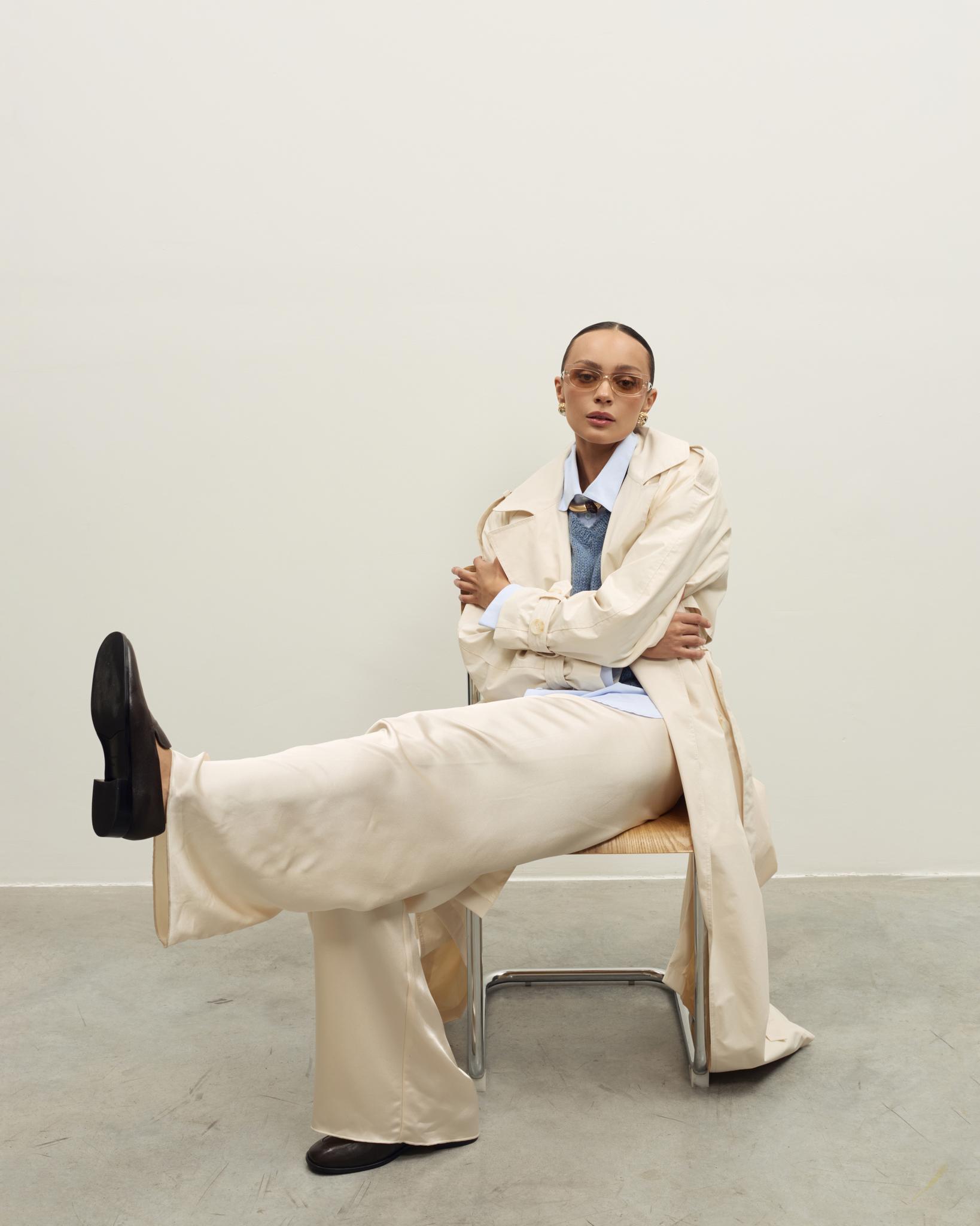 Чистые линии, продуманный крой и благородная палитра в вариантах оливкового и молочного, которые легко вписываются в гардероб в духе тихой роскоши.