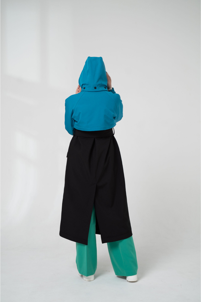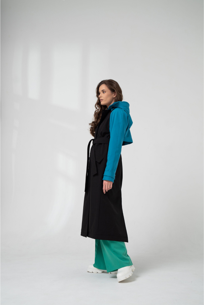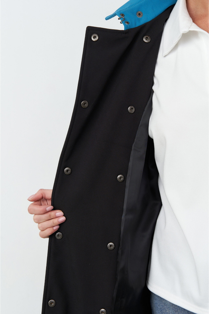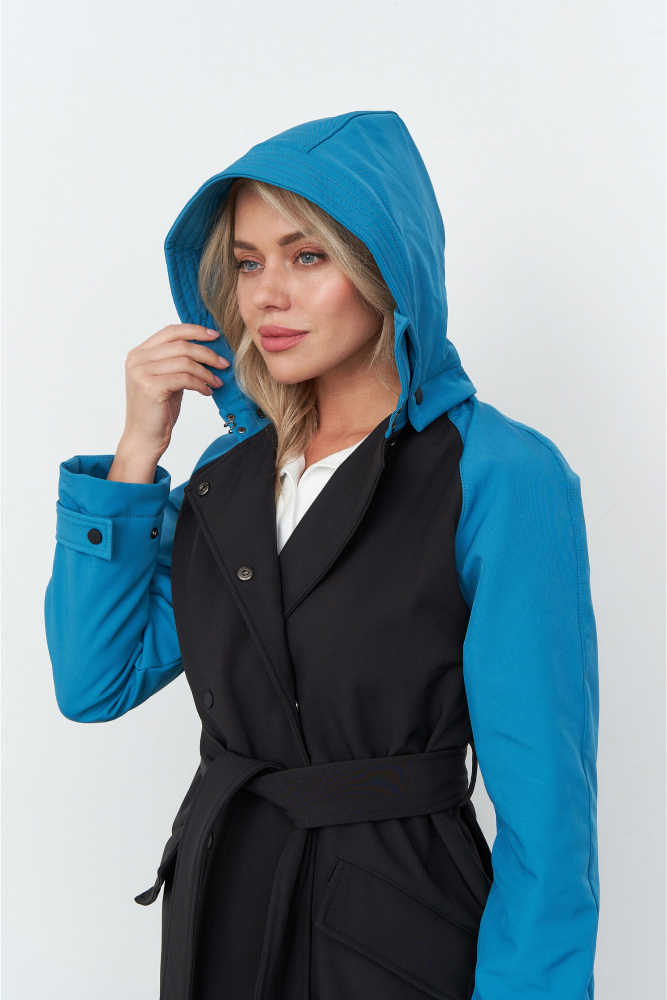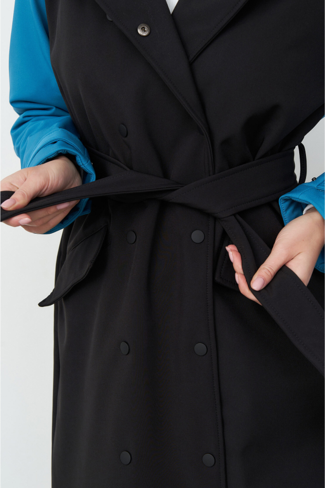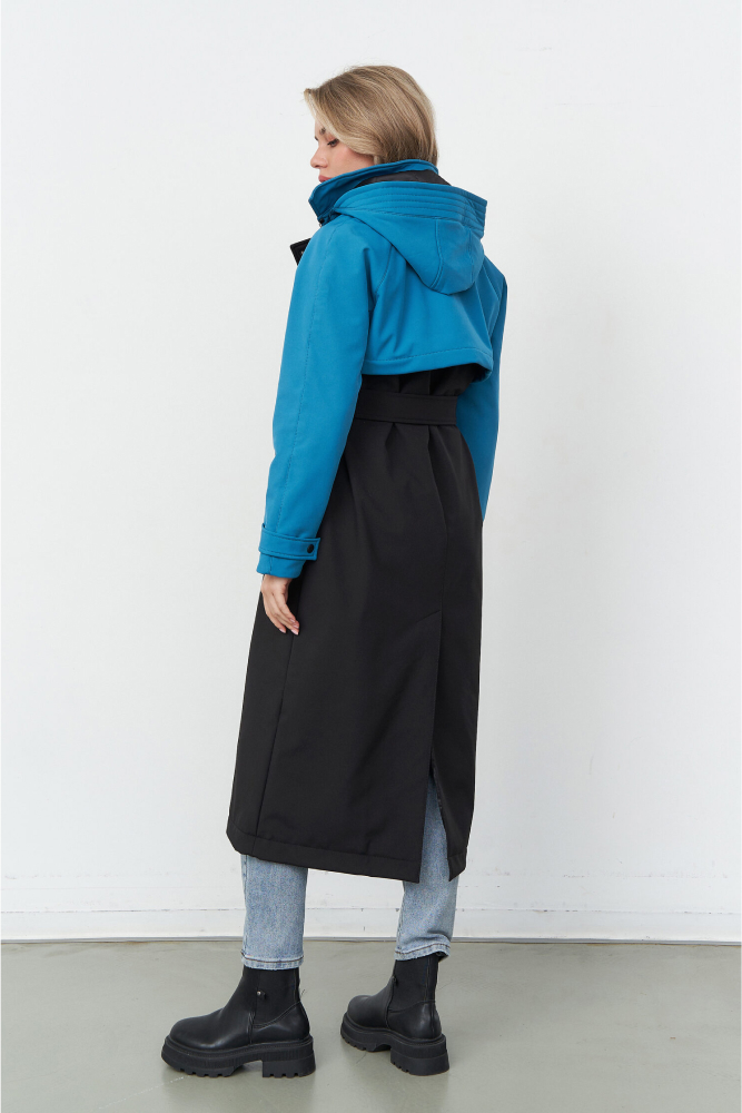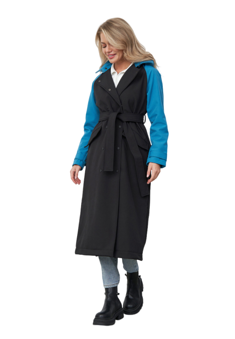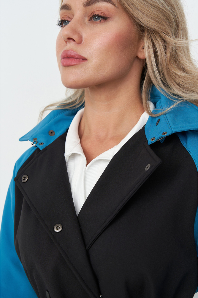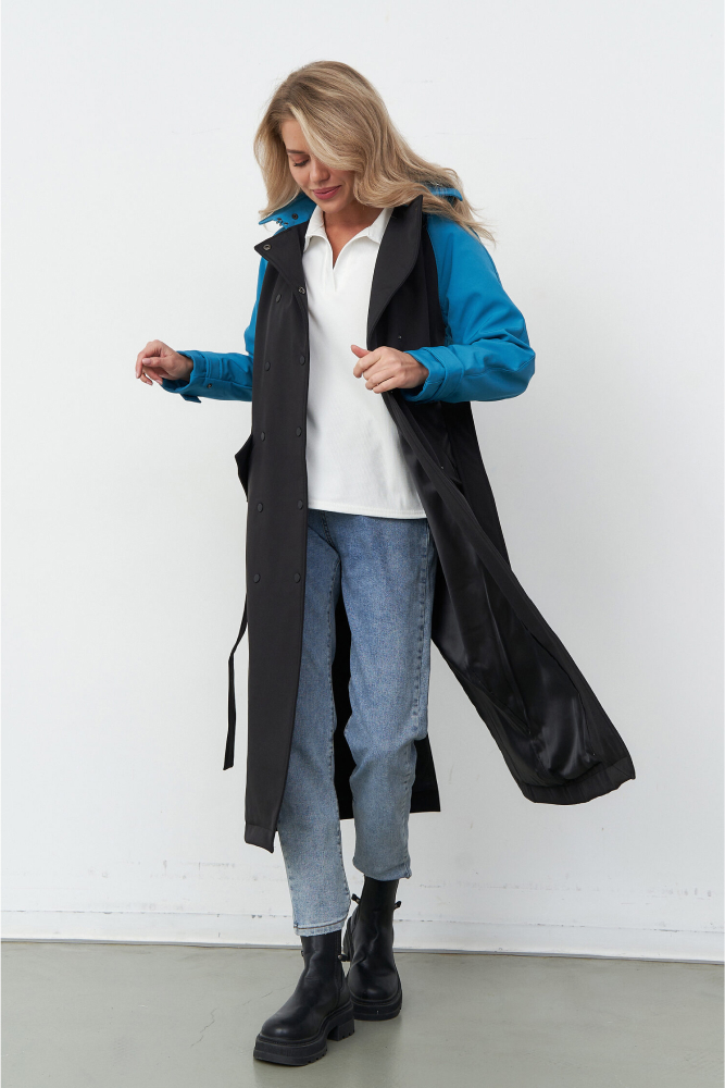 Демисезонный двубортный тренчкот "Матисов" актуального кроя в стиле колор-блок из софтшела. Идеально вписывается в стильный городской образ. Тренч выполнен в двух контрастных цветах с приятным подкладом из поливискозы и мембраны с высокими показателями защиты от дождя и ветра.
