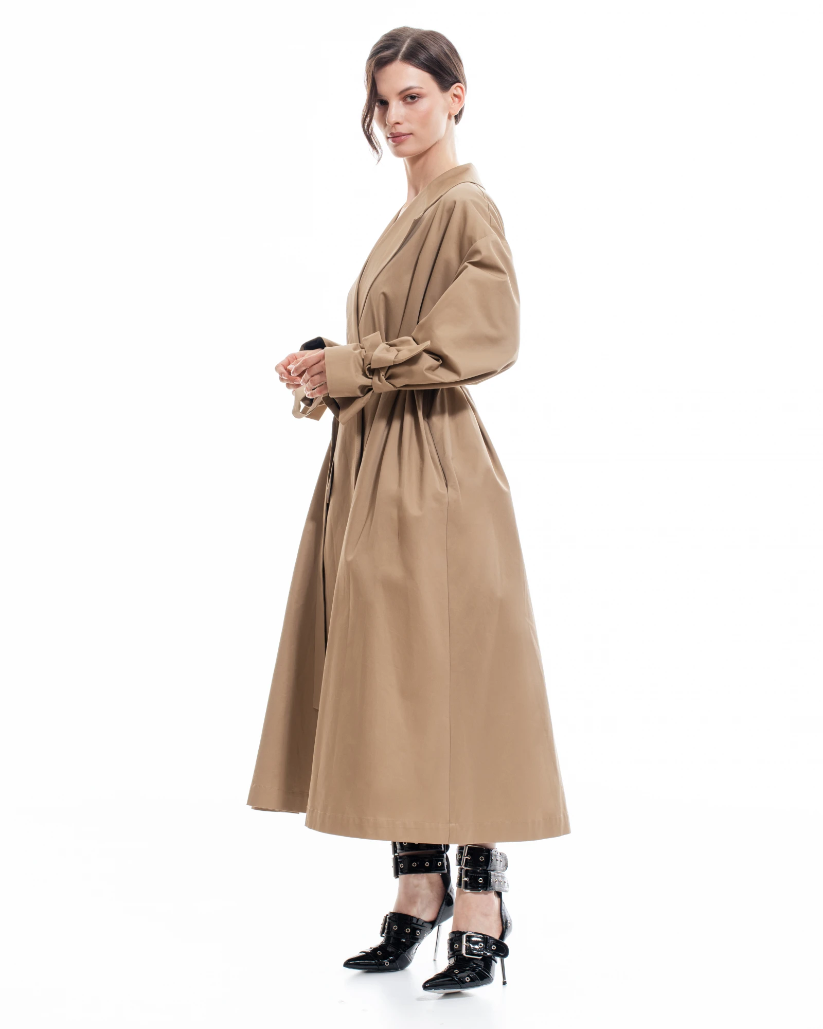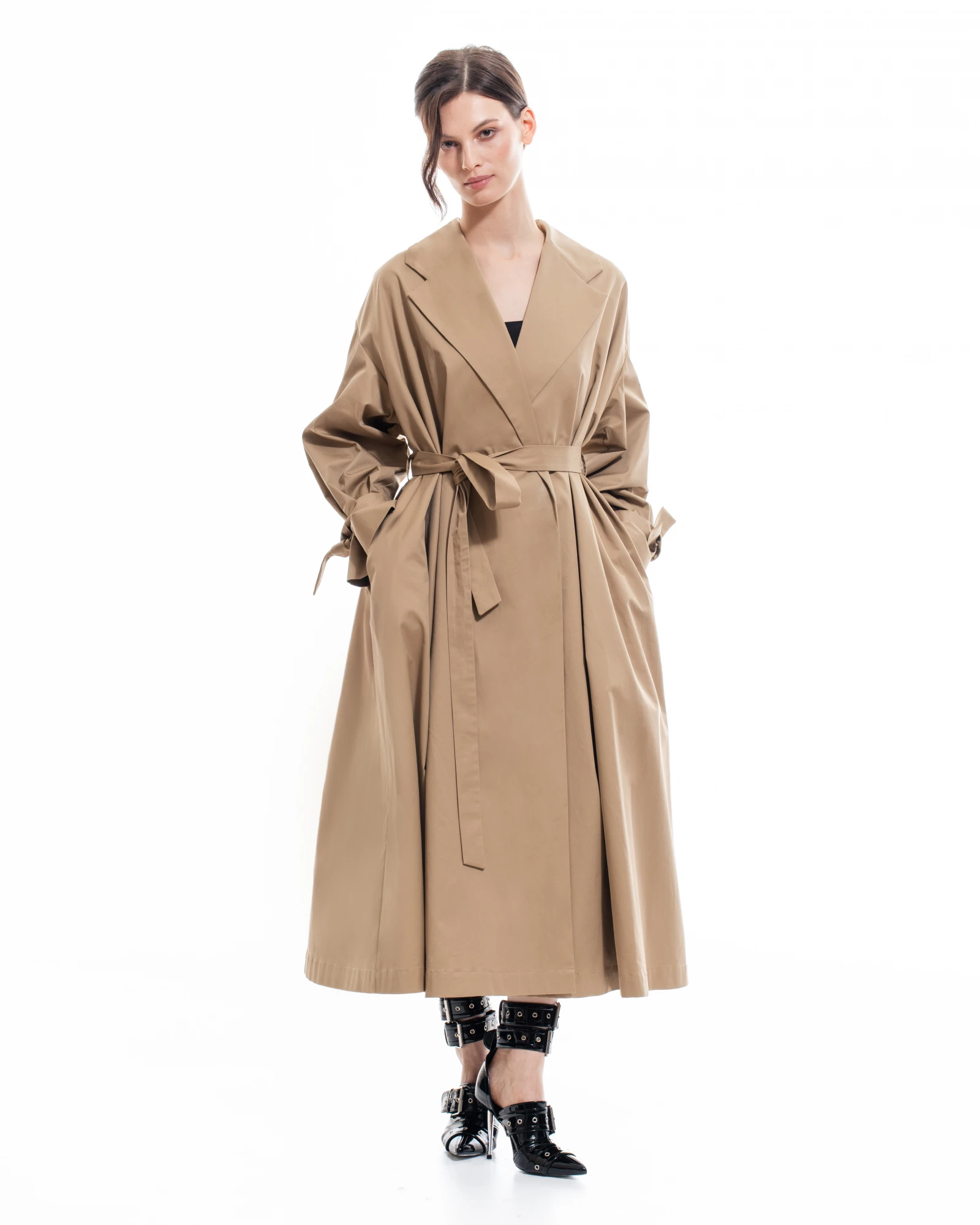 Тренч расклешенного силуэта Милан, из 100% хлопка с водоотталкивающей пропиткой. Завершит готовый образ с любым вечерним и коктейльным платьем из коллекции. По рукавам декоративные съемные паты для придания нотки театральности. в комплекте - пояс. Застегивается на внутренние кнопки серебристого цвета.