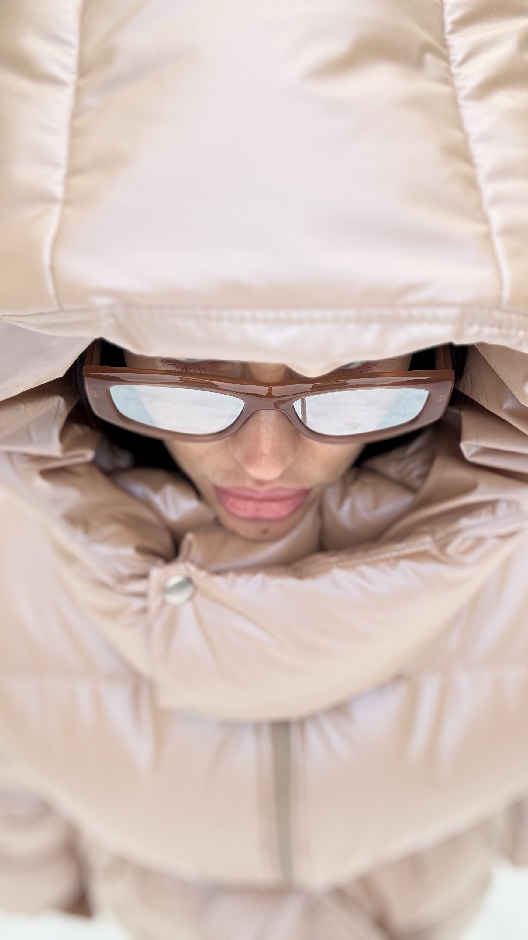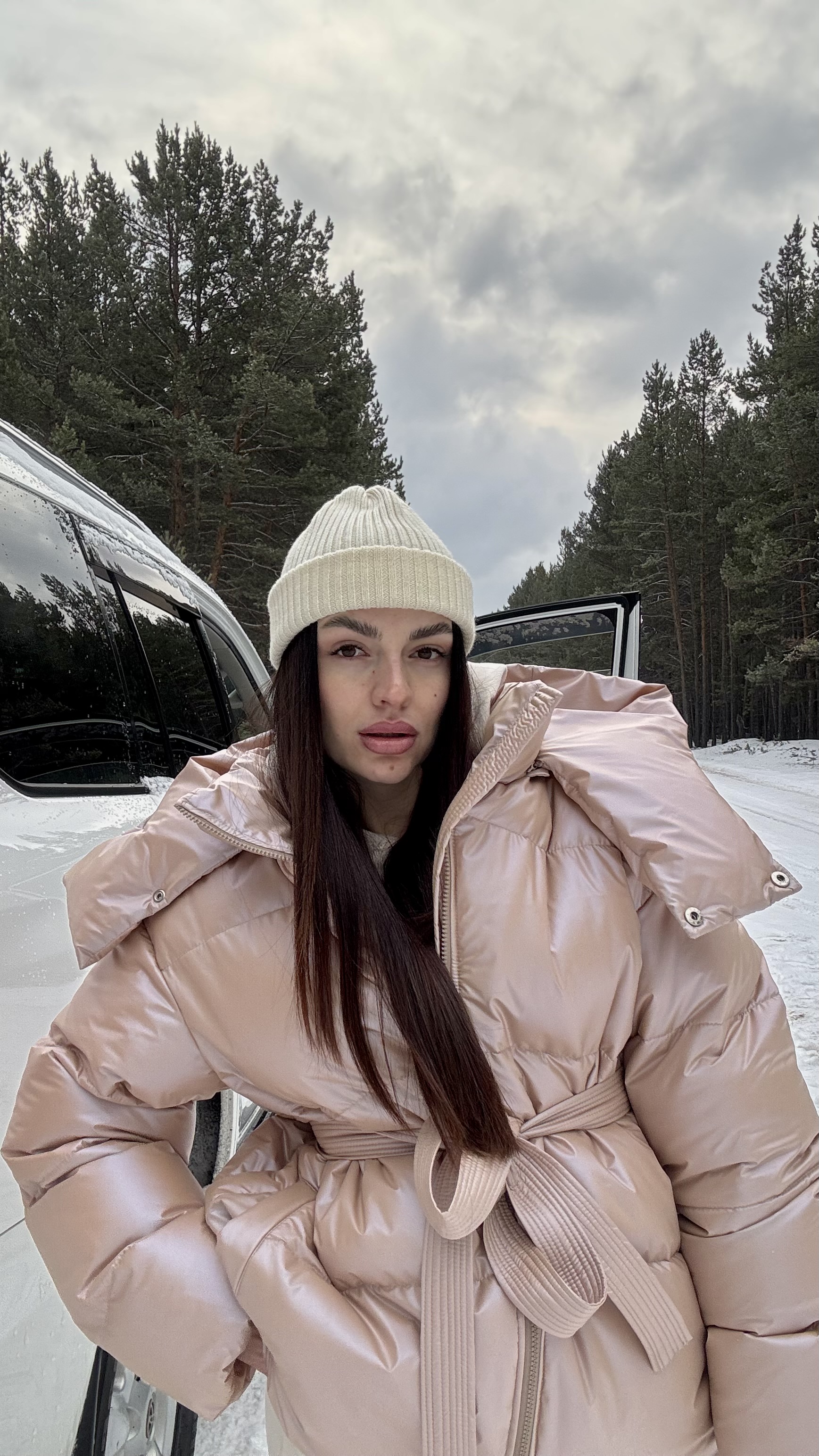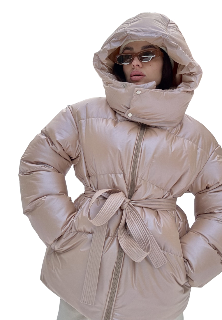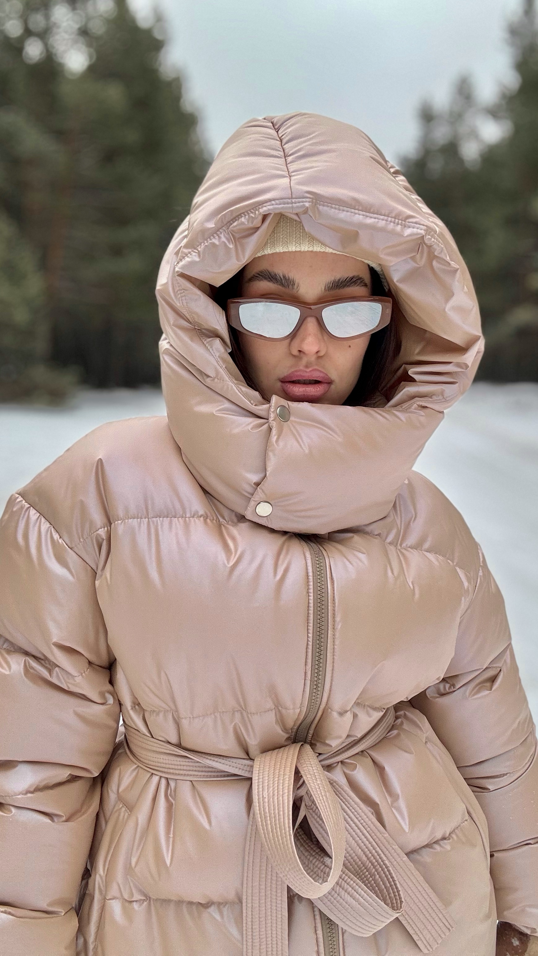 Пуховик прямого кроя с большим отстегивающимся капюшоном, с поясом.