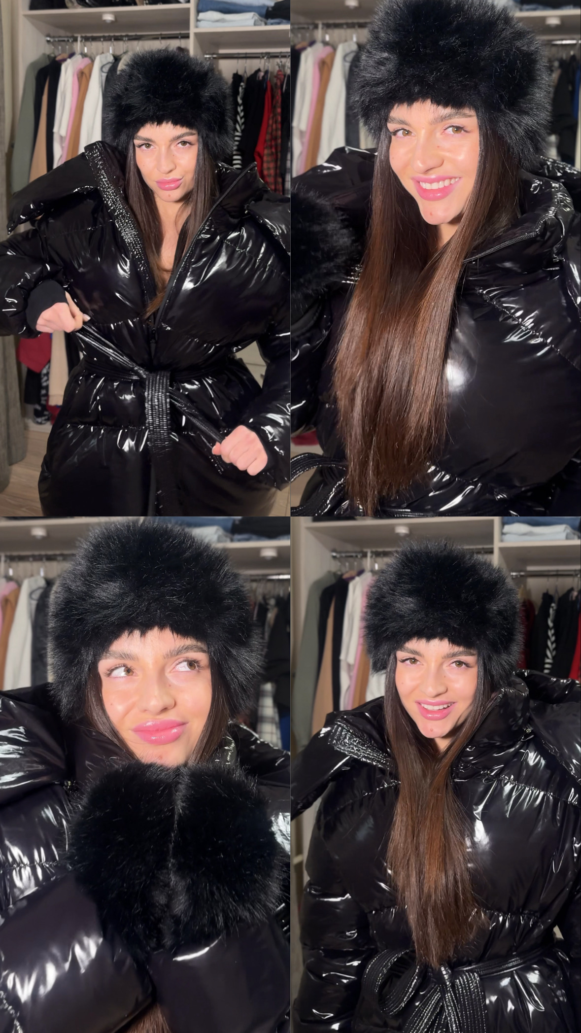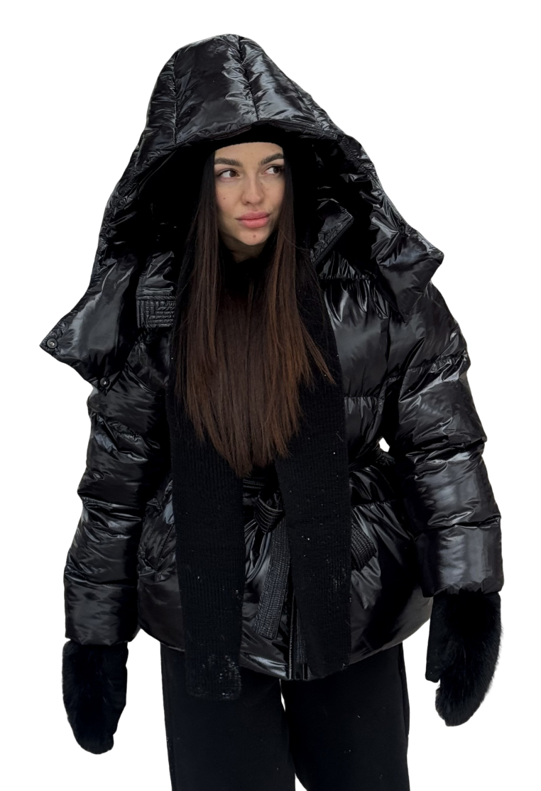 Пуховик прямого кроя с большим отстегивающимся капюшоном, с поясом.