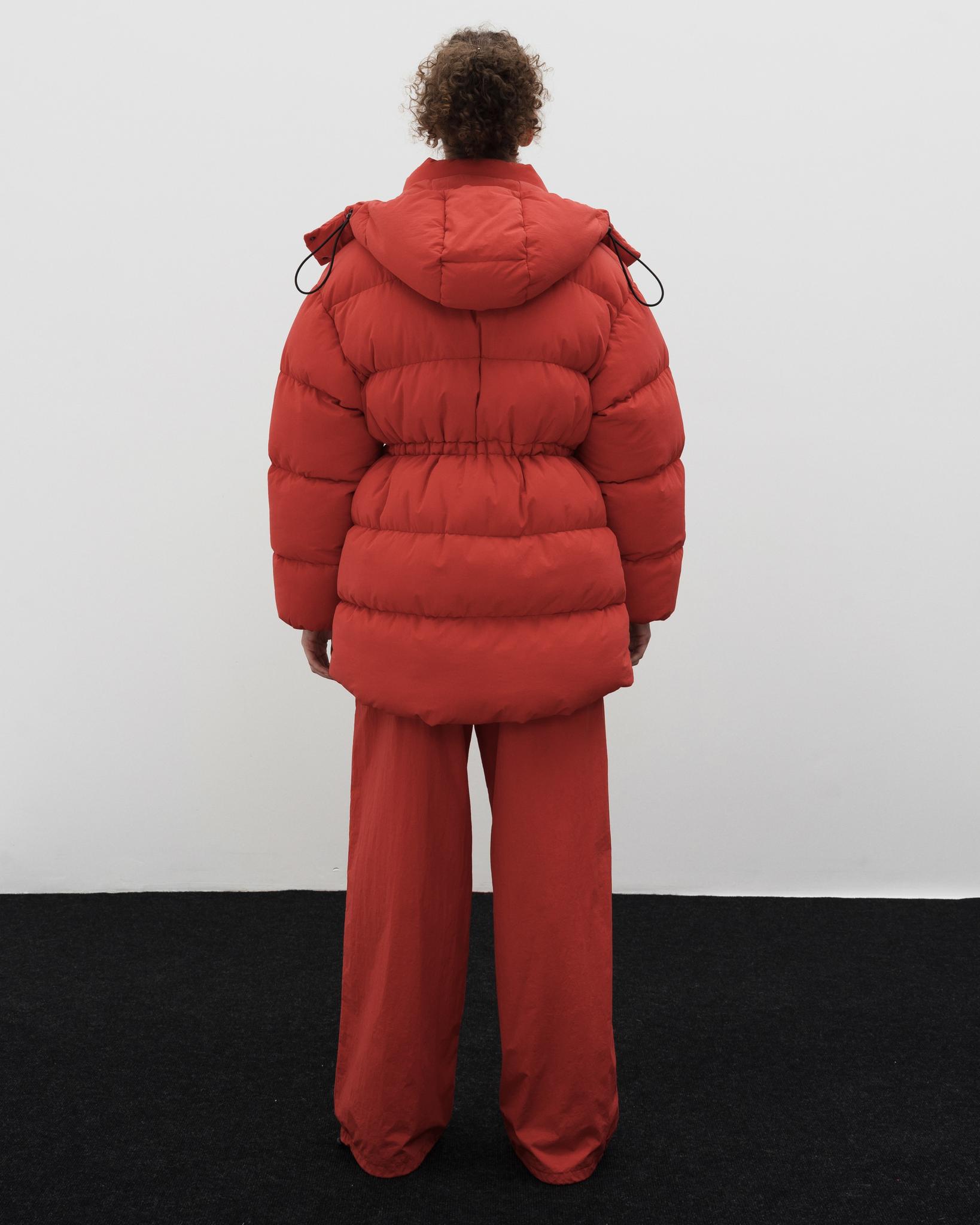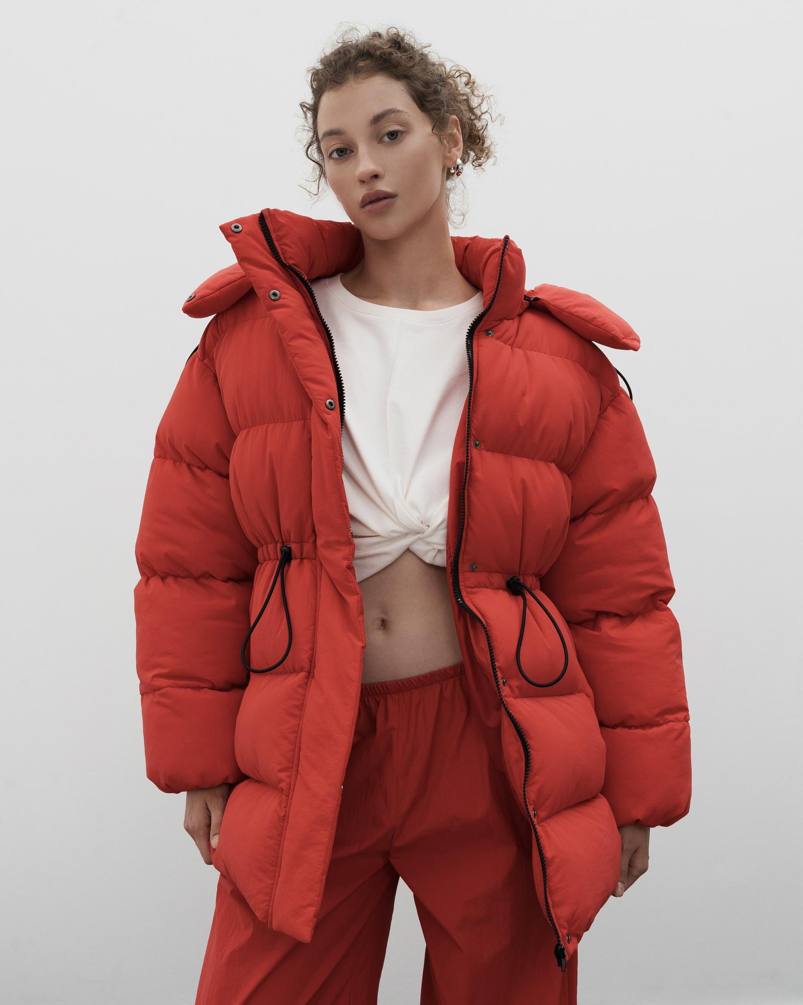 Базовый короткий пуховик oversize кроя с водоотталкивающей мембраной и защитой от ветра.  Детали: пояс в комплекте; съемный капюшон на молнии; кулиска по периметру; два глубоких внешних кармана, дополнительно внутренний на молнии. Спущенный плечевой шов, воротник-стойка, ветрозащитная...