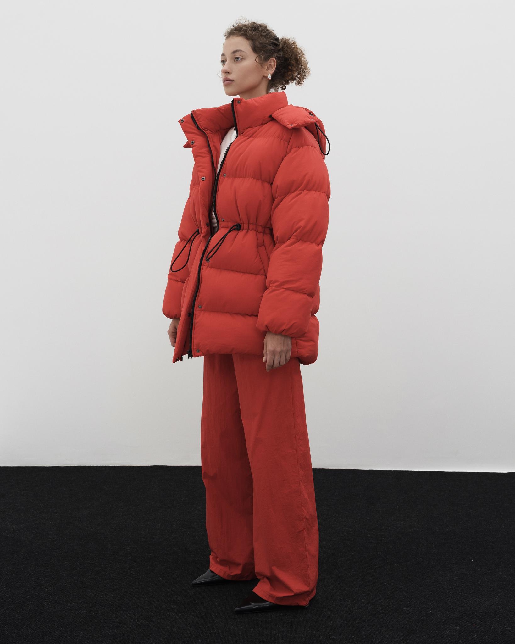Базовый пуховик средней длины oversize кроя с водоотталкивающей мембраной и защитой от ветра.  Детали: пояс в комплекте; съемный капюшон на молнии; кулиска по периметру; два глубоких внешних кармана, дополнительно внутренний на молнии. Спущенный плечевой шов, воротник-стойка, ветрозащитная...