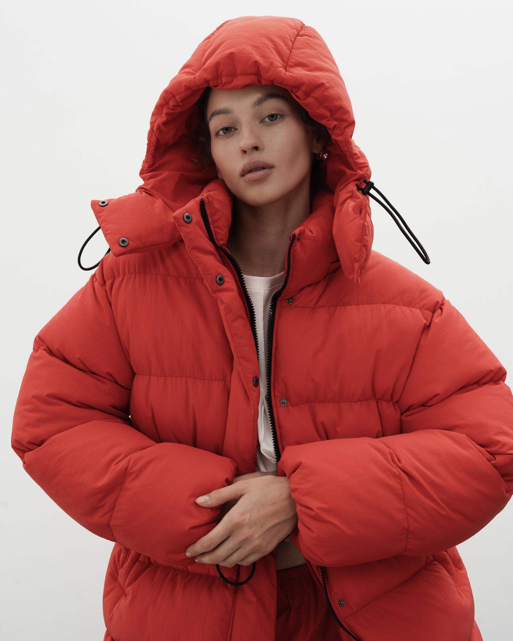 Базовый короткий пуховик oversize кроя с водоотталкивающей мембраной и защитой от ветра.  Детали: съемный капюшон на молнии; кулиска по периметру; два глубоких внешних кармана, дополнительно внутренний на молнии. Спущенный плечевой шов, воротник-стойка, ветрозащитная планка на кнопках....