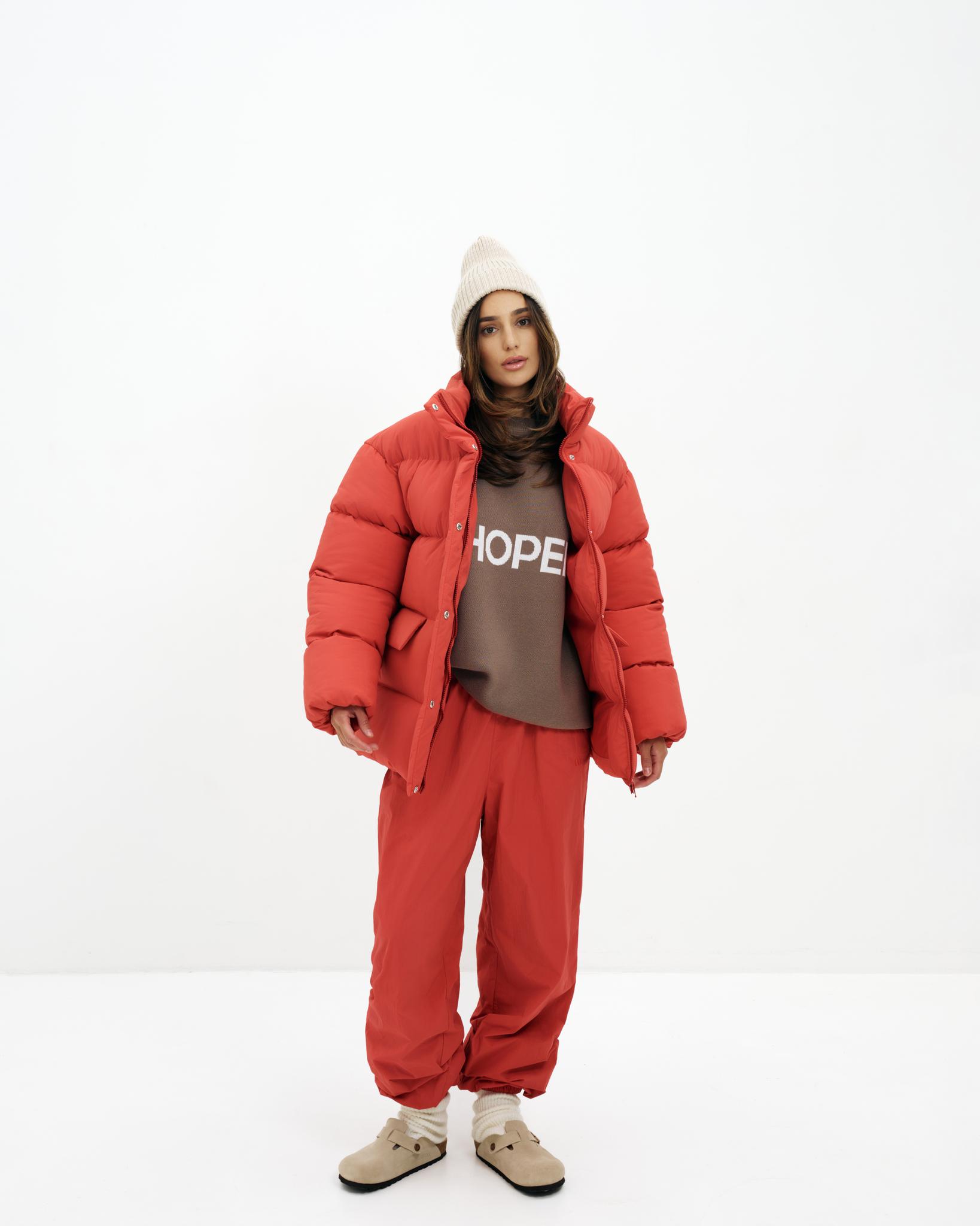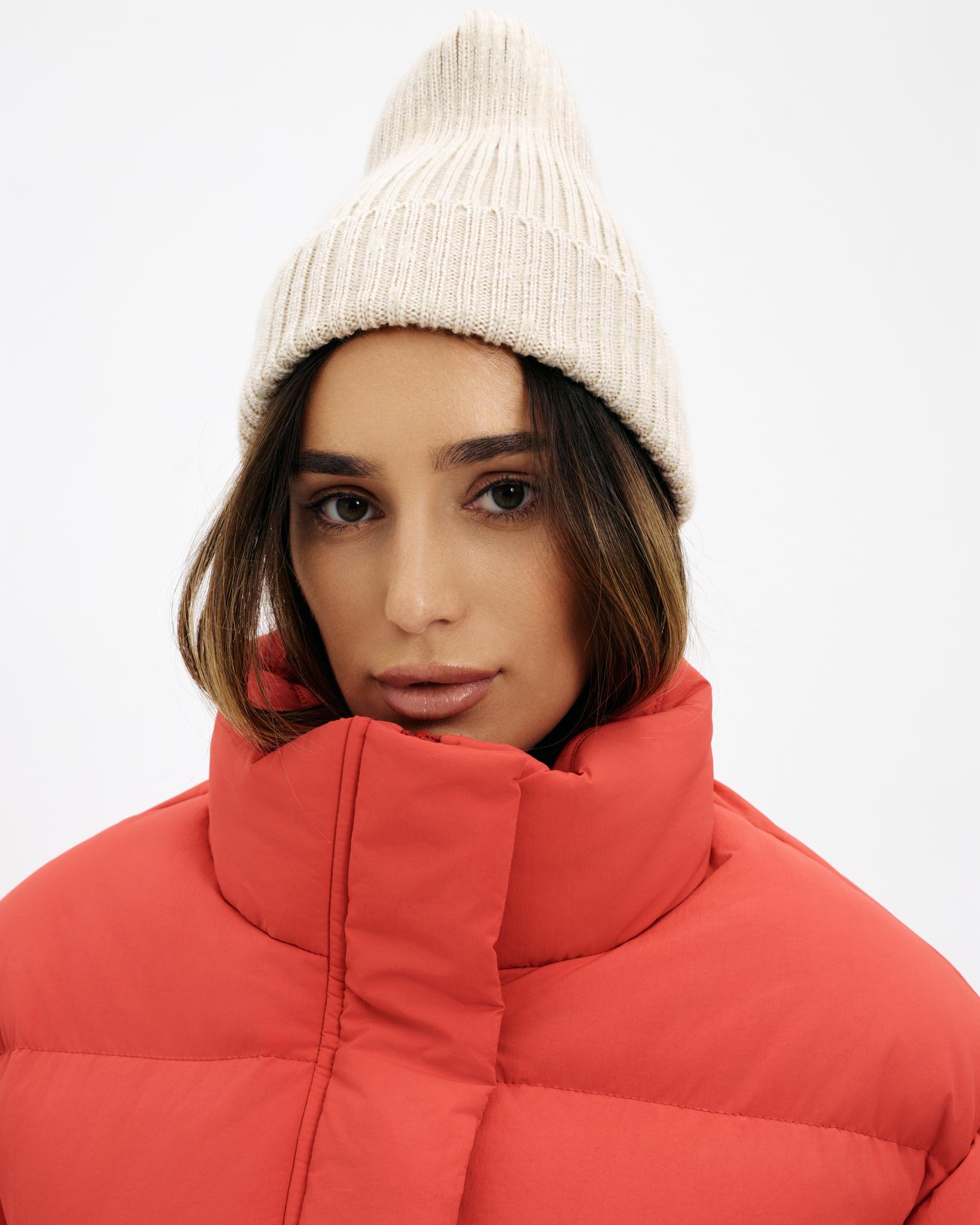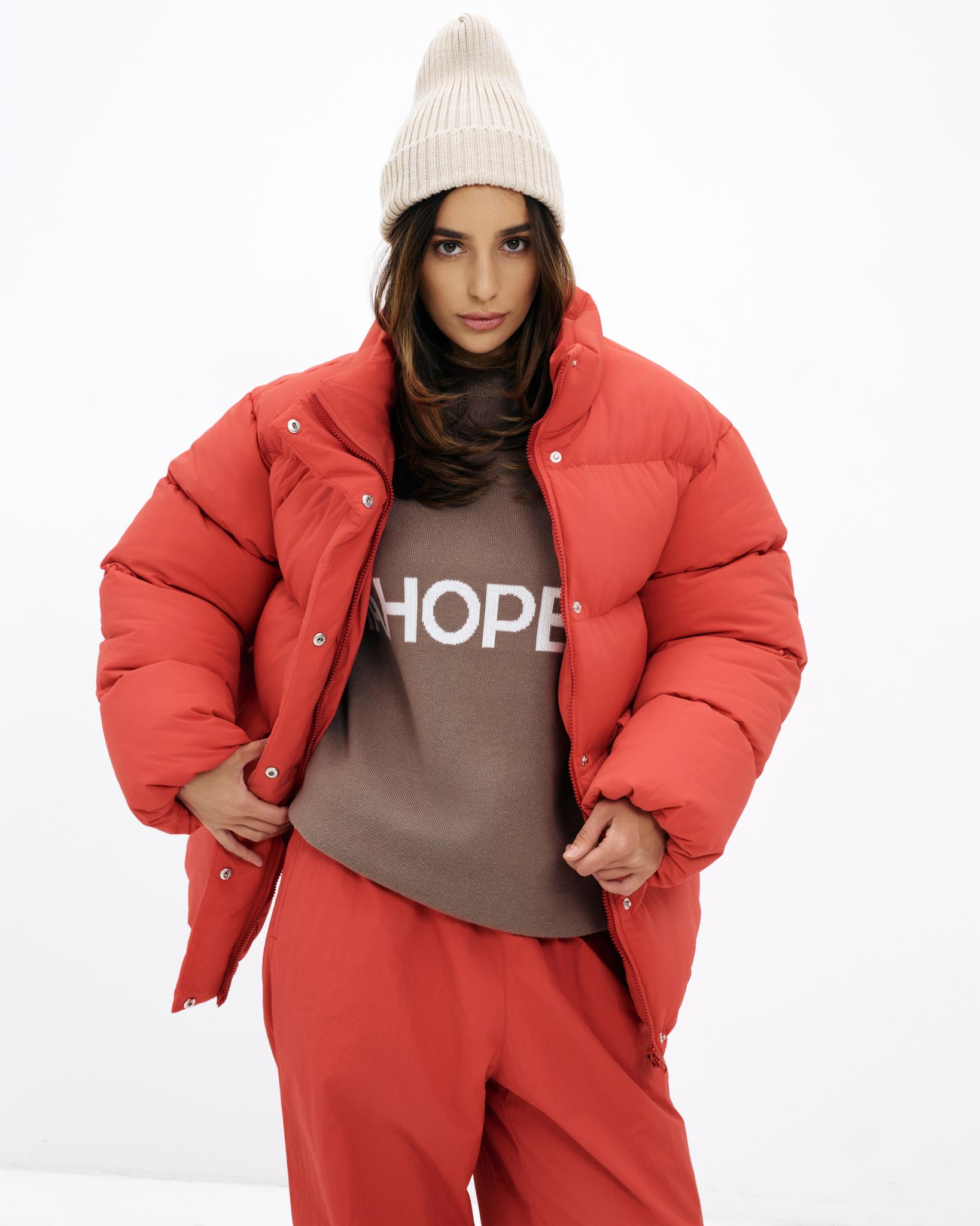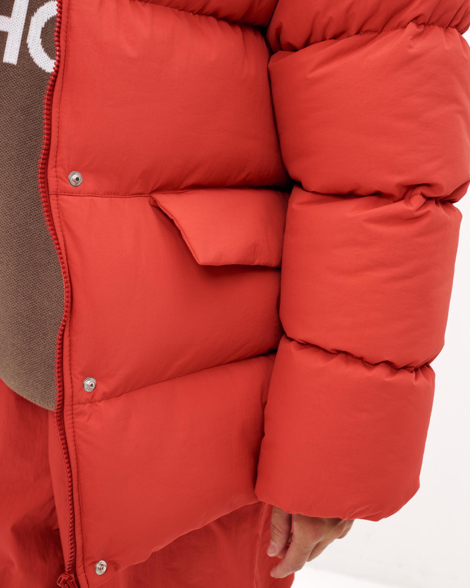 У пуховика невесомый, но в то же время тёплый утеплитель (комбо синтетического лебяжьего пуха и shelter).