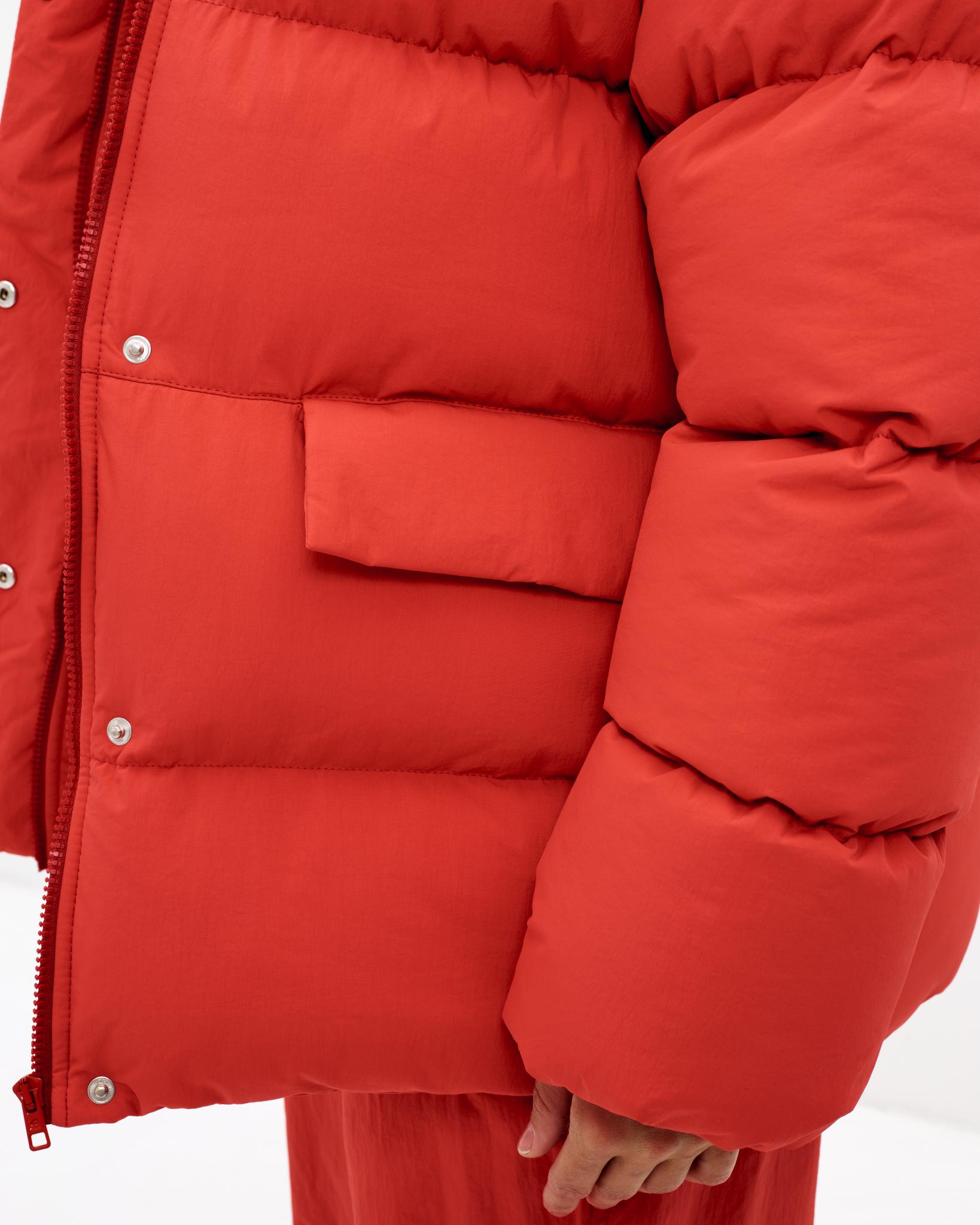 Базовый короткий пуховик oversize кроя с водоотталкивающей мембраной и защитой от ветра.  Детали: съемный капюшон на молнии; кулиска по периметру; два глубоких внешних кармана, дополнительно внутренний на молнии. Спущенный плечевой шов, воротник-стойка, ветрозащитная планка на кнопках....